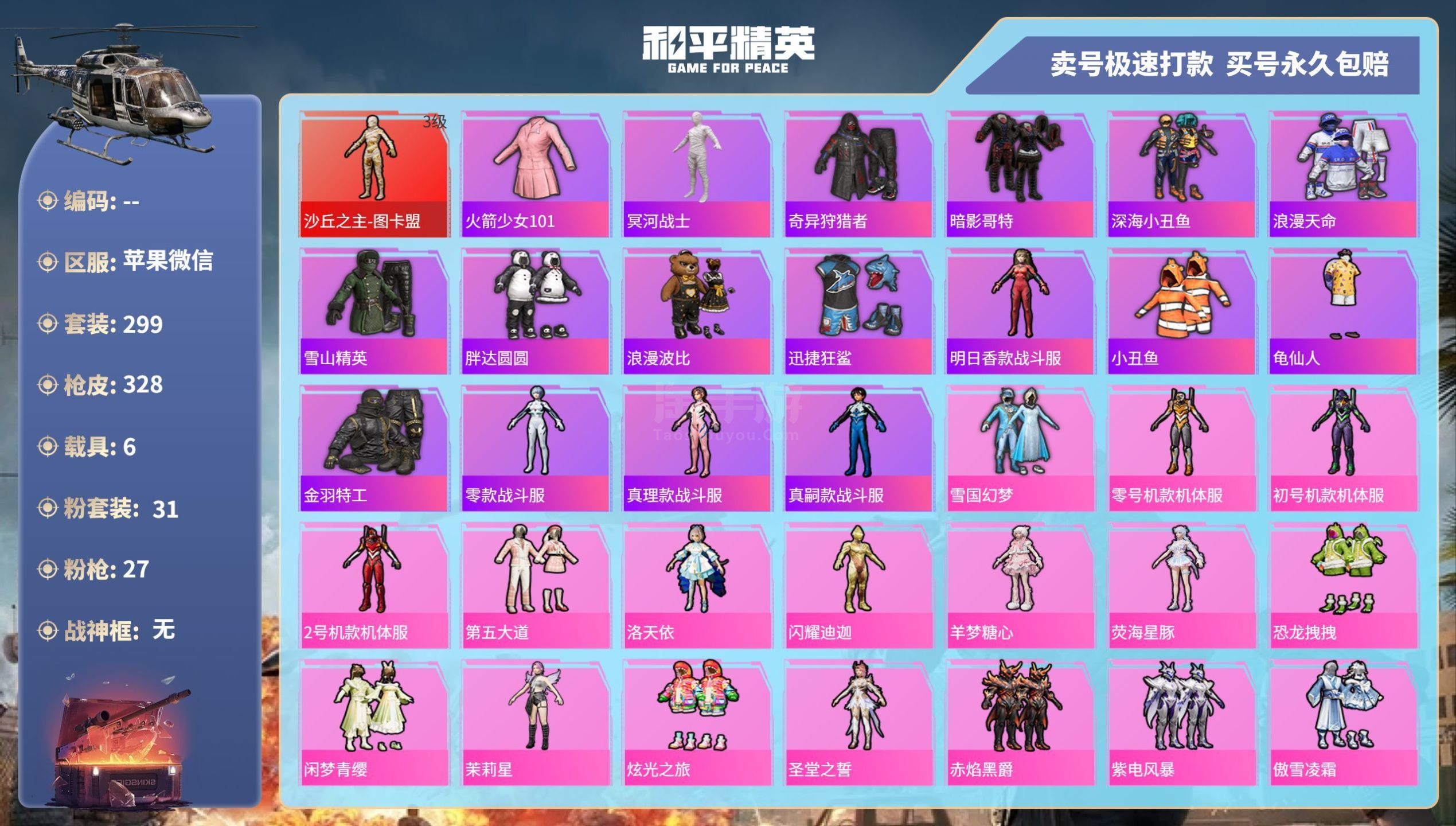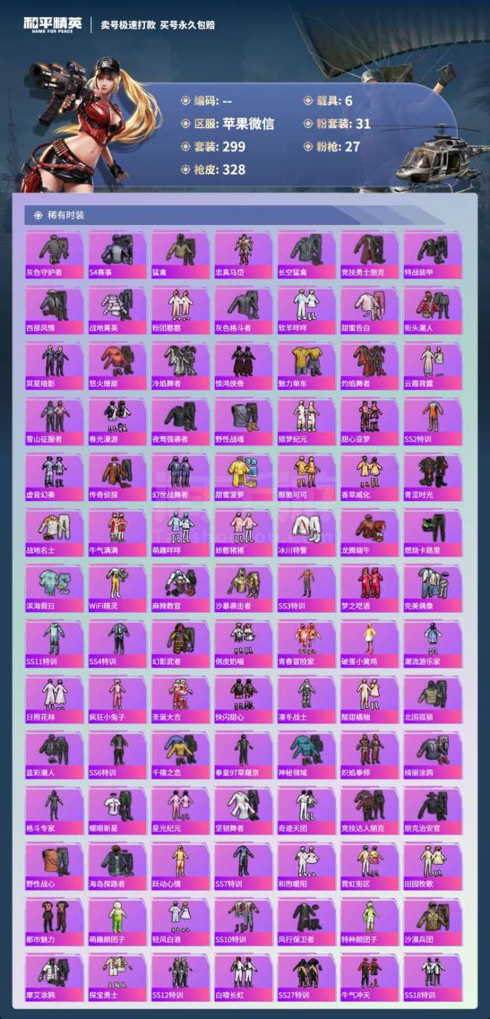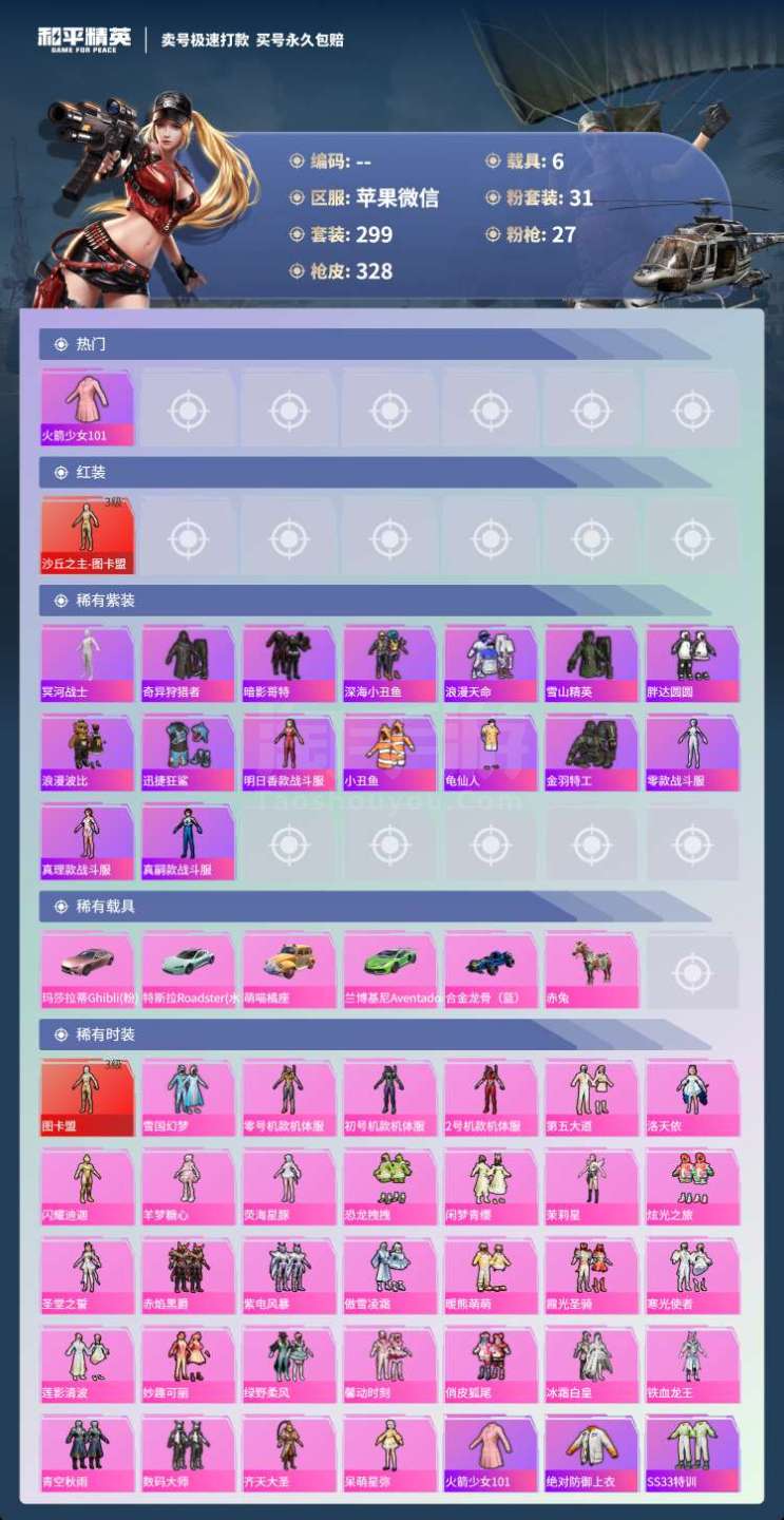 hs45748 苹果微-26王牌印记-31粉装-27特效枪-6载具-145095热力值-299套装