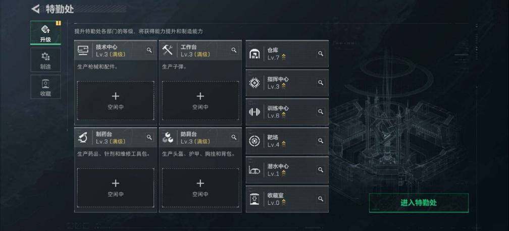 【特勤处】技术中心Lv.3/工作台Lv.3/制药台Lv.3/防具台Lv.3/仓库Lv.7/指挥中心Lv.3/训练中心Lv.6/靶场Lv.4/潜水中心Lv.1/收藏室Lv.0