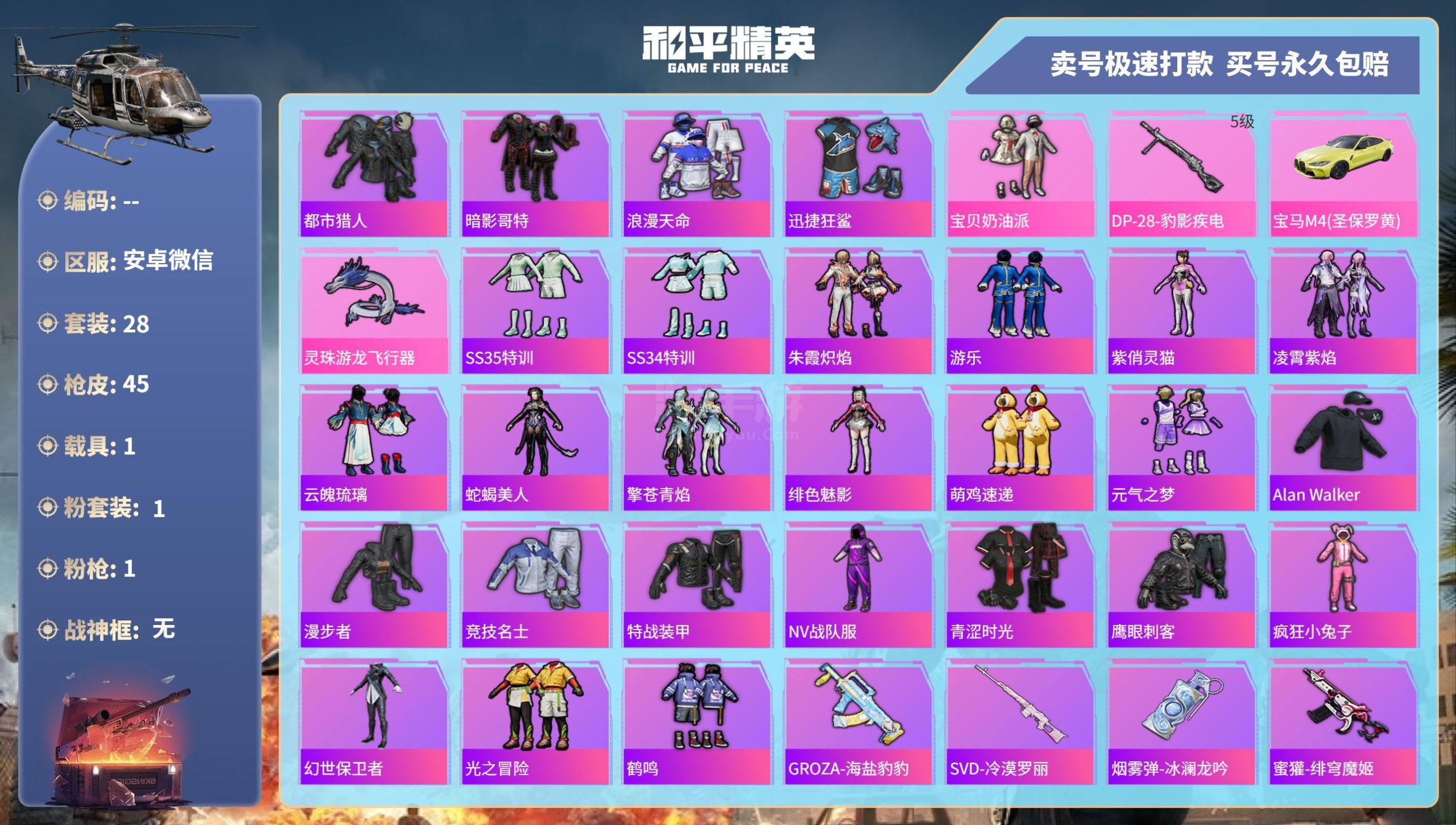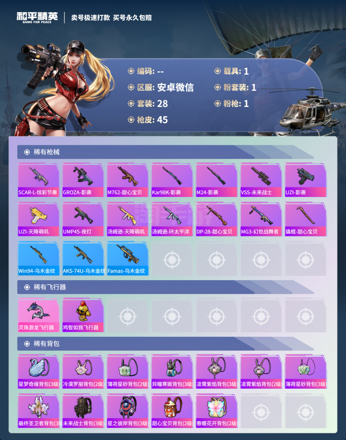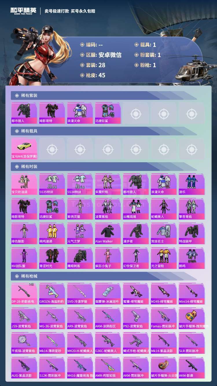 hs45795 安卓微-1王牌印记-1粉装-1特效枪-1载具-11277热力值-28套装-45枪皮