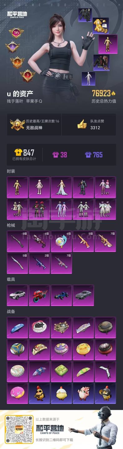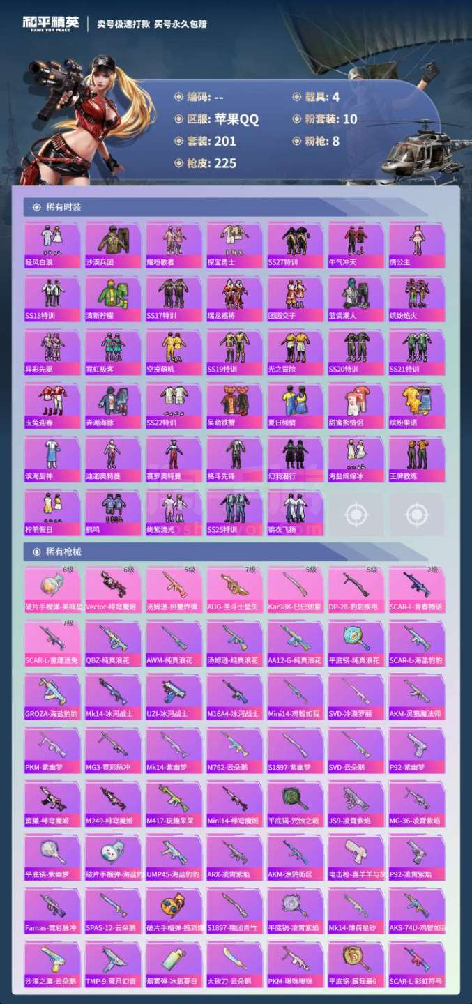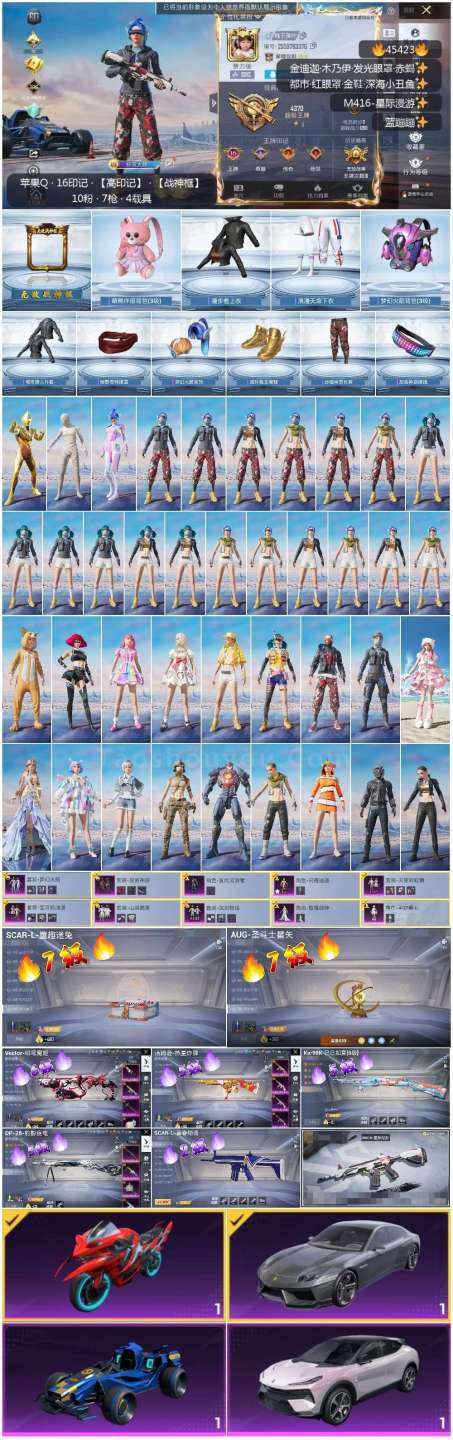 hs45423 苹果手Q-16王牌印记-有战神框-10粉装-8特效枪-4载具-76991热力值-20