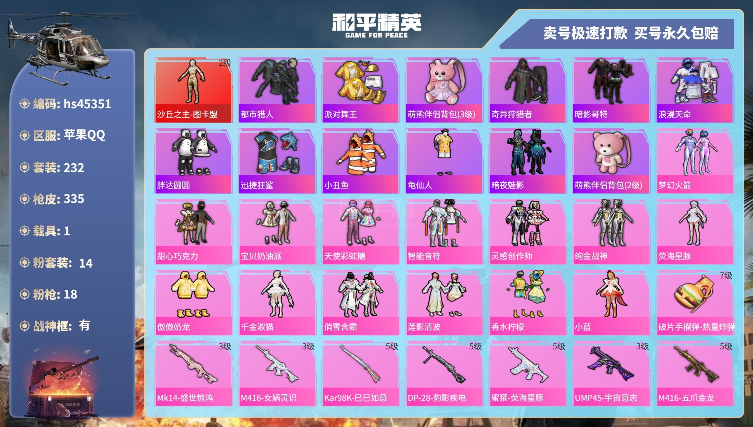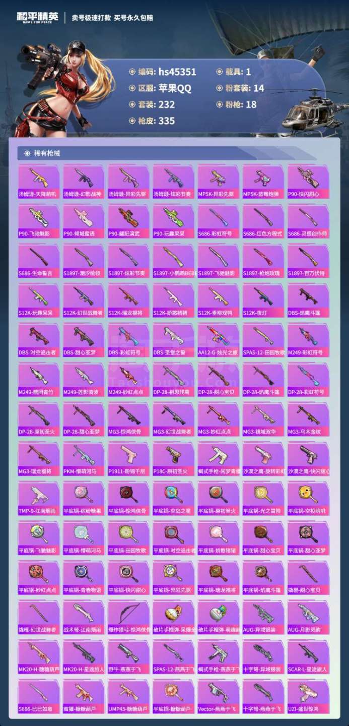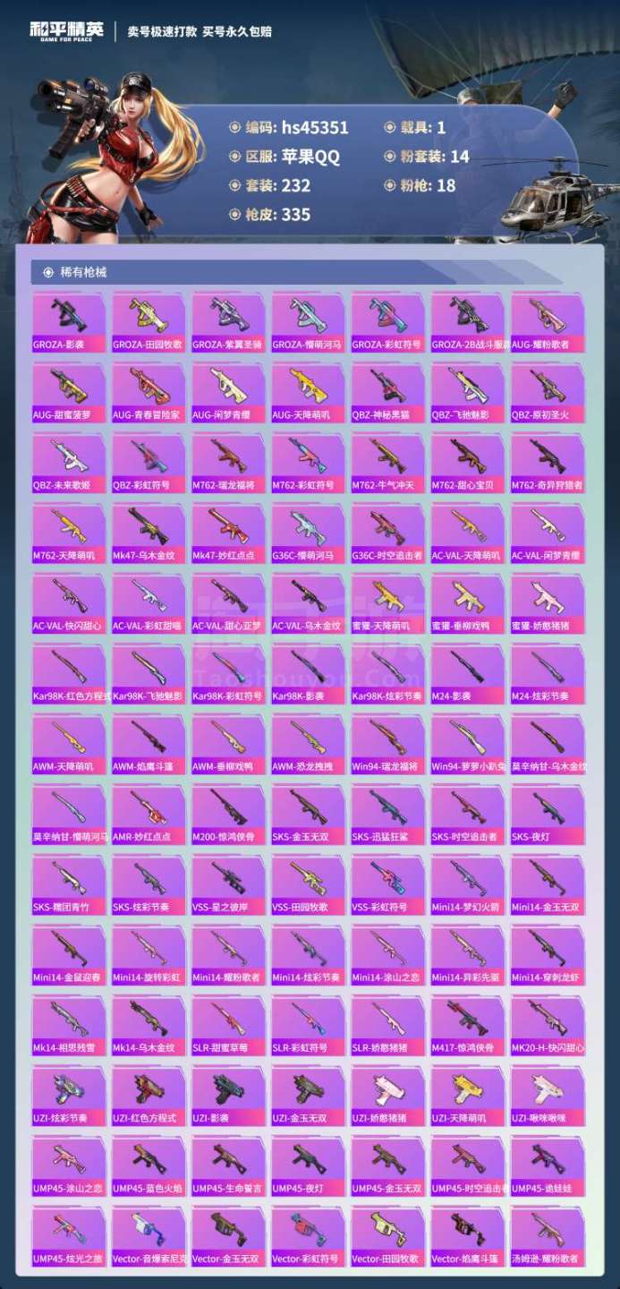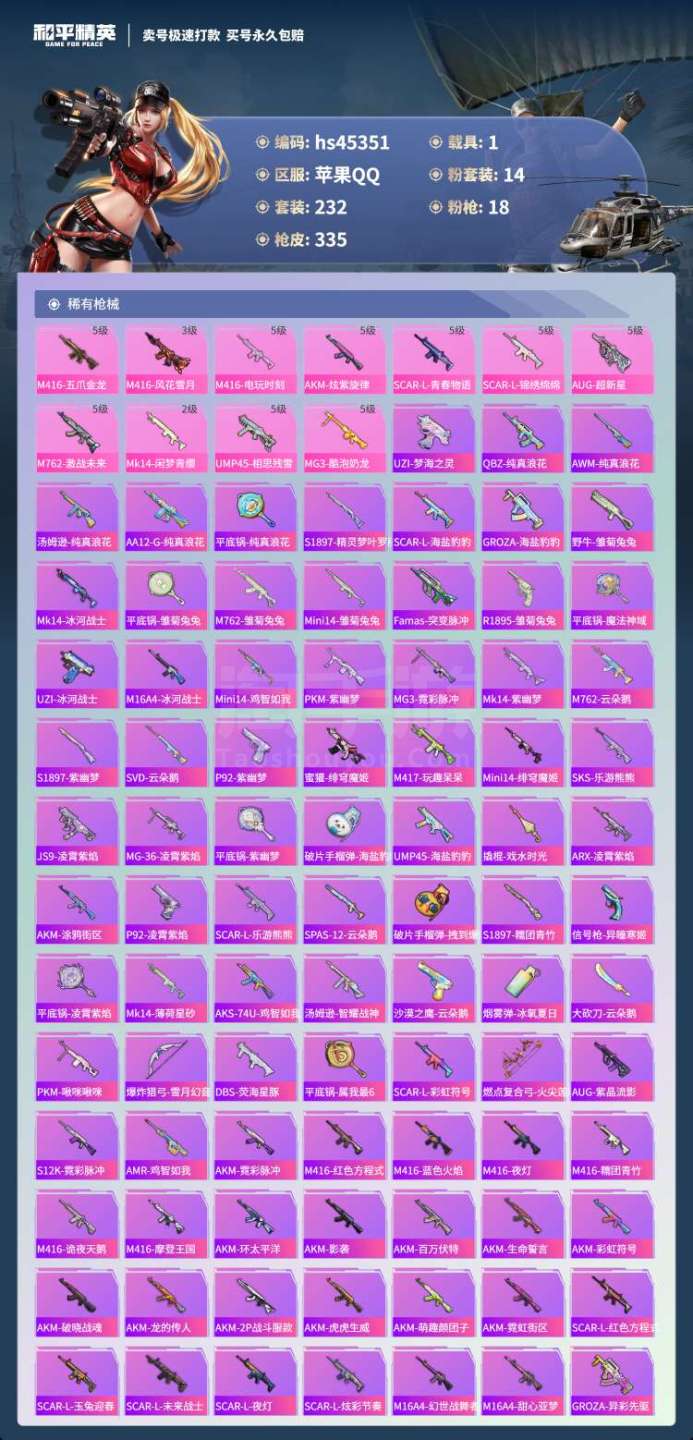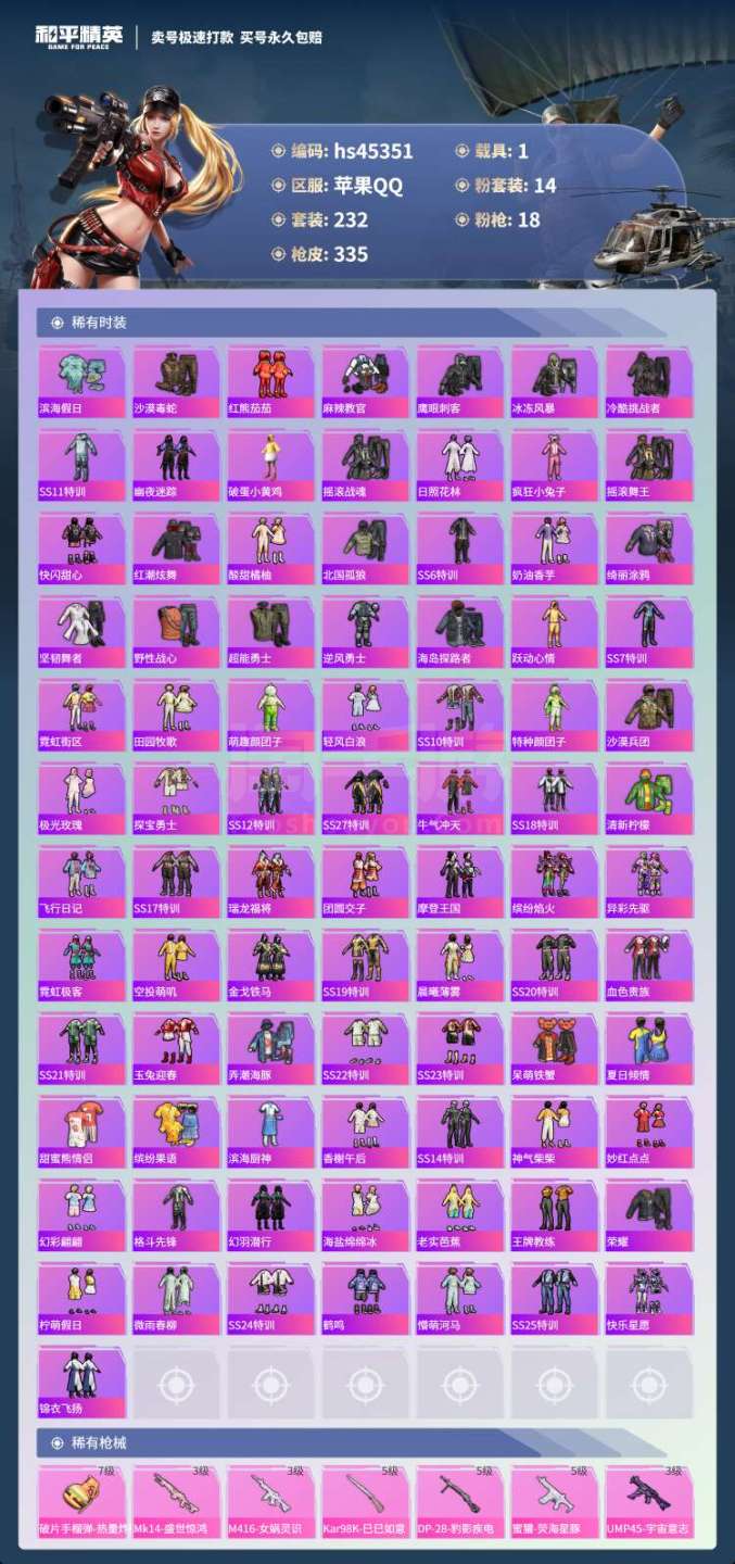 hs45351 苹果手Q-18王牌印记-有战神框-14粉装-18特效枪-1载具-112653热力值-