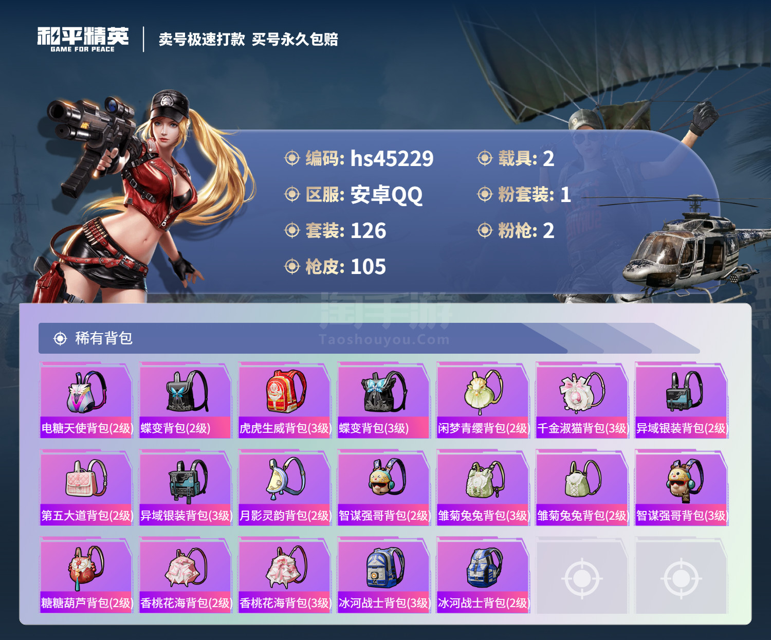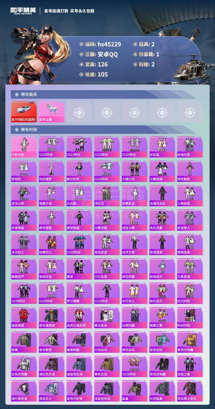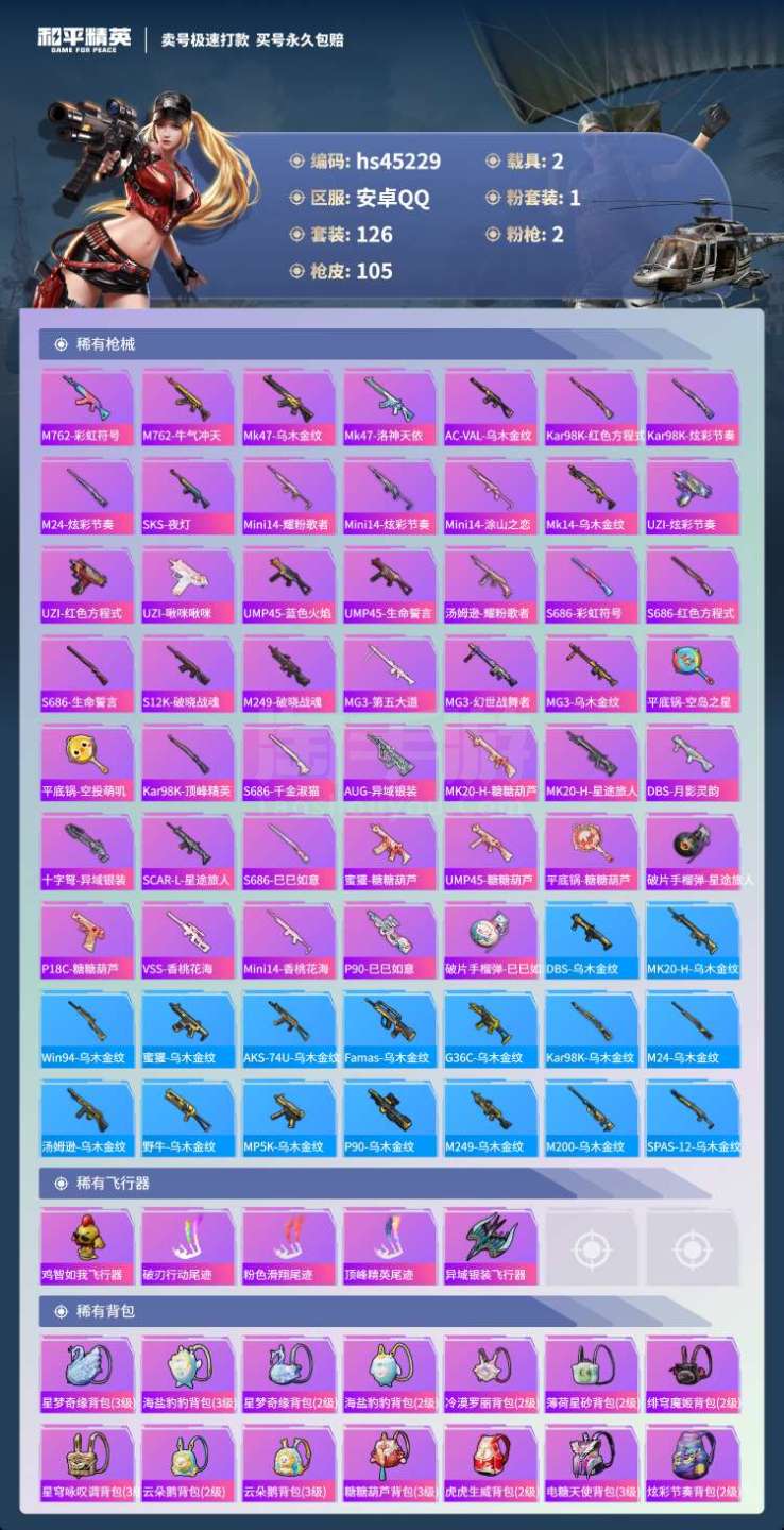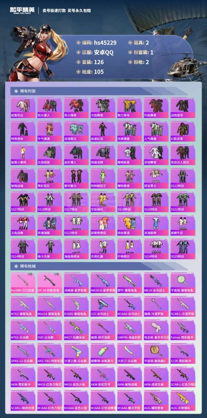 hs45229 安卓手Q-10王牌印记-1粉装-2特效枪-2载具-38620热力值-126套装-10