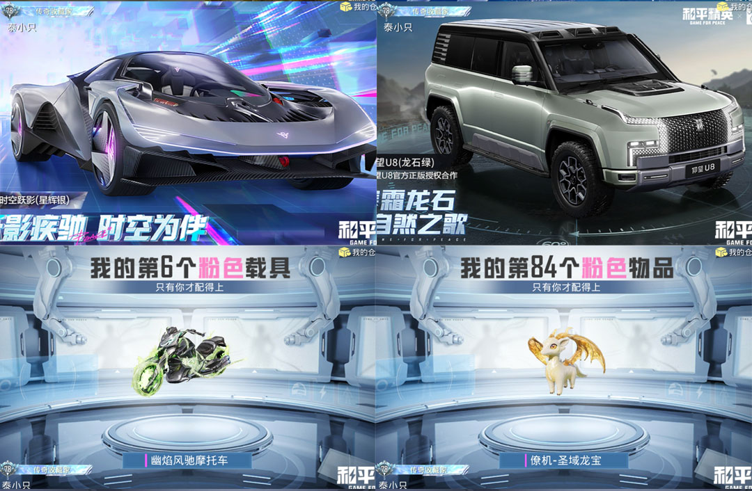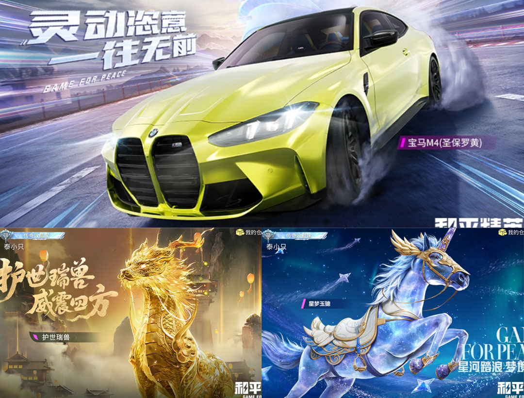 载具6:宝马M4(圣保罗黄),仰望U8(龙石绿),时空跃影(星辉银),幽焰风驰摩托车,,护世瑞兽,星梦玉骢,