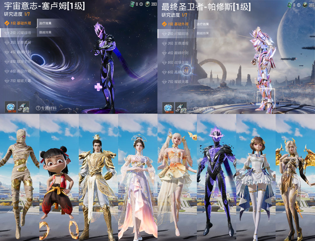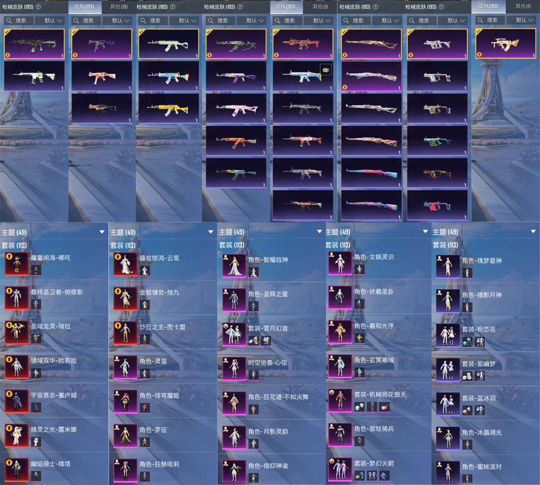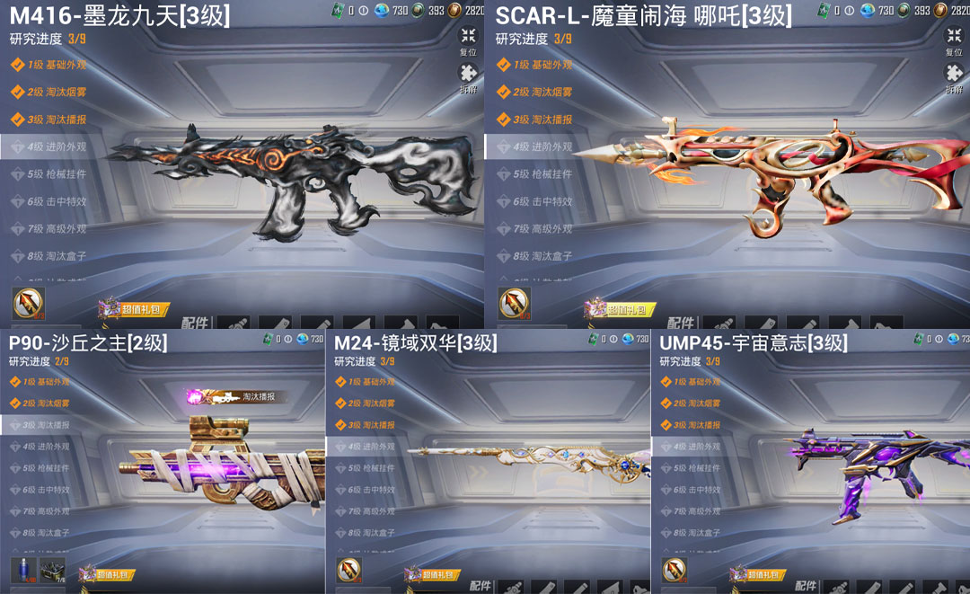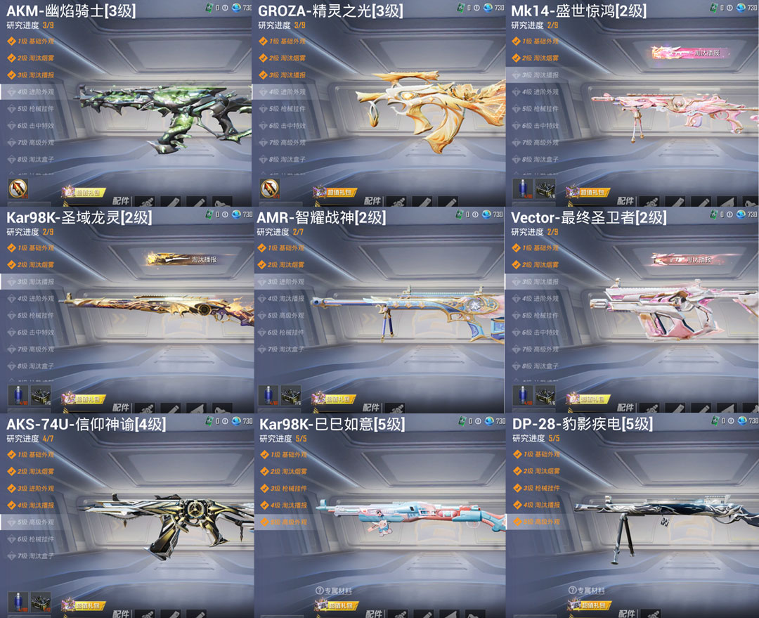 特效枪14:M416-墨龙九天-3级 ,SCAR-L-魔童闹海 哪吒-3级, GROZA-精灵之光-3级, AKM-幽焰骑士-3级, Kar98K-圣域龙灵-2级, Kar98K-巳巳如意-5级, AMR-智耀战神-2级, M24-镜域双华-3级, Mk14-盛世惊鸿-