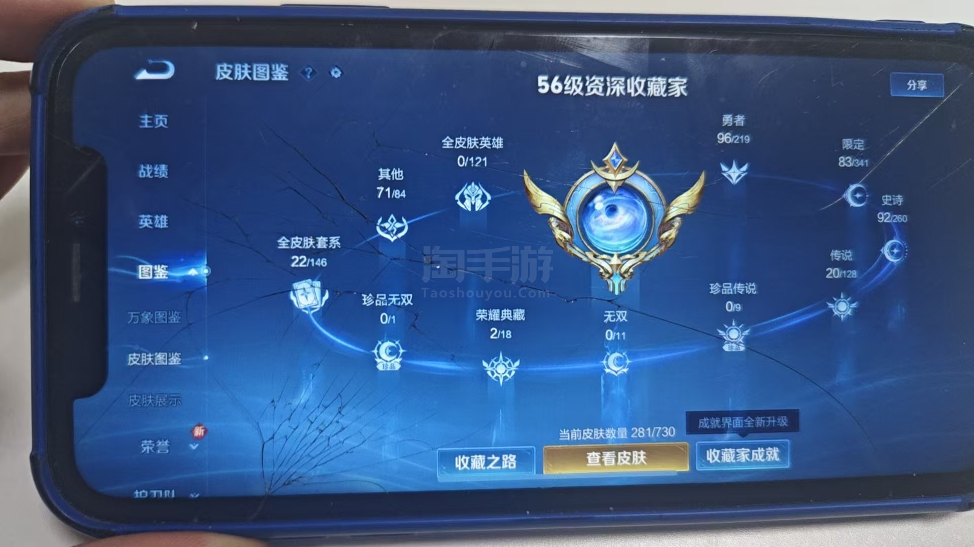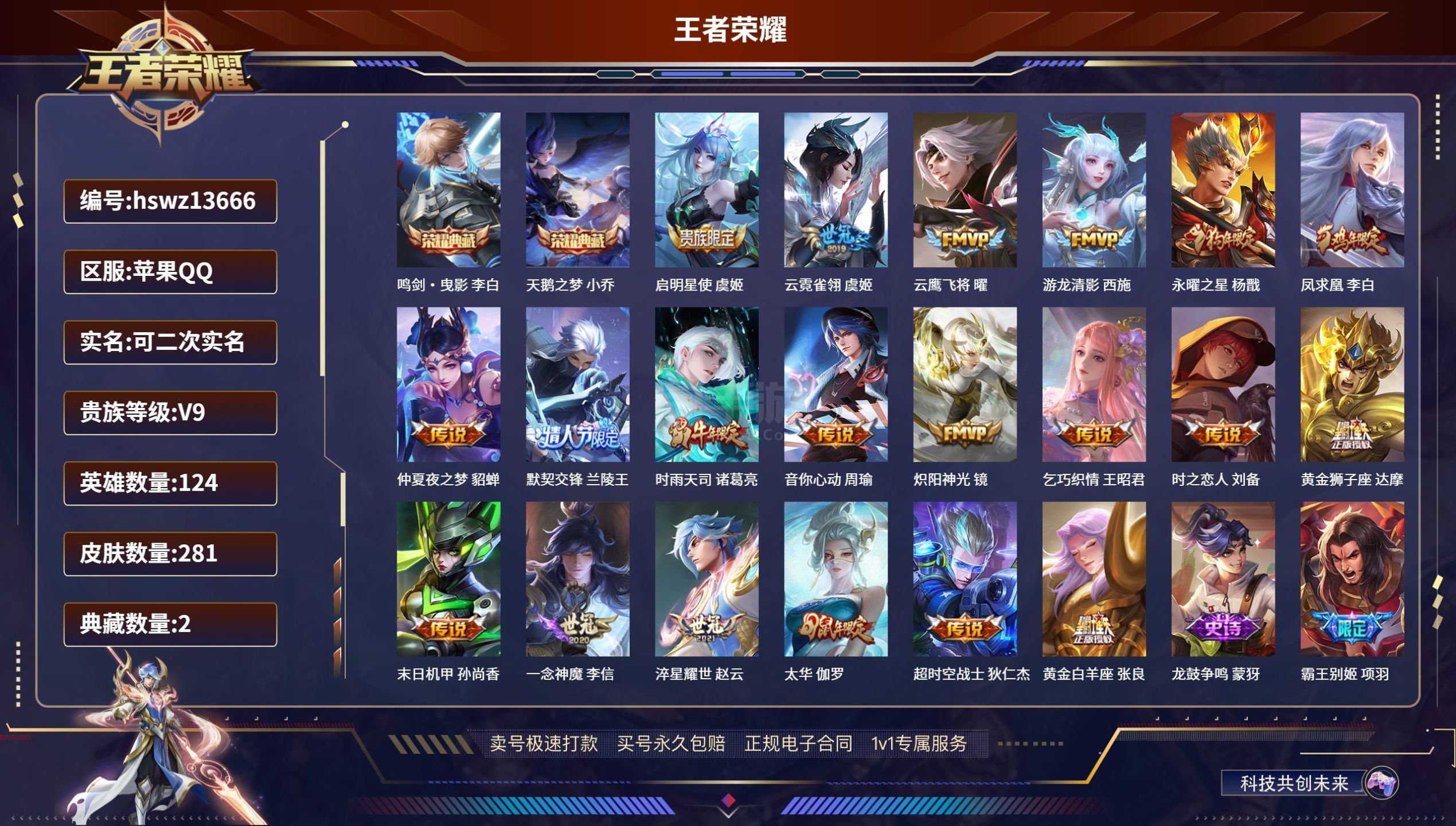 苹果QQ/永恒钻石/281皮肤/124英雄/2典藏/0珍品无双/0无双/0珍品传说/20传说/92史