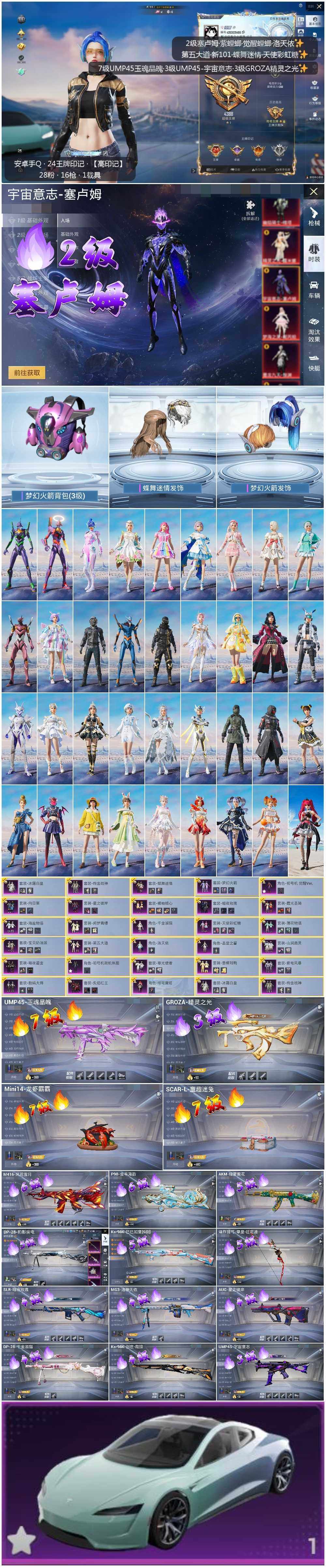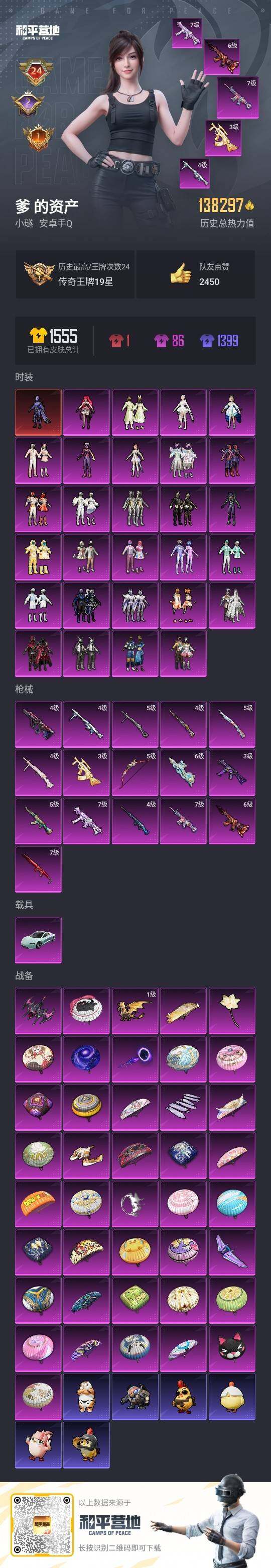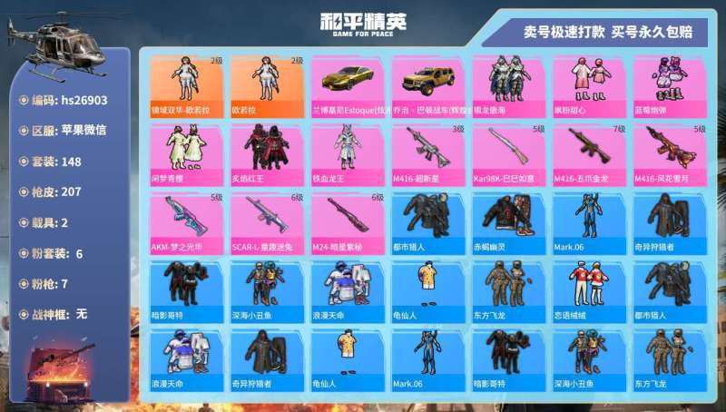 素材身法号/地铁满天赋【特价急出/详情看图】:安卓 手Q-1神装-28粉装-16特效枪-1载具-8粉色飞行器-13.8w热力值-24王牌印记-281套装-418枪皮【红色神装等级】:宇宙意志-塞卢姆(二级)【热门品类】:粉装-梦幻火箭,套装-奇异狩猎者,角色-军刀雅典娜,套装-金羽特工,套装-龟仙人,套装-潮萌小黄鸭,套装-浪漫波比,角色-8号机,角色-Mark.06,小恶魔头饰【粉色载具】:特