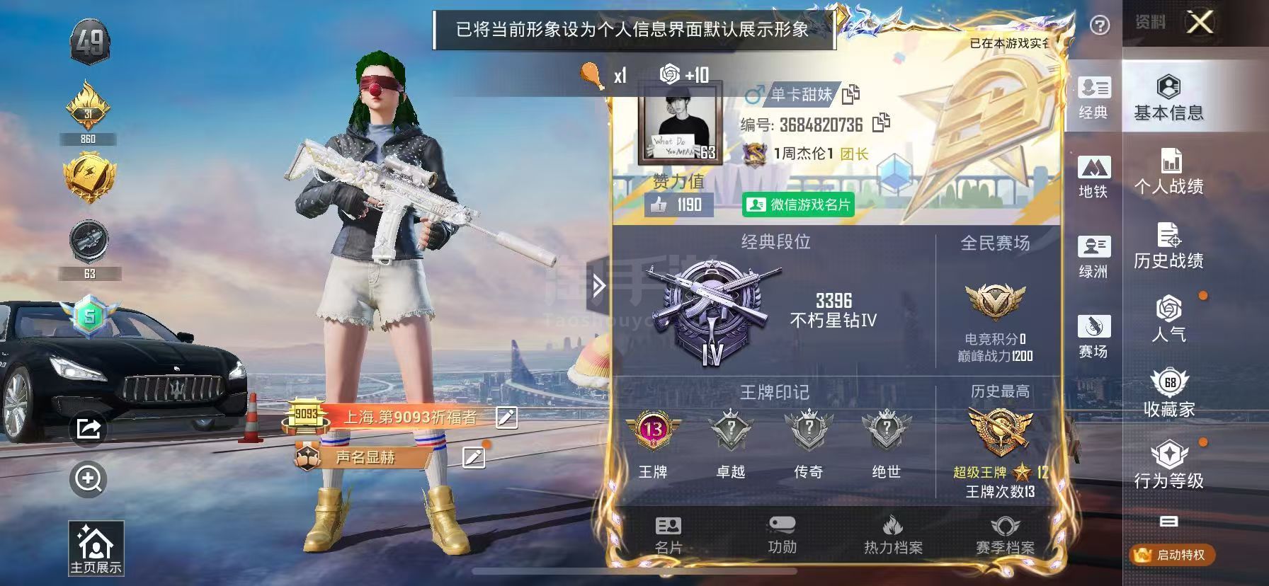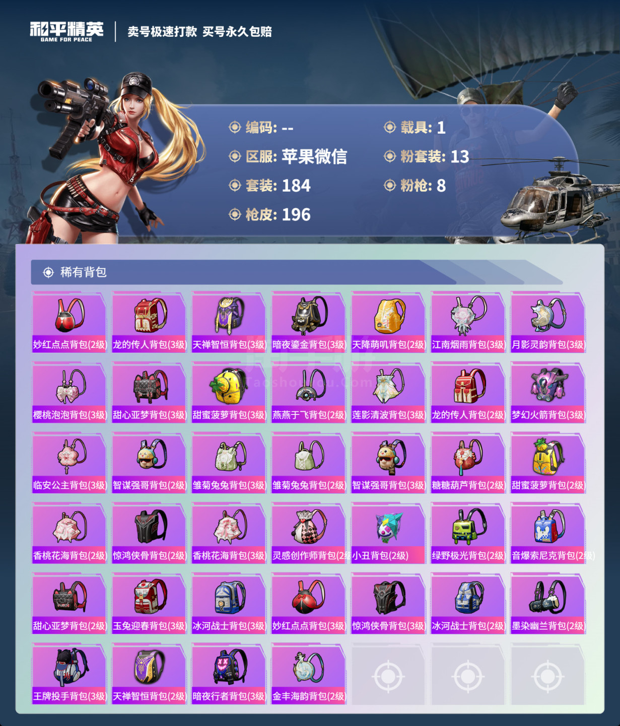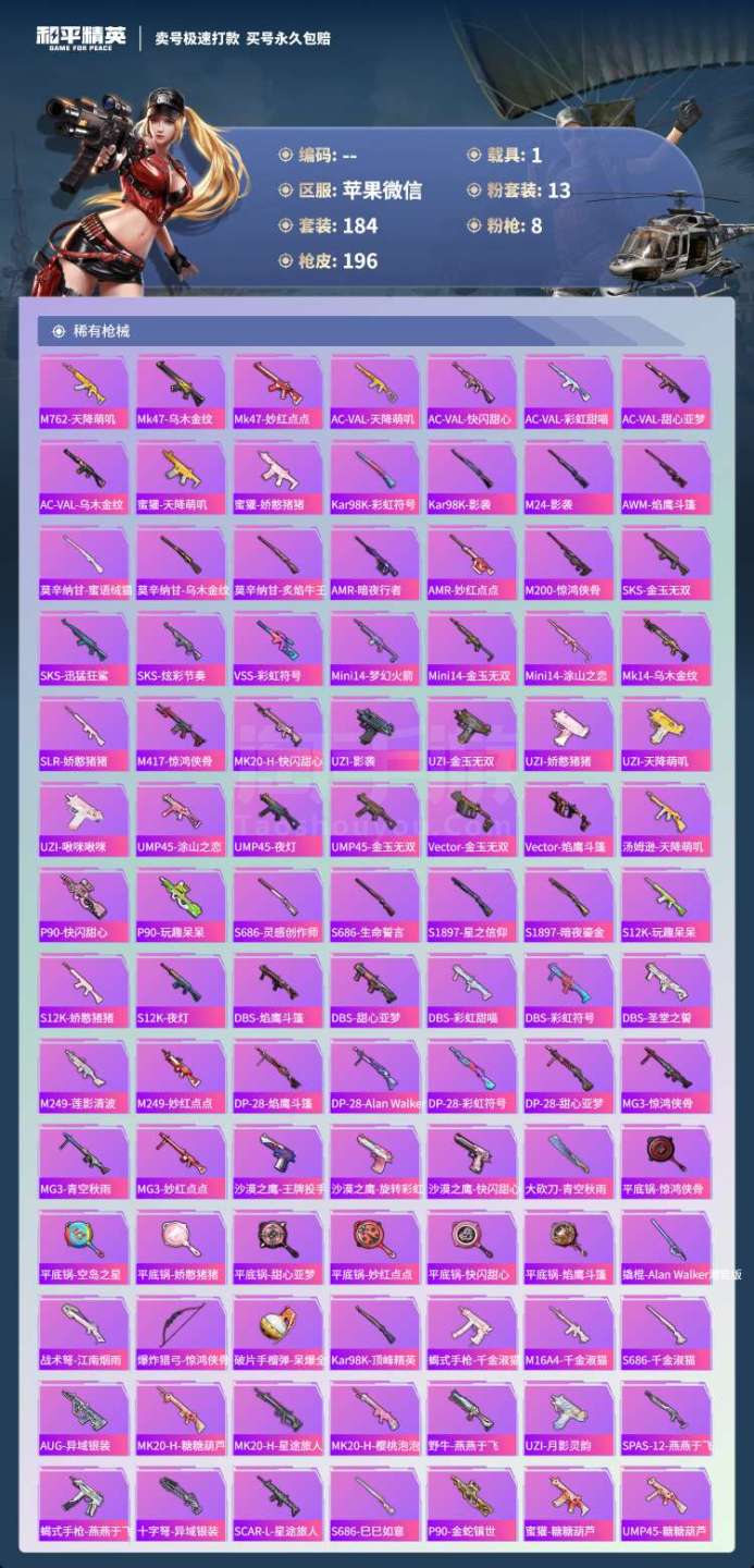 hs45879 苹果微-13王牌印记-13粉装-8特效枪-1载具-70384热力值-184套装-1