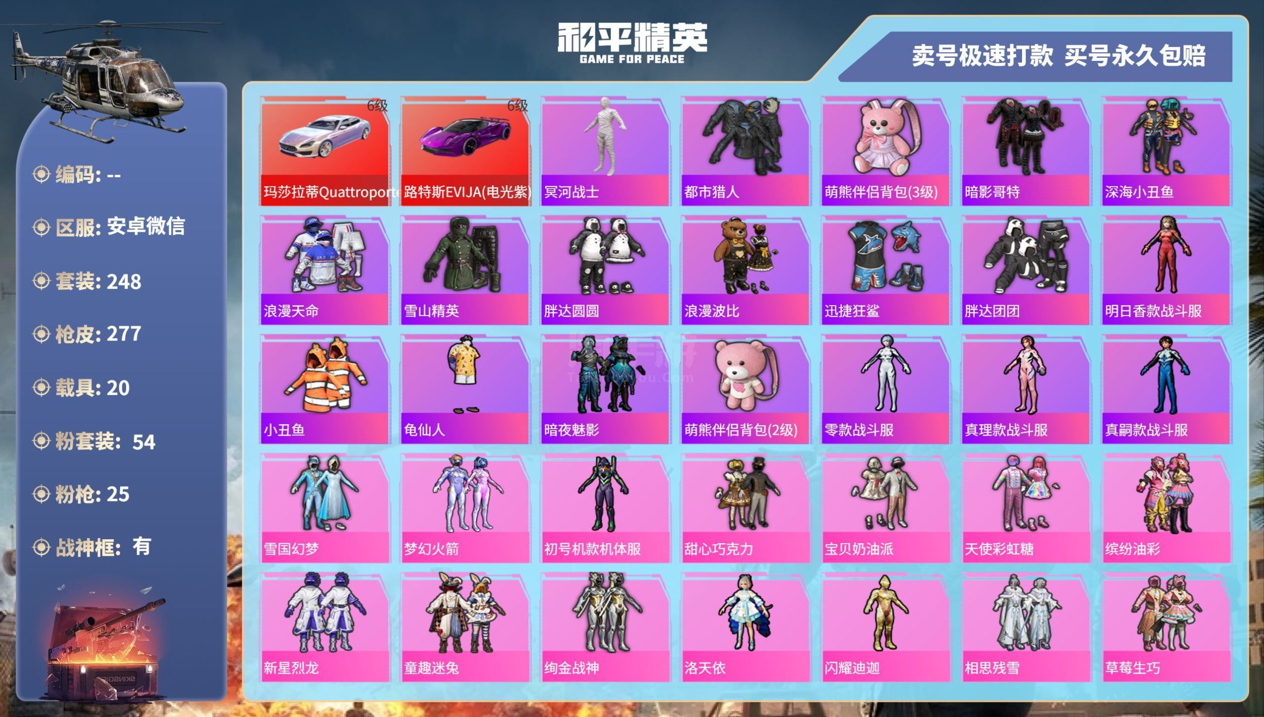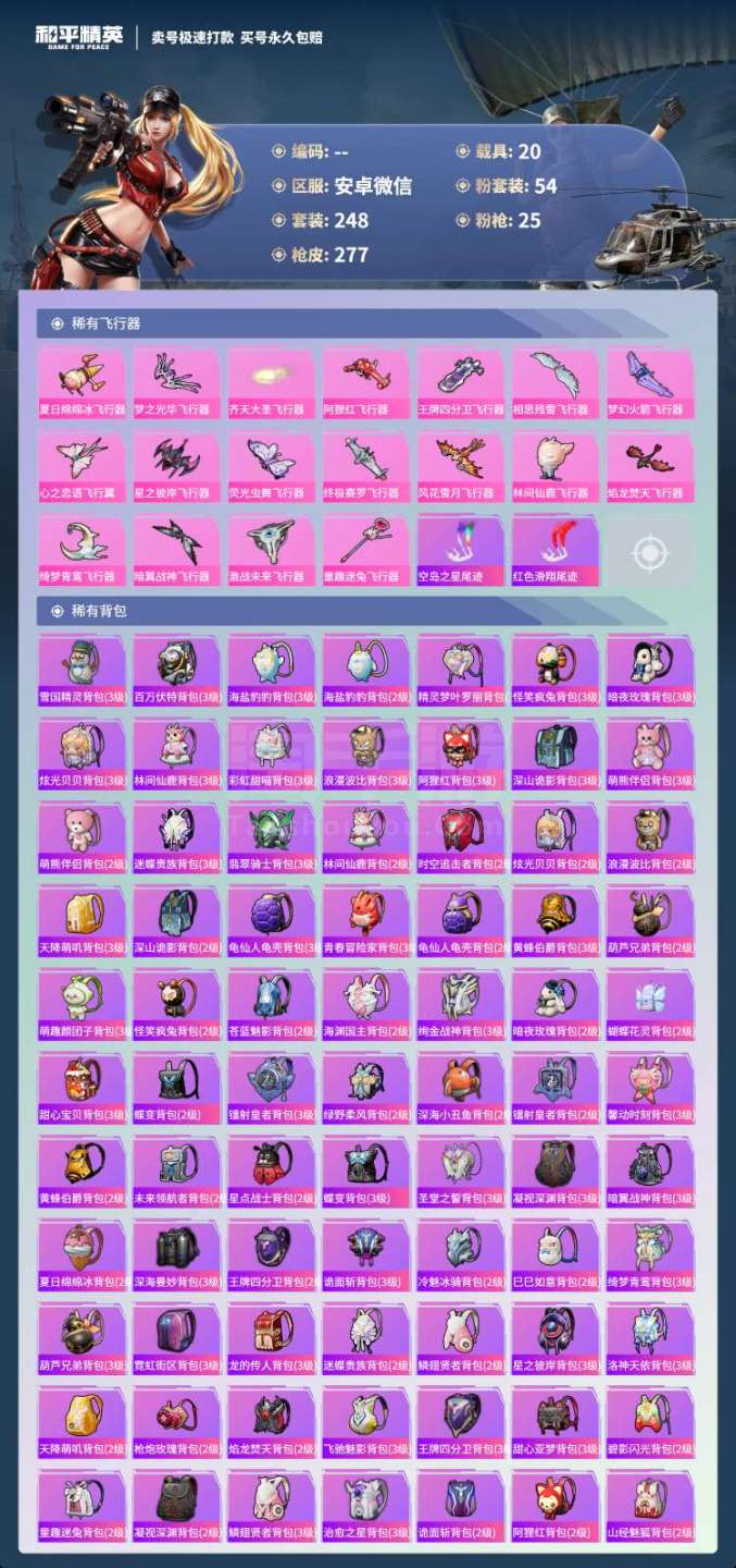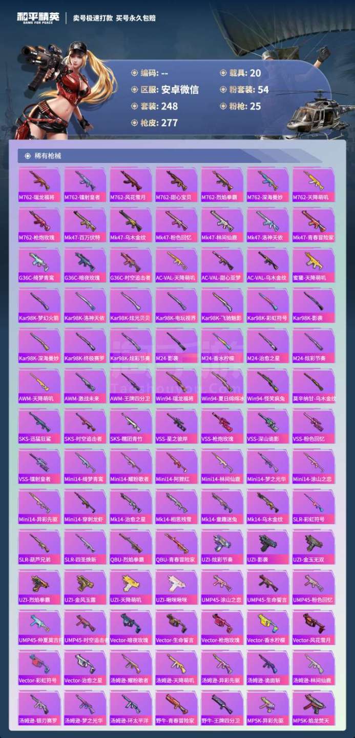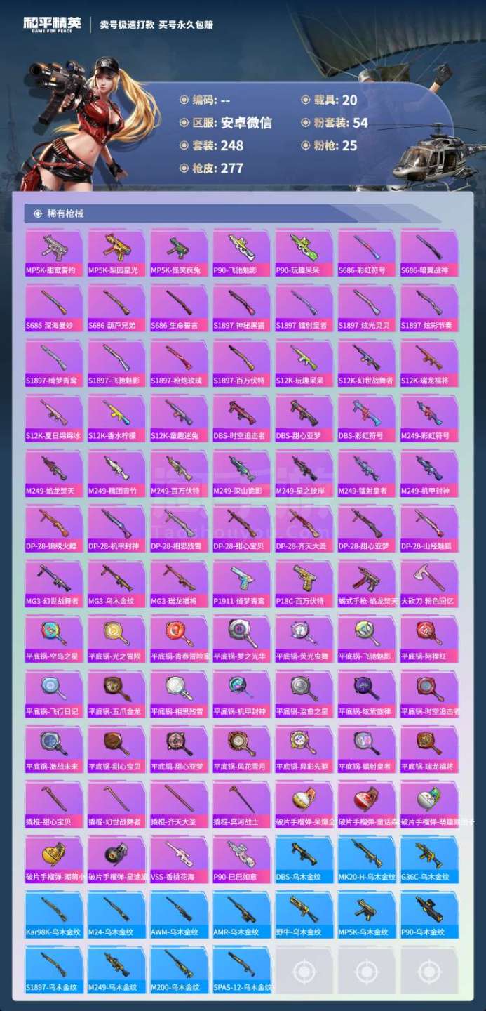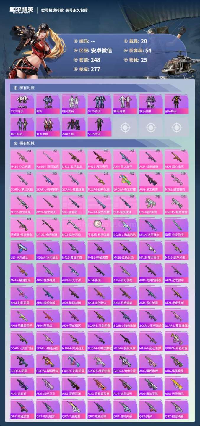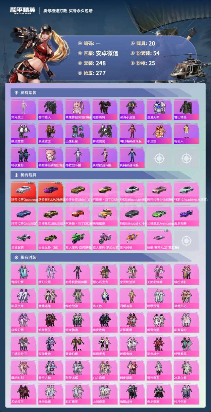 和平精英【安卓微信】hs45919 安卓v-7王牌印记-有战神框-54粉装-25特效枪-20载具-186204热力值-