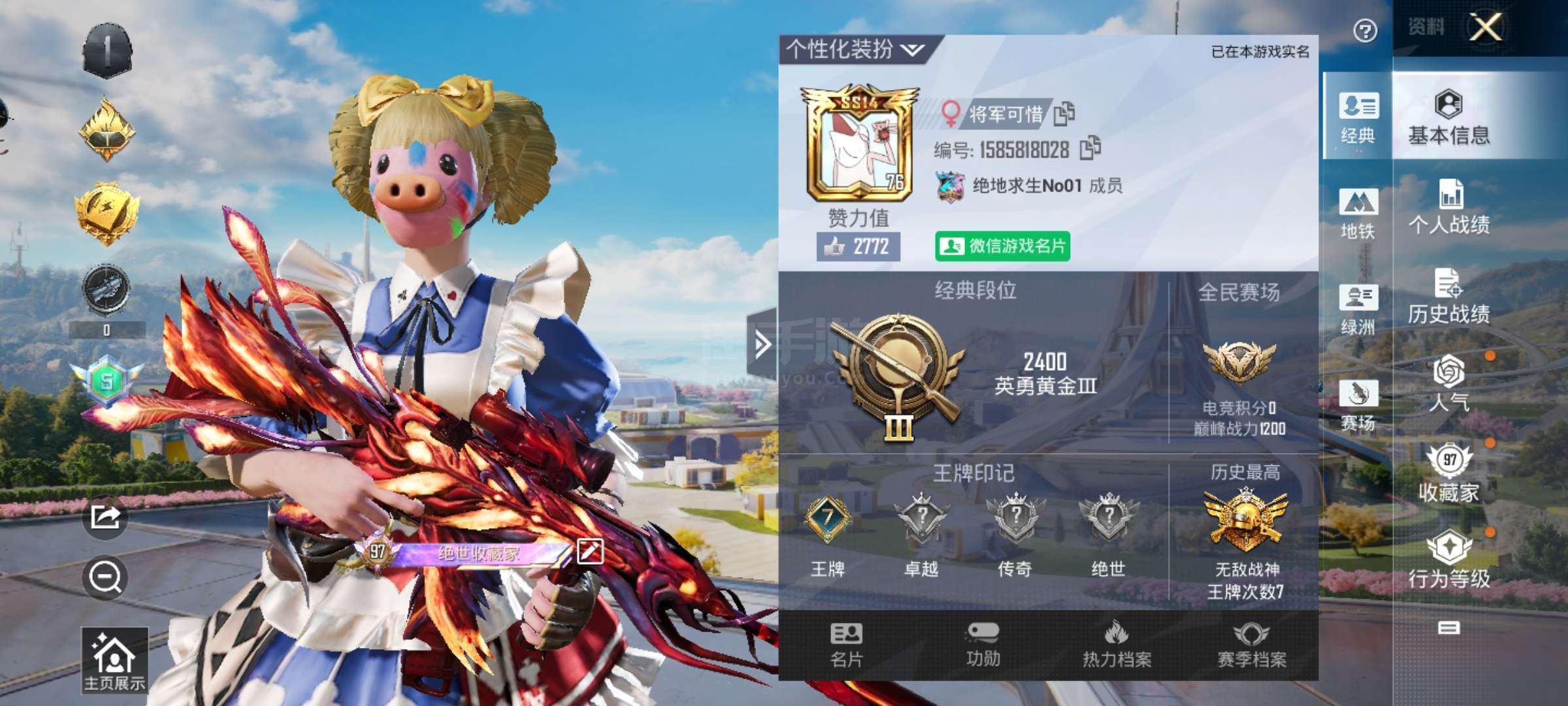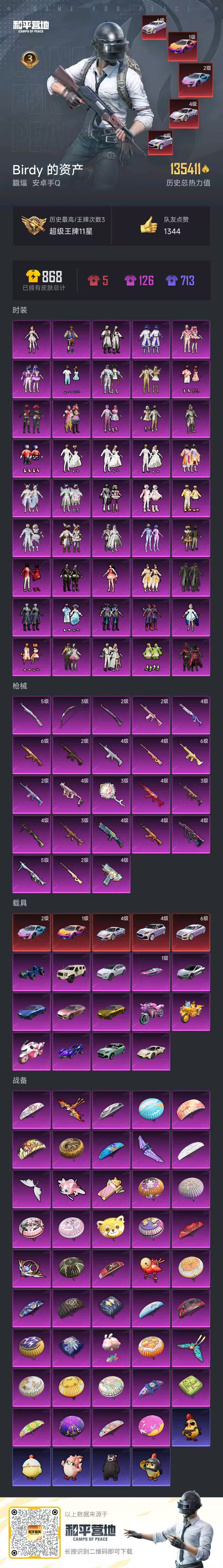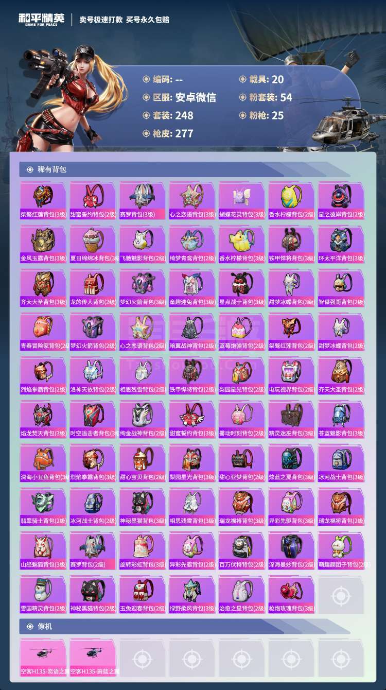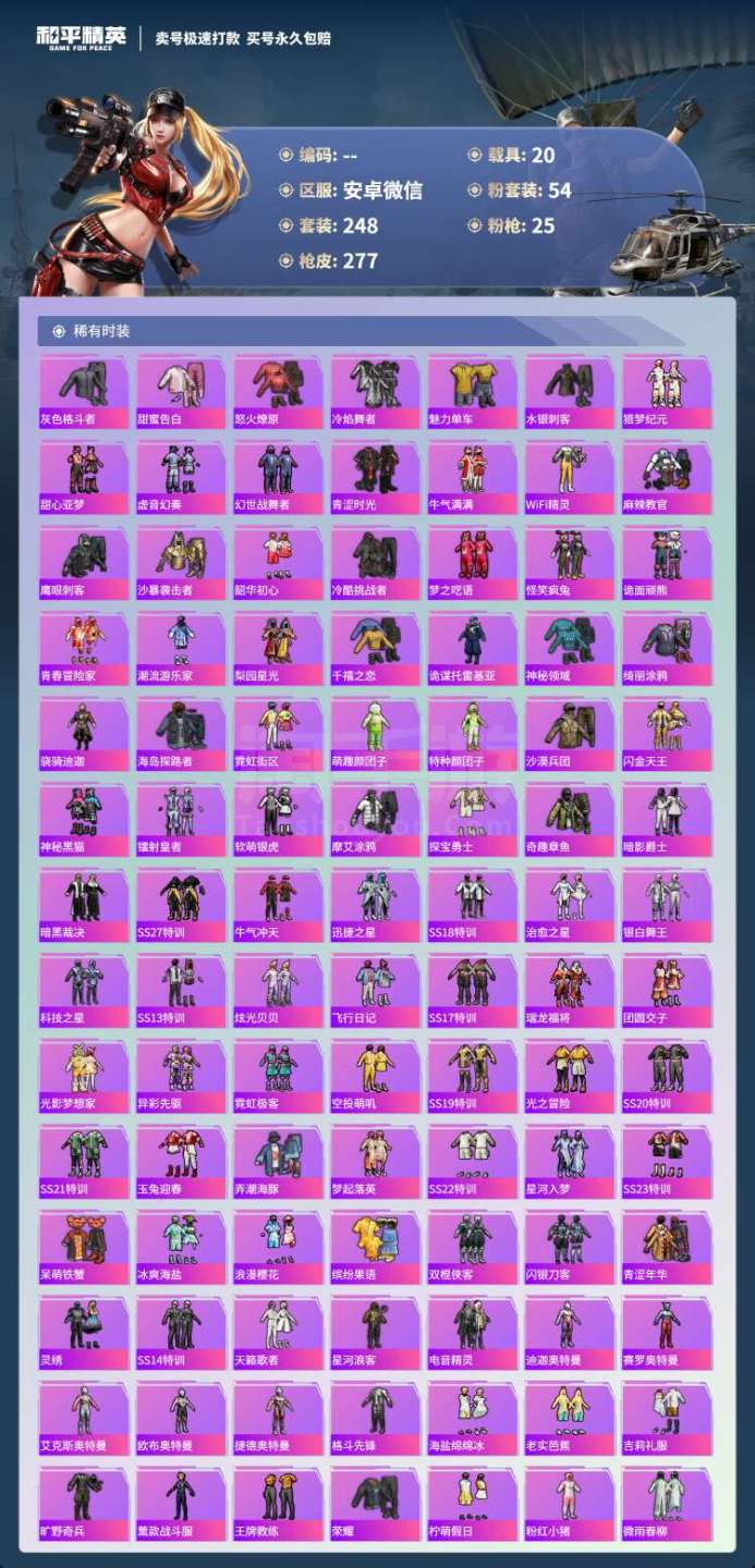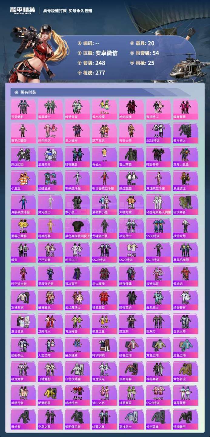 和平精英【安卓微信】hs45919 安卓v-7王牌印记-有战神框-54粉装-25特效枪-20载具-186204热力值-