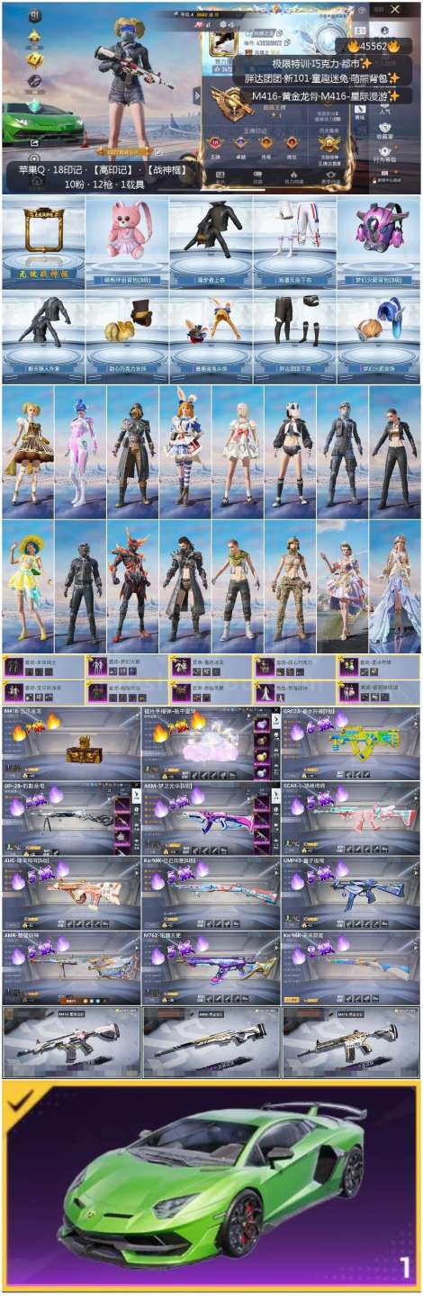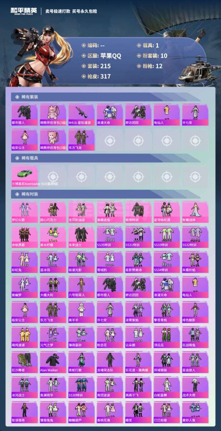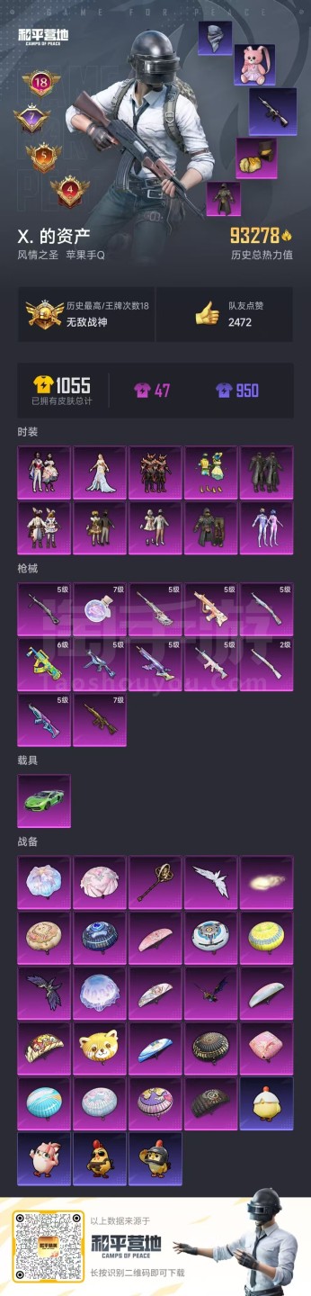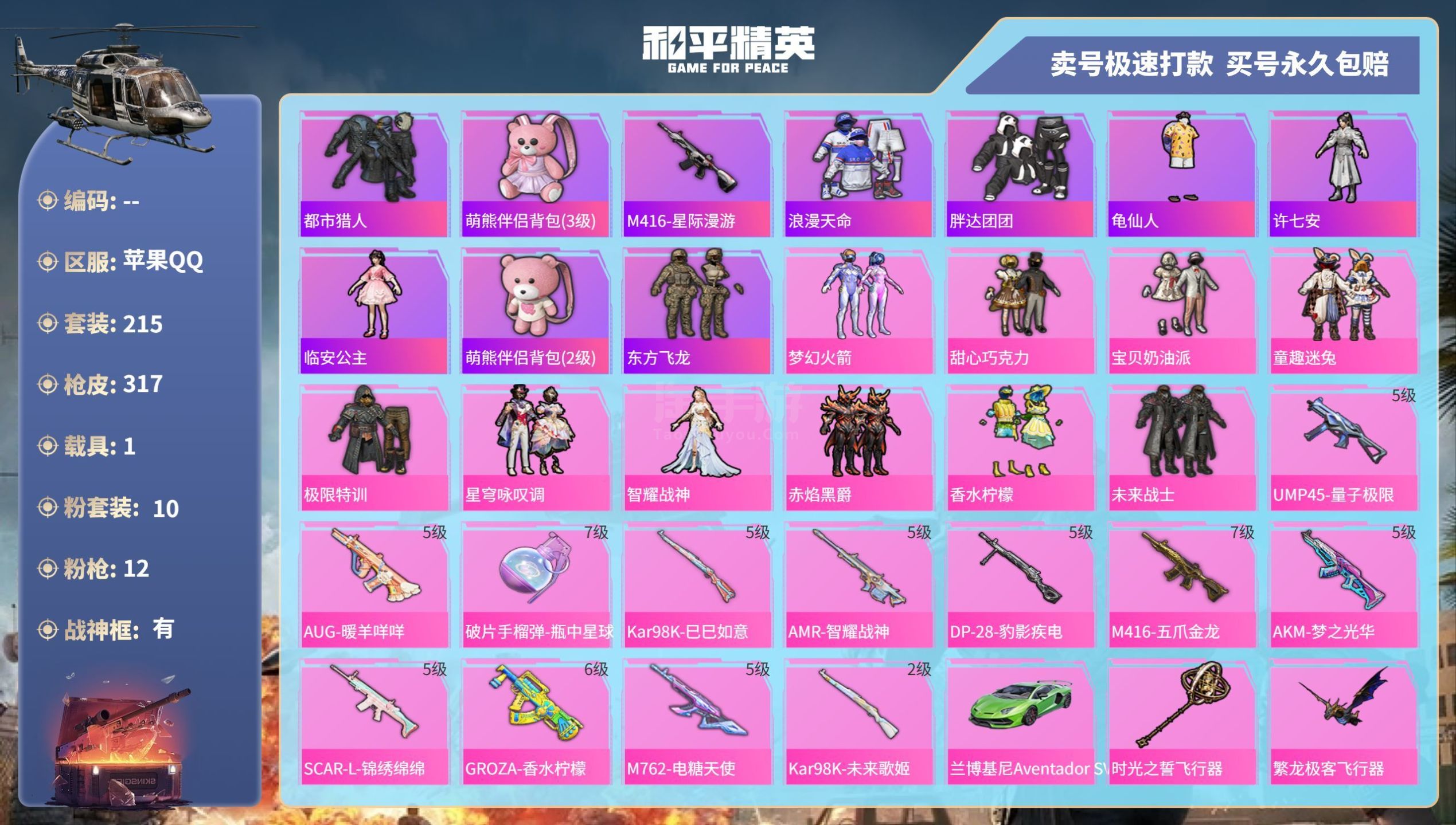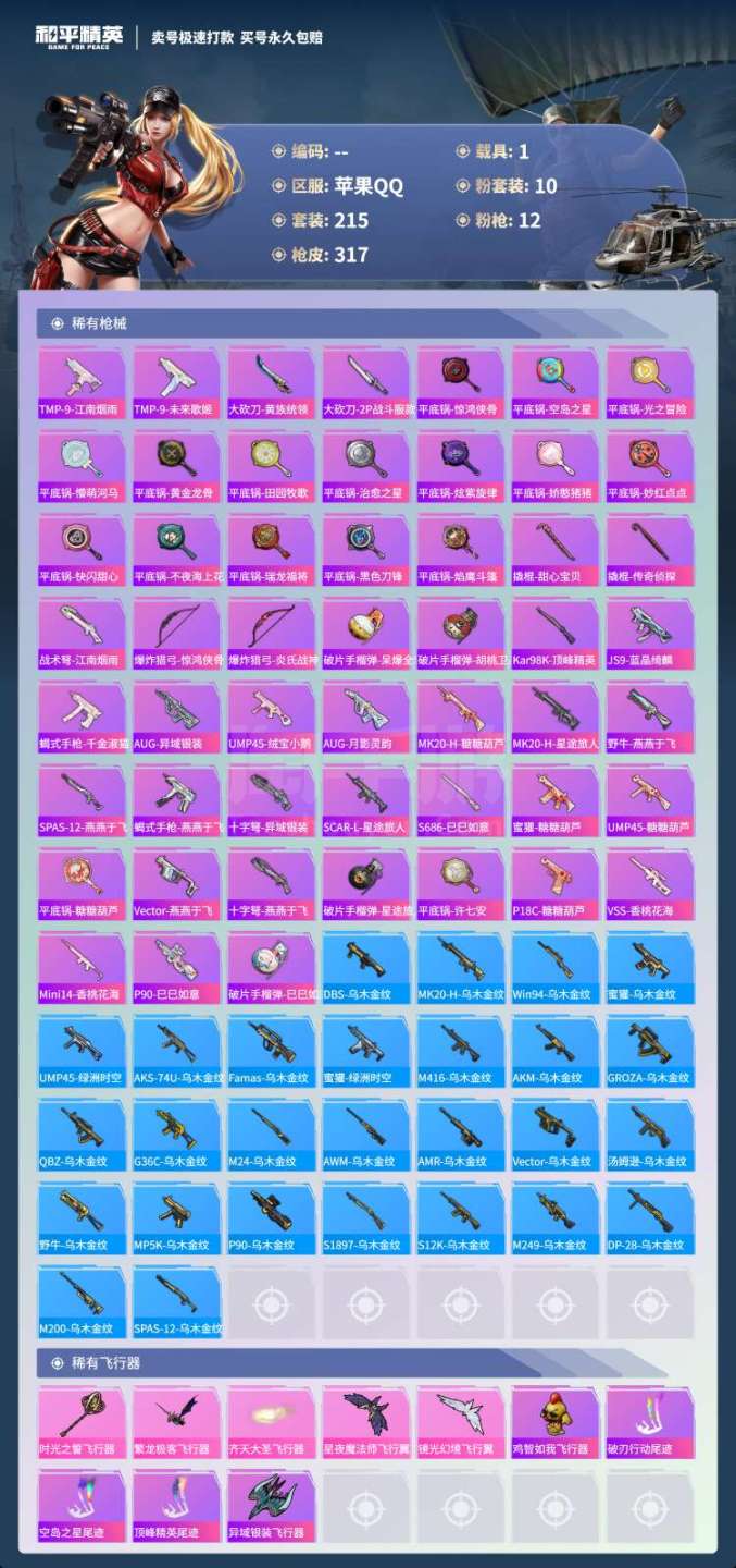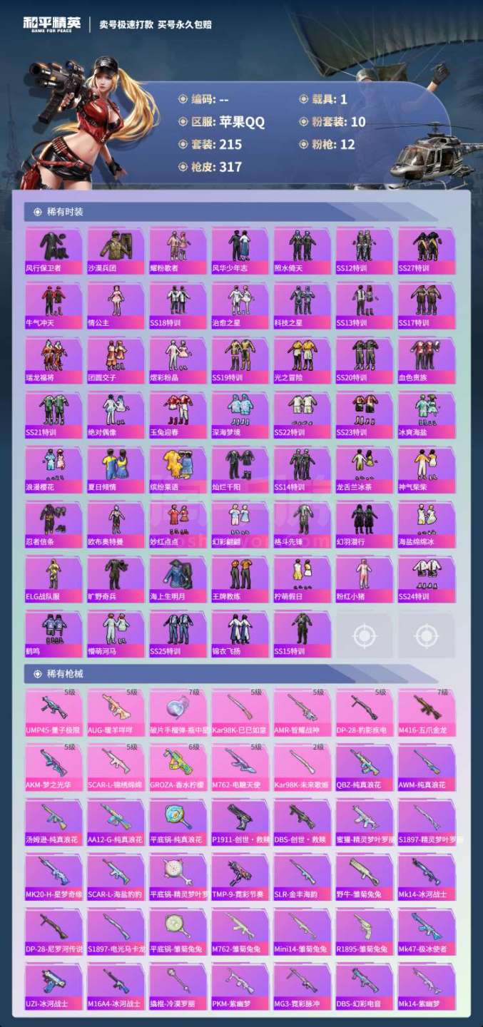 hs45562 苹果手Q-18王牌印记-有战神框-10粉装-12特效枪-1载具-93278热力值-2