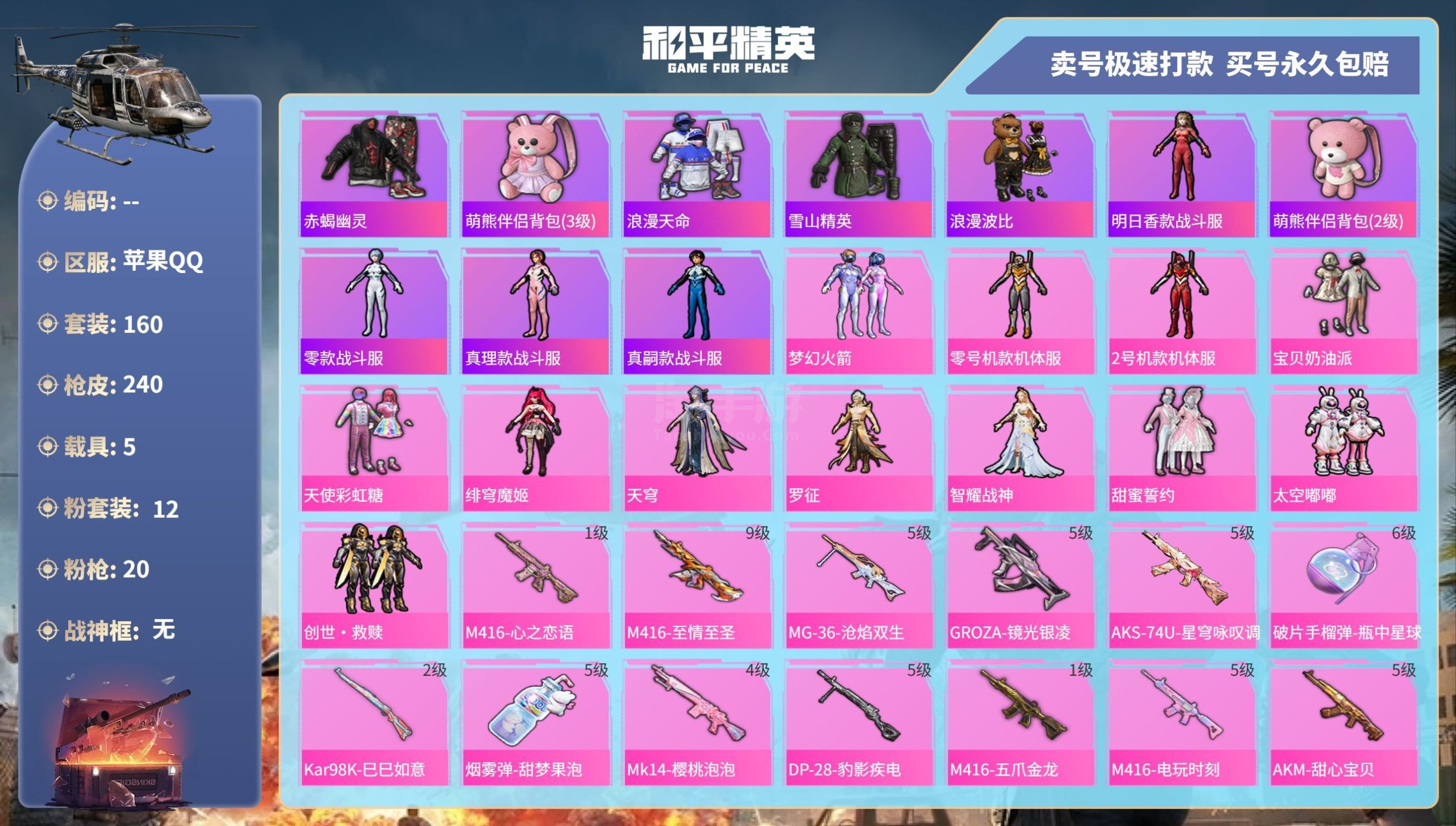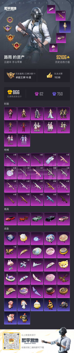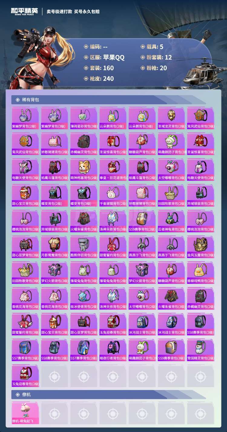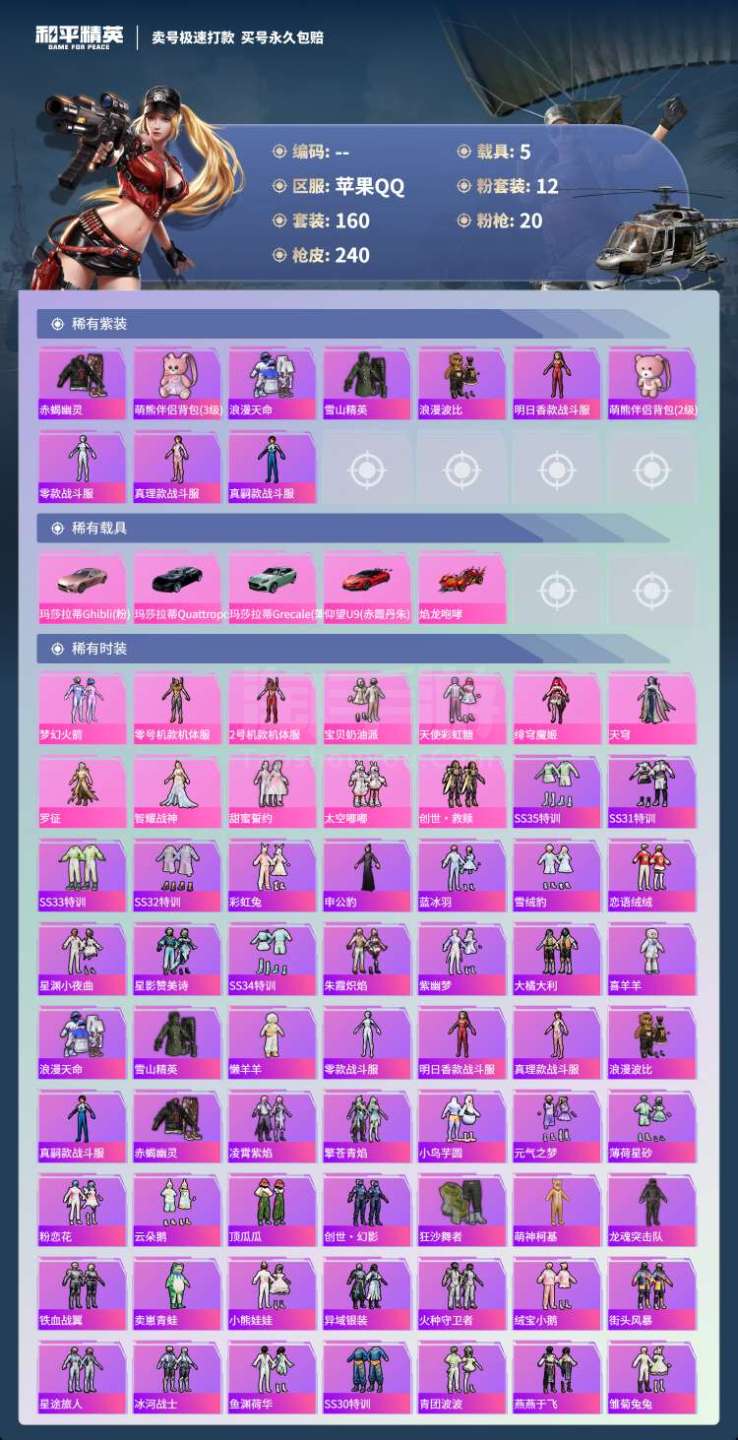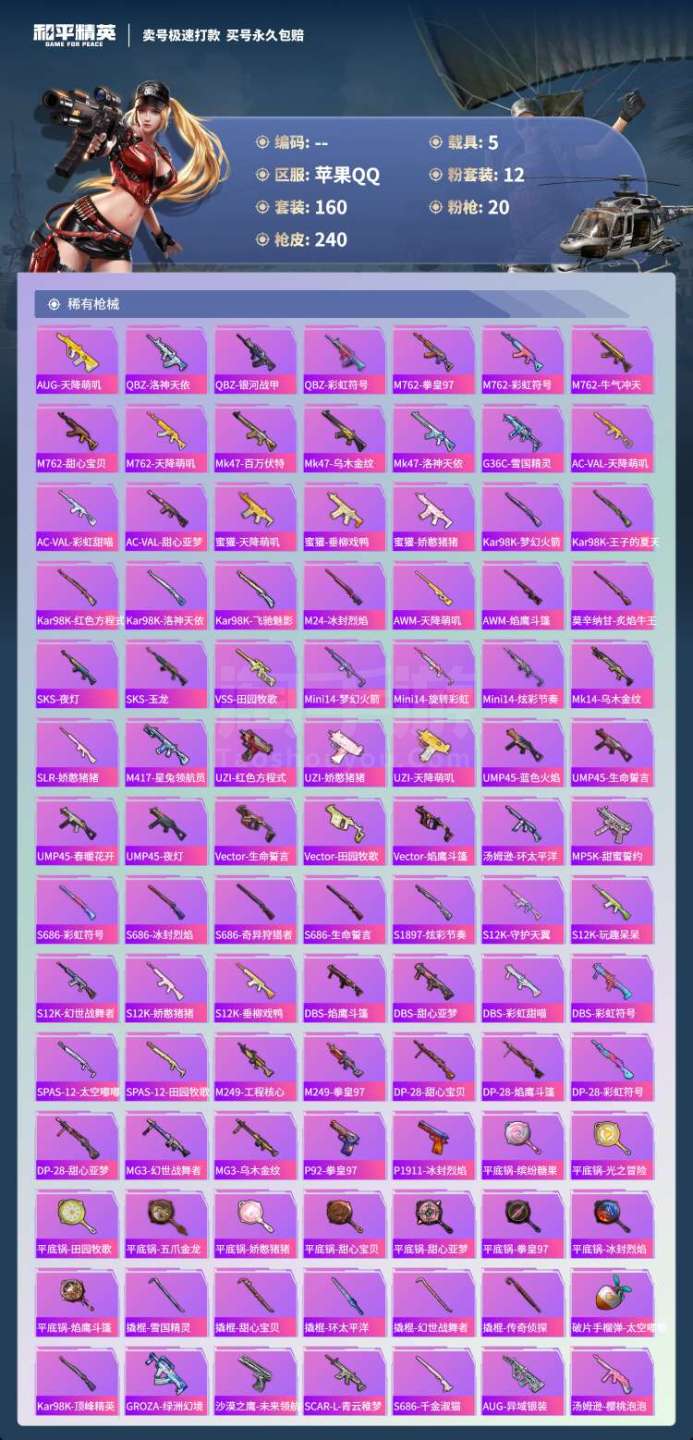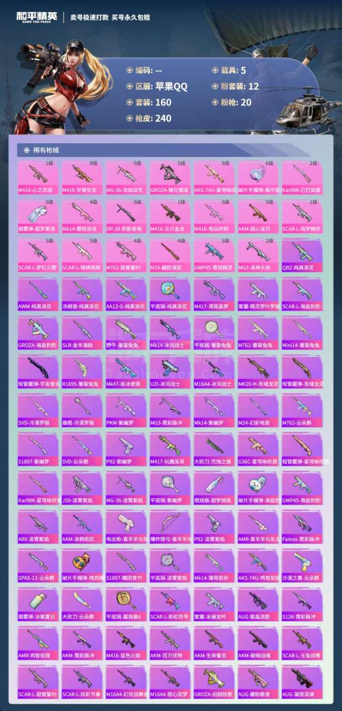 hs45443 苹果手Q-11王牌印记-12粉装-20特效枪-5载具-92106热力值-160套装-