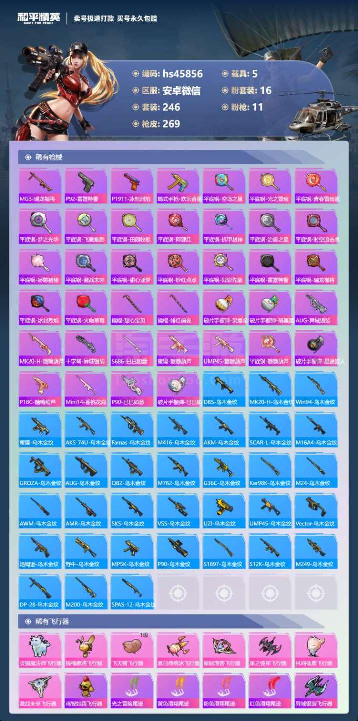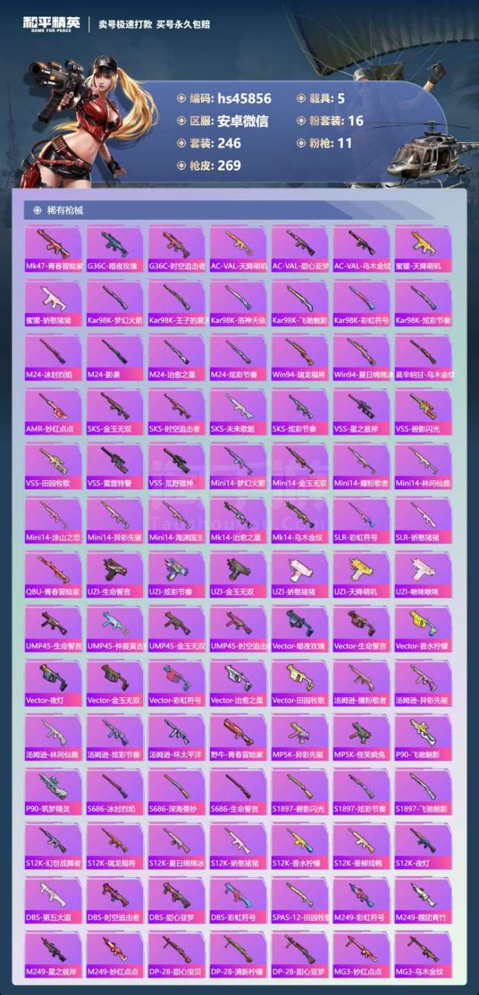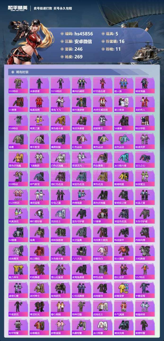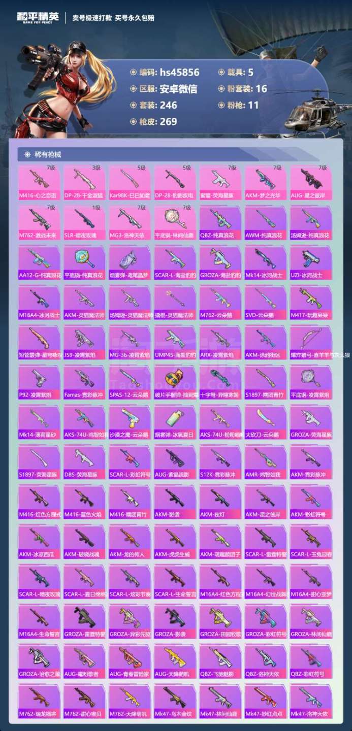 hs45856 安卓微-30王牌印记-16粉装-11特效枪-5载具-108471热力值-246套装