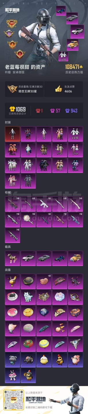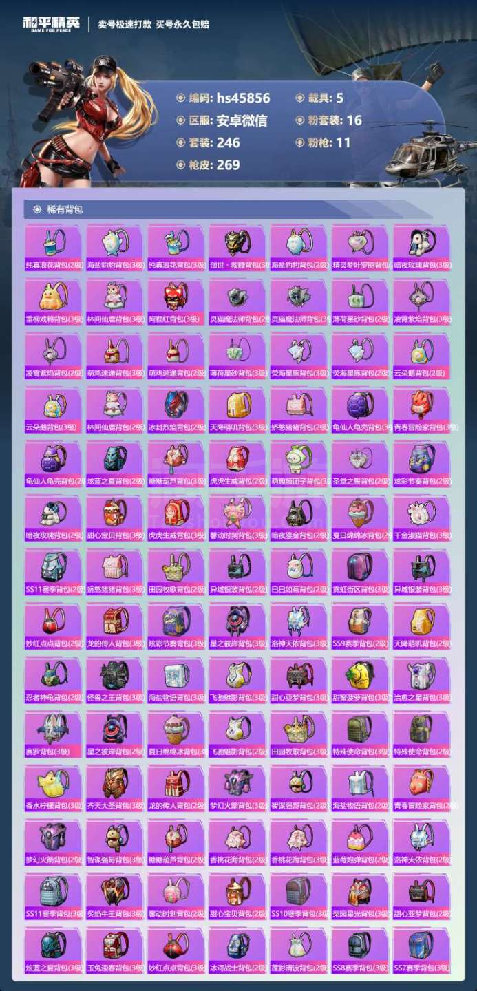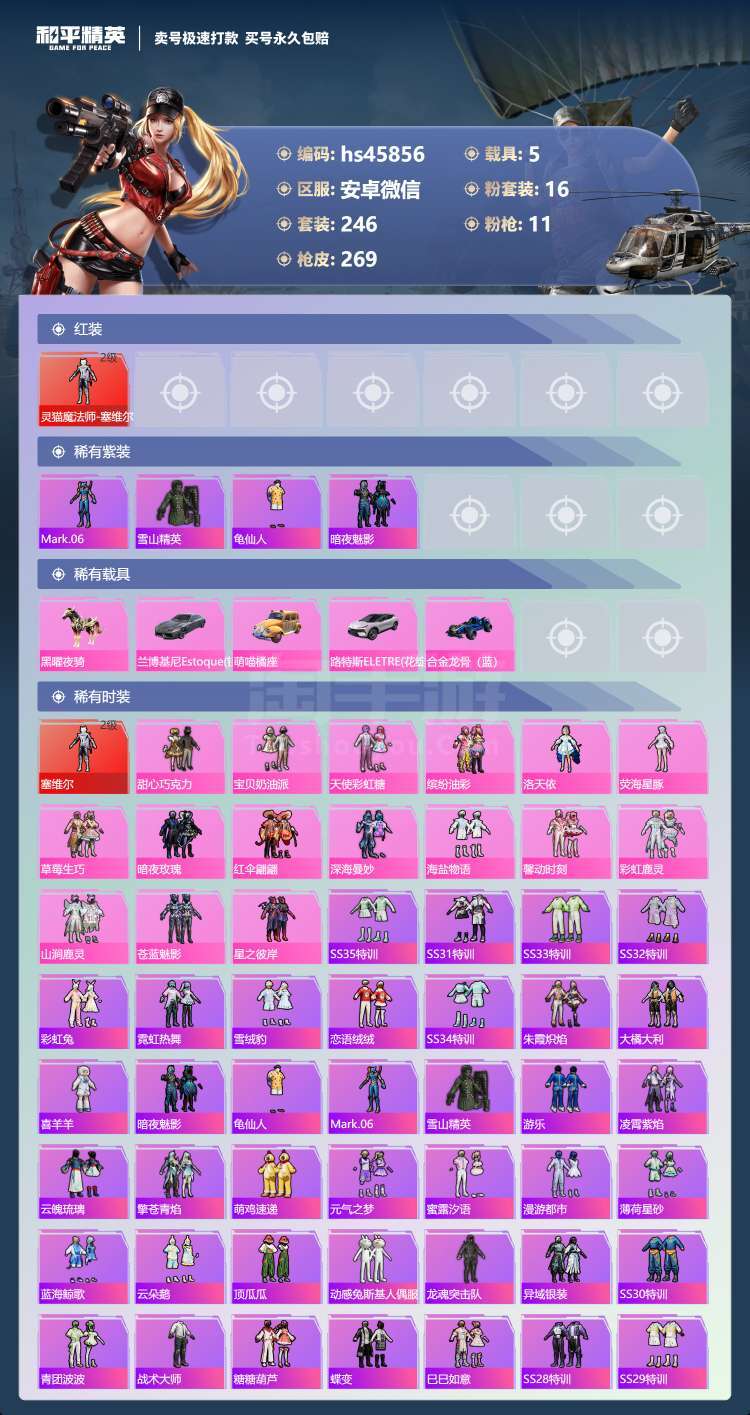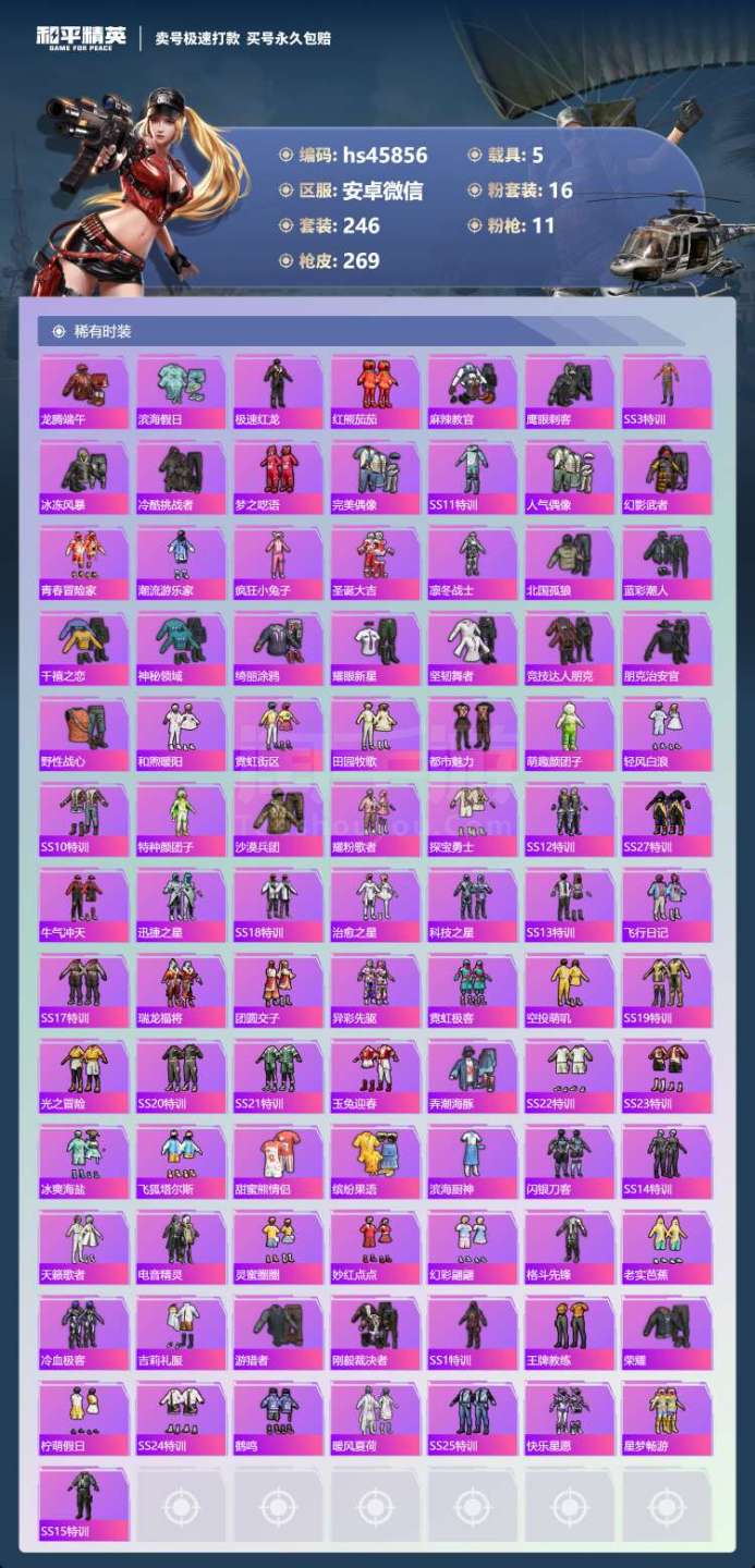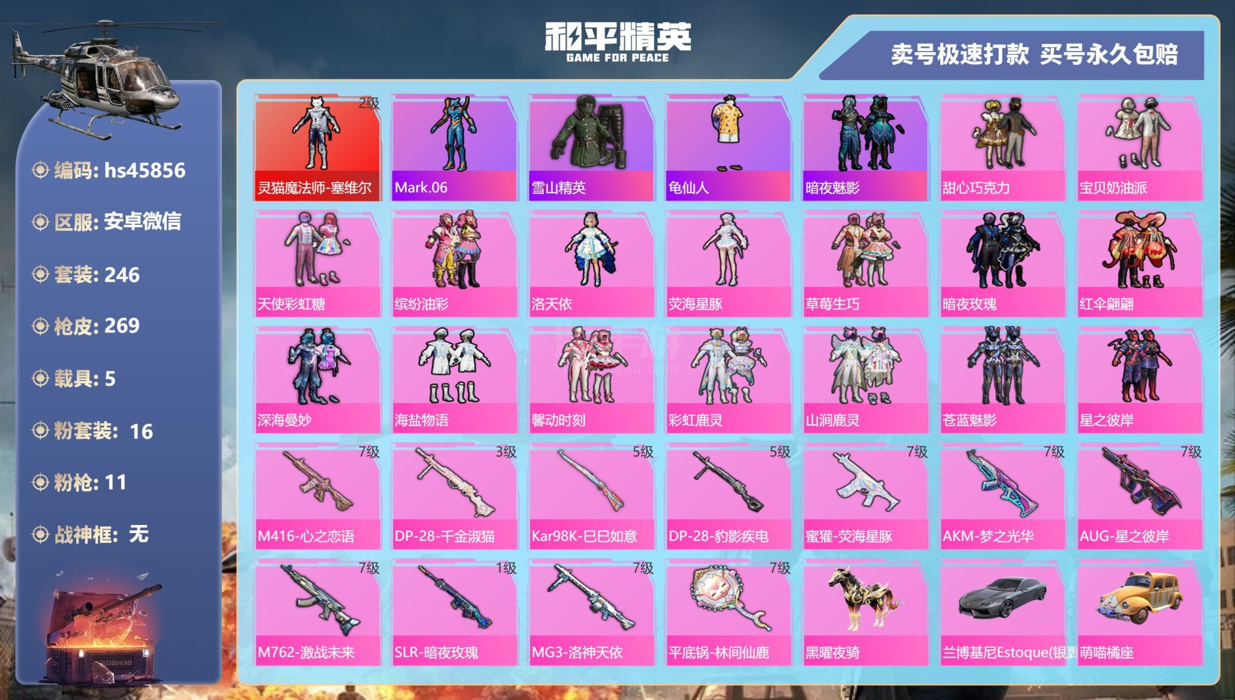 hs45856 安卓微-30王牌印记-16粉装-11特效枪-5载具-108471热力值-246套装