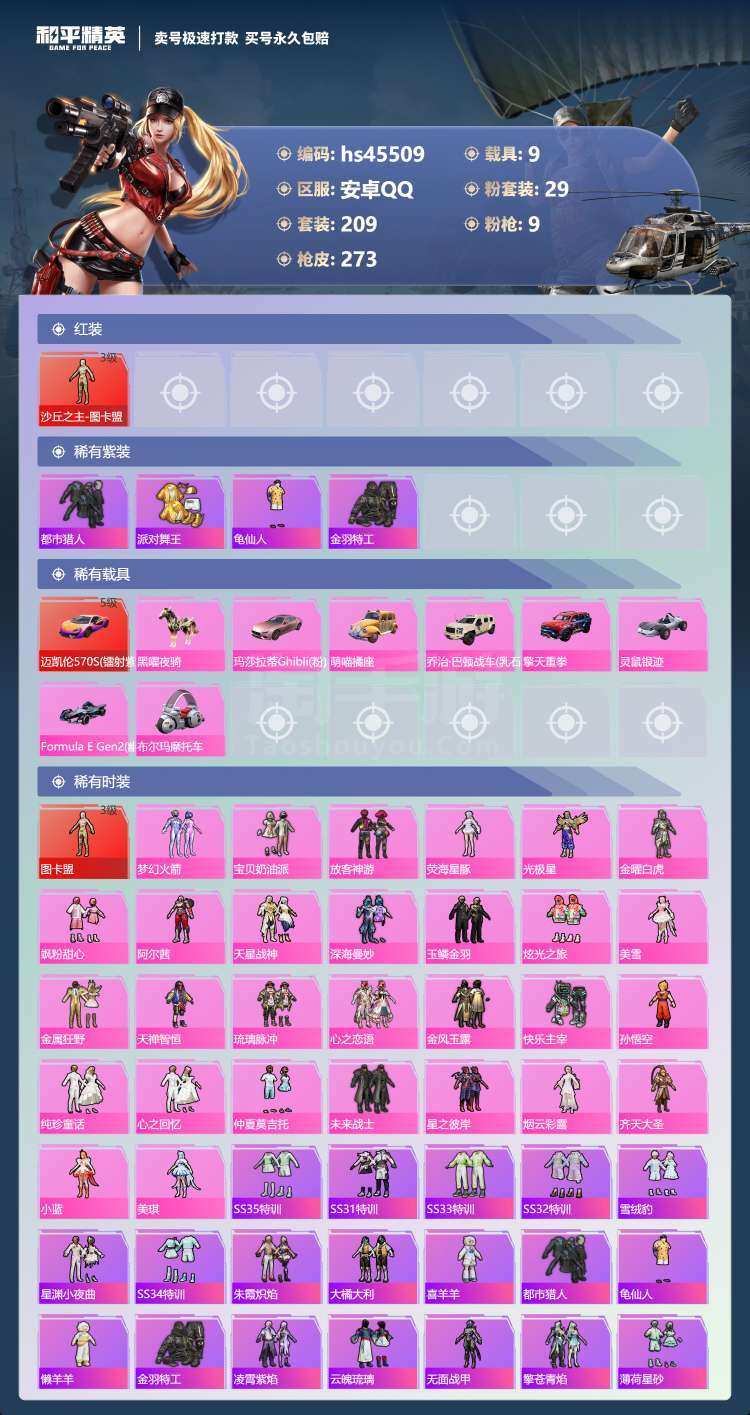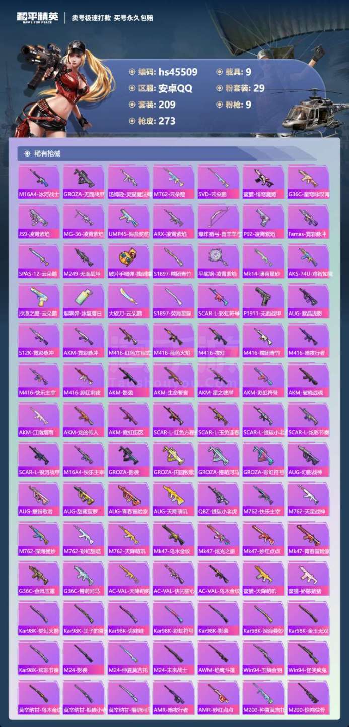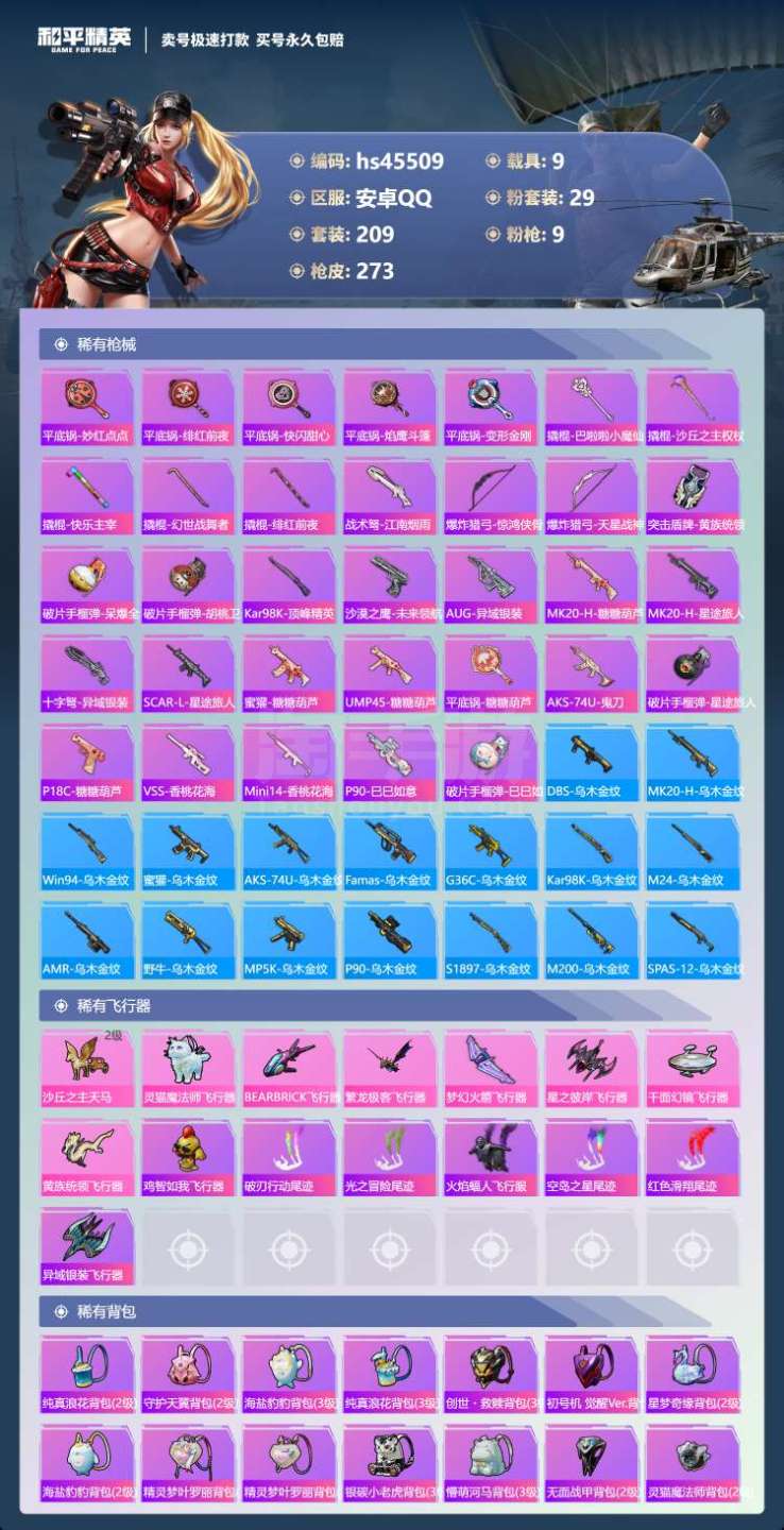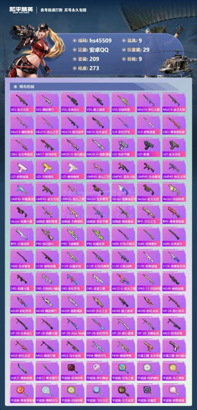 hs45509 安卓手Q-14王牌印记-29粉装-9特效枪-9载具-116712热力值-209套装-