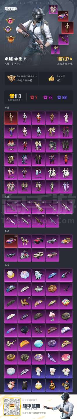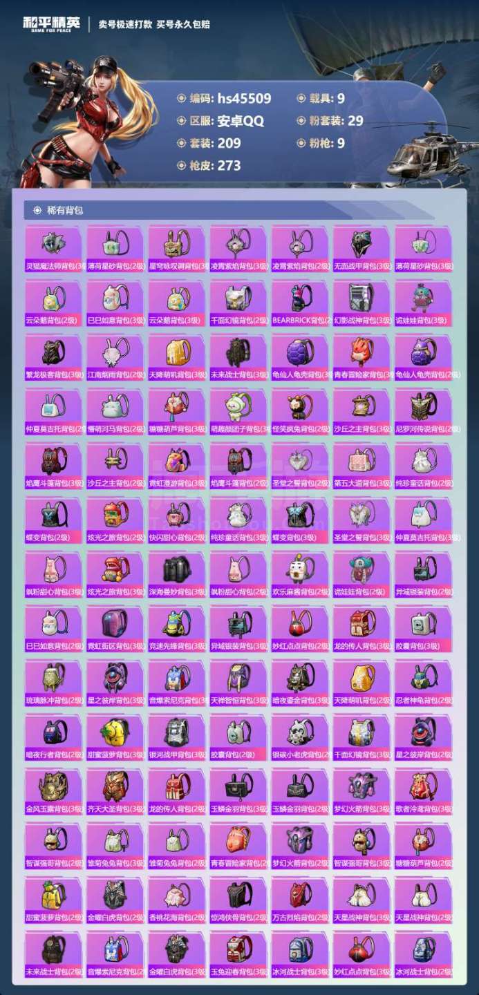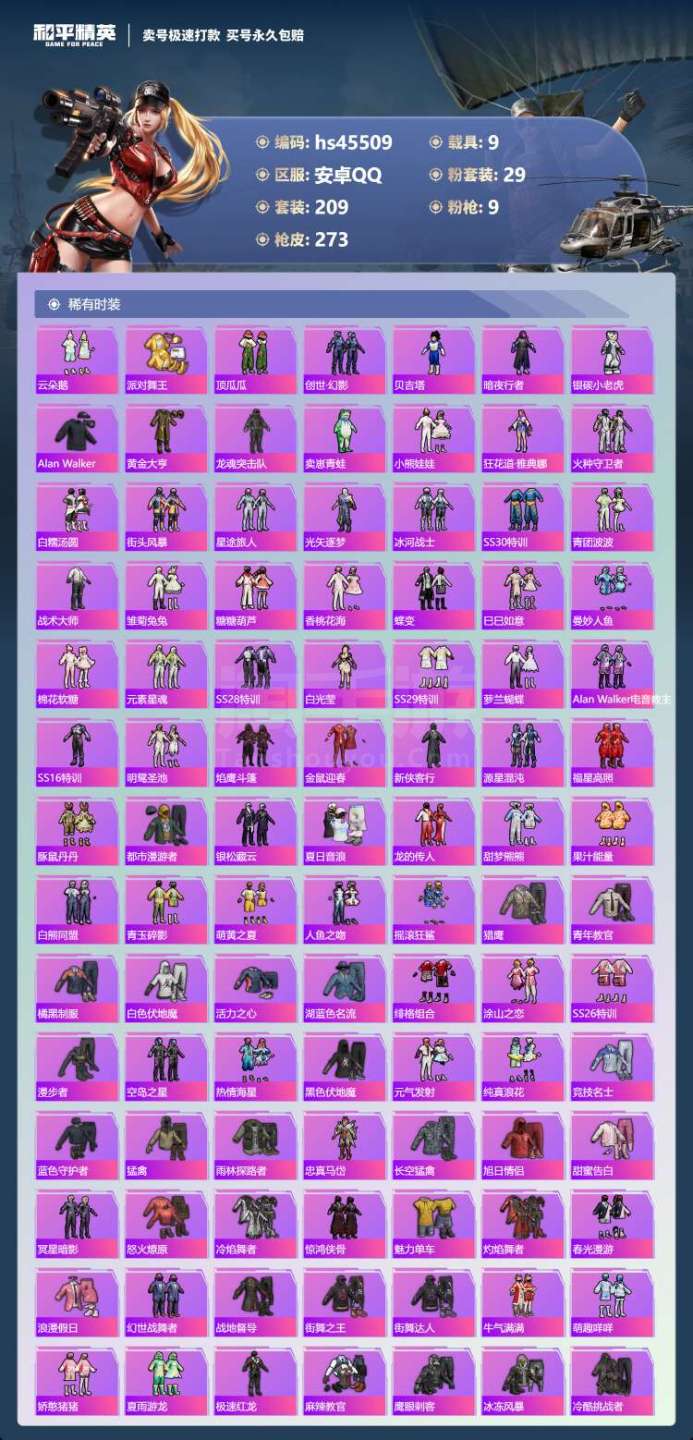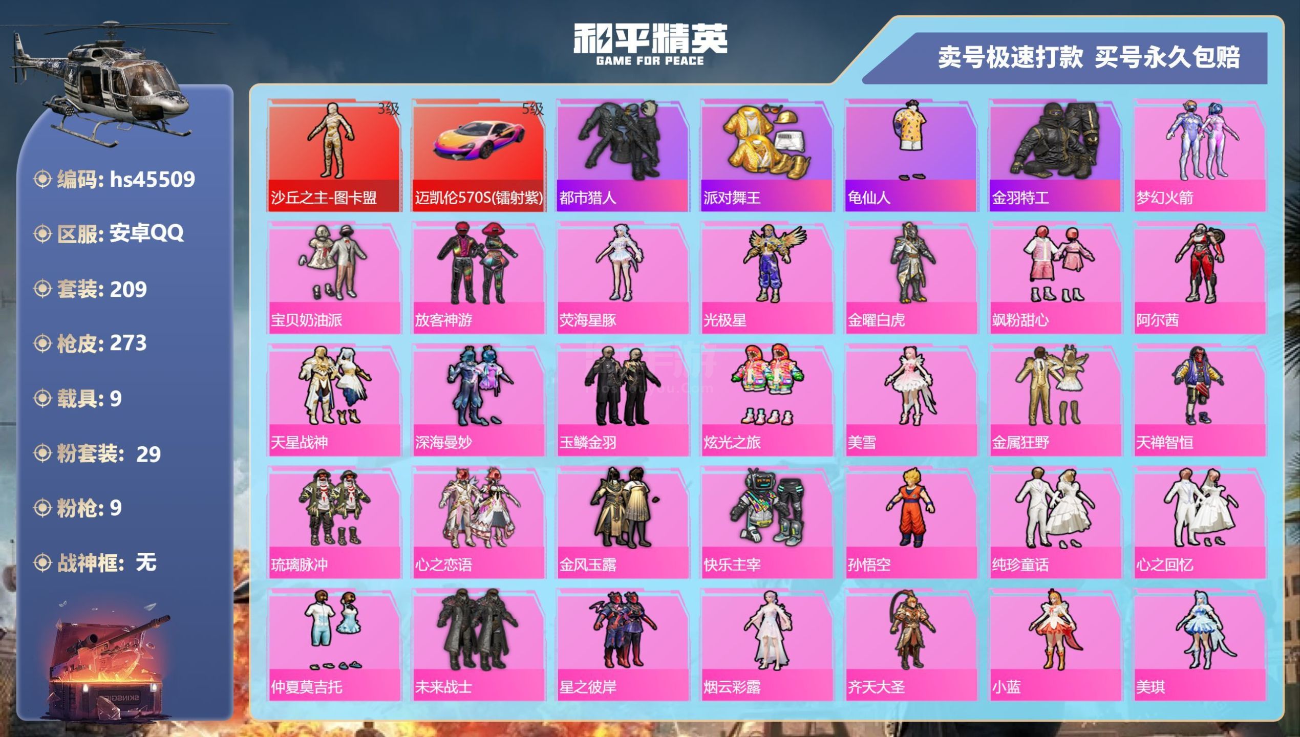 hs45509 安卓手Q-14王牌印记-29粉装-9特效枪-9载具-116712热力值-209套装-