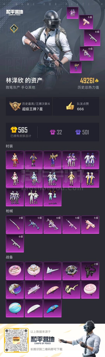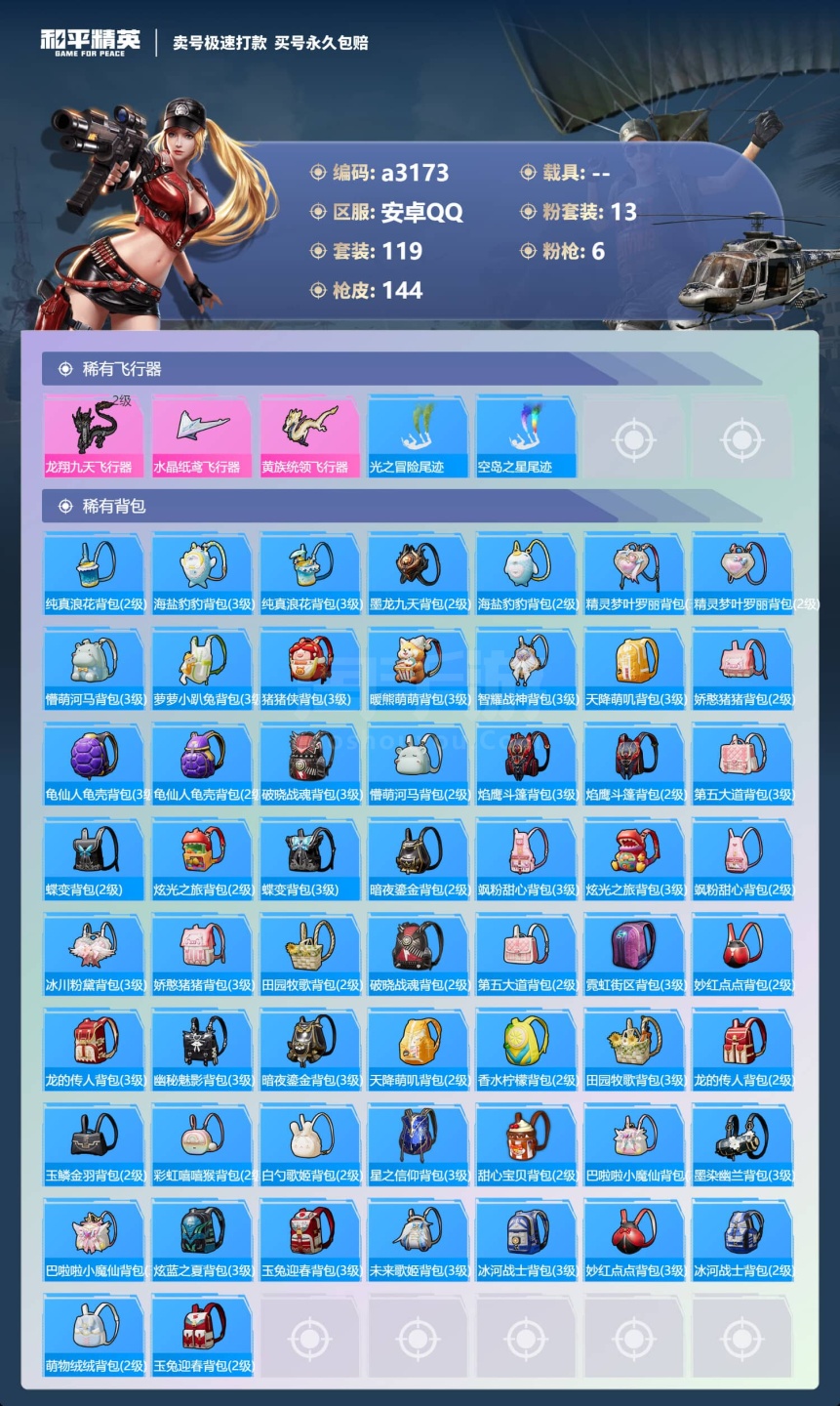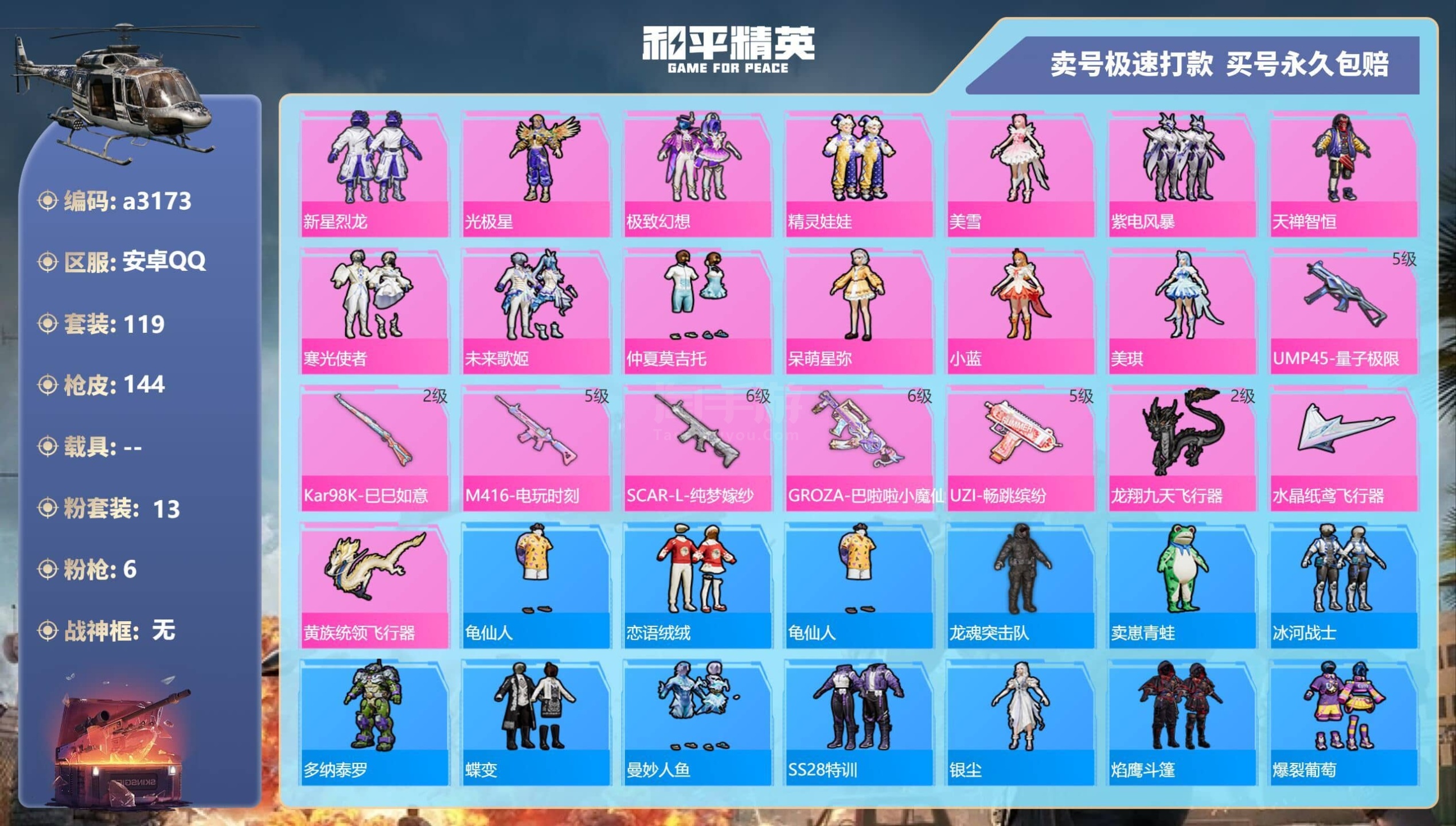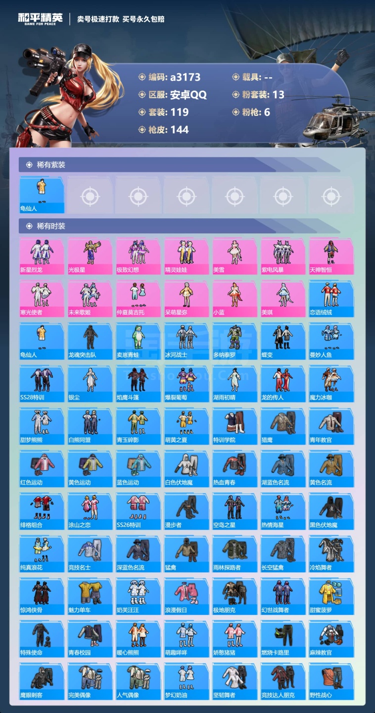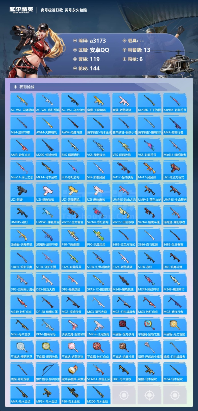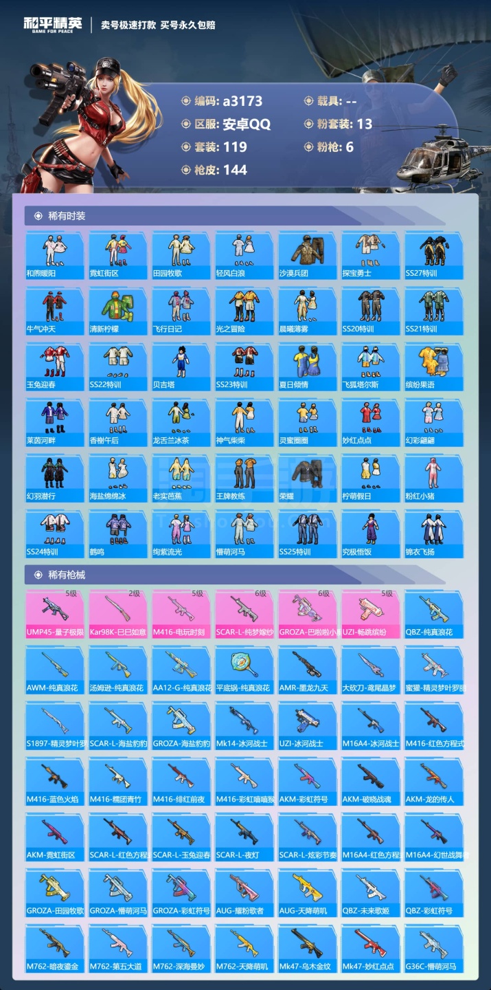 a3173/安卓QQ/-6王牌印记-13粉装-6特效枪-0载具-49261热力值-119套装-144