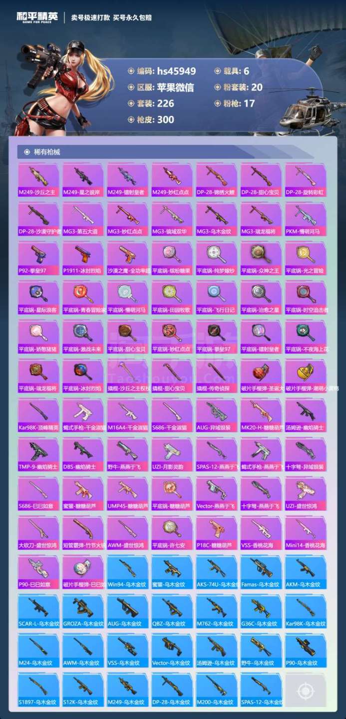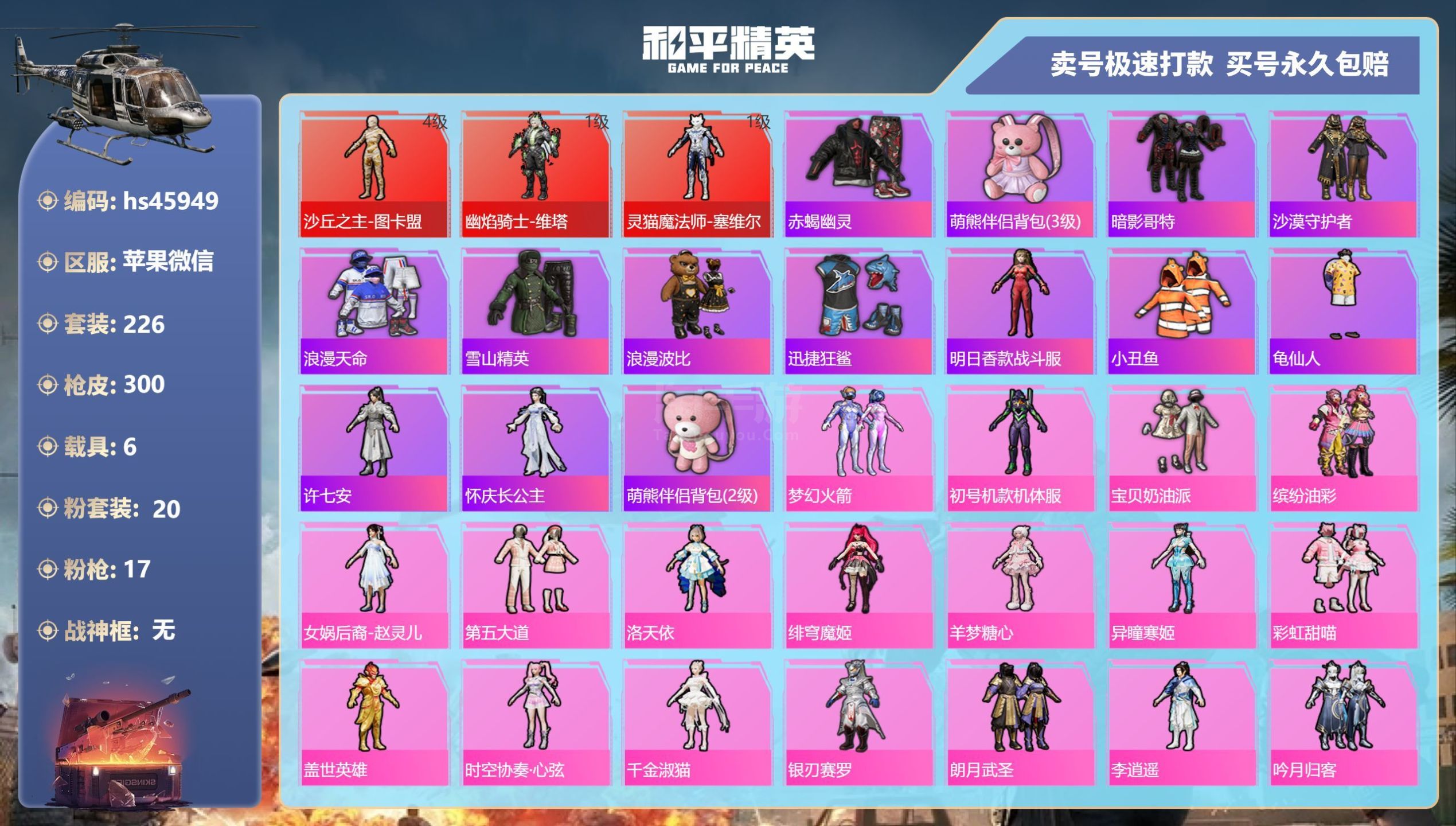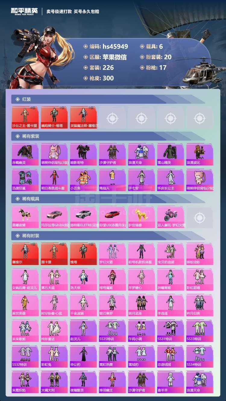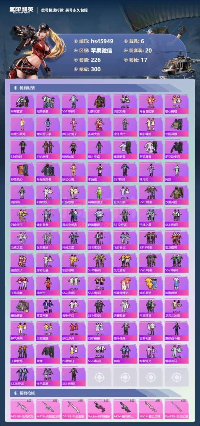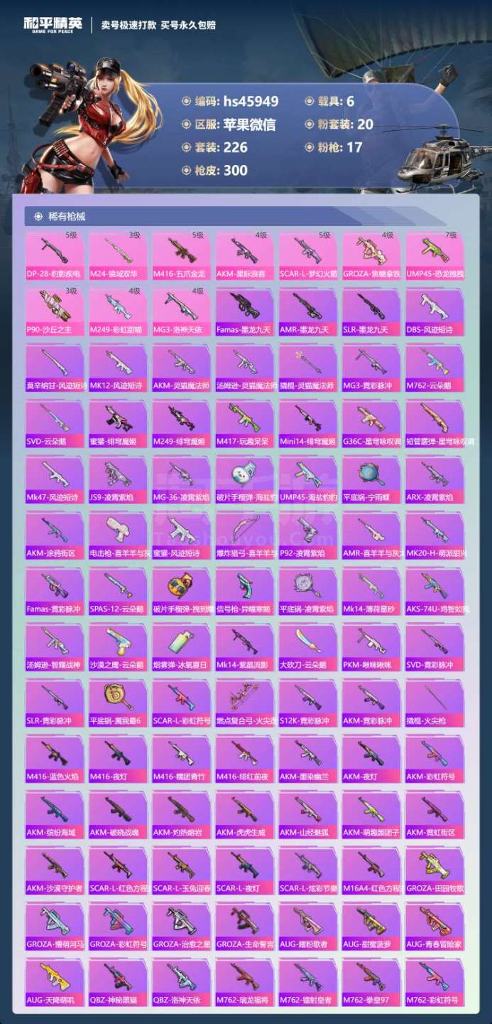 hs45949 苹果微-13王牌印记-20粉装-17特效枪-6载具-125316热力值-226套装