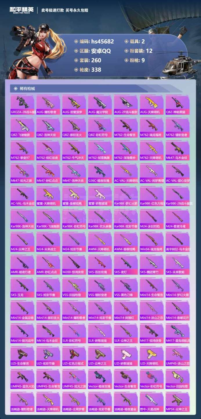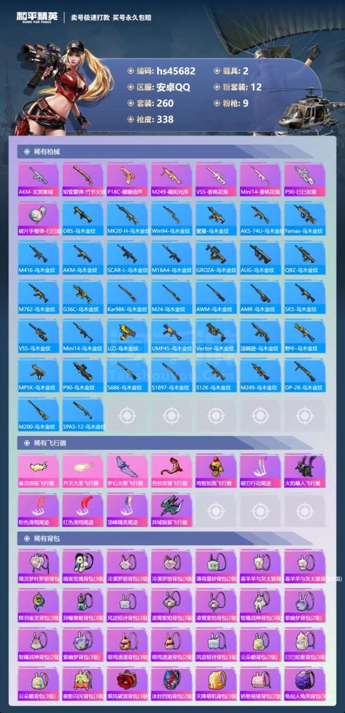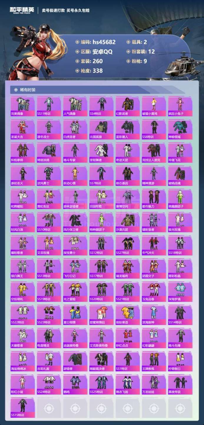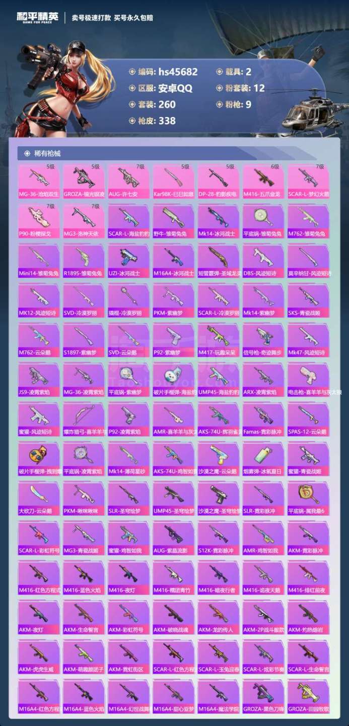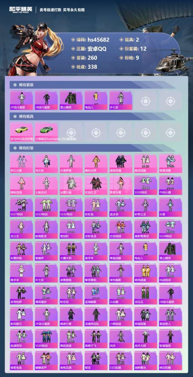 hs45682 安卓手Q-21王牌印记-12粉装-9特效枪-2载具-110785热力值-260套装-