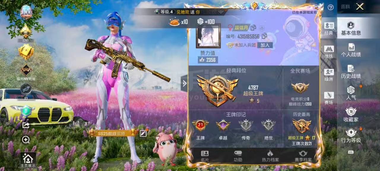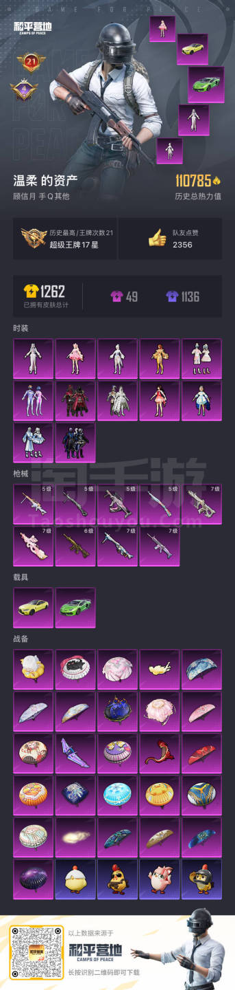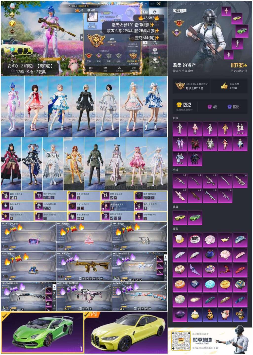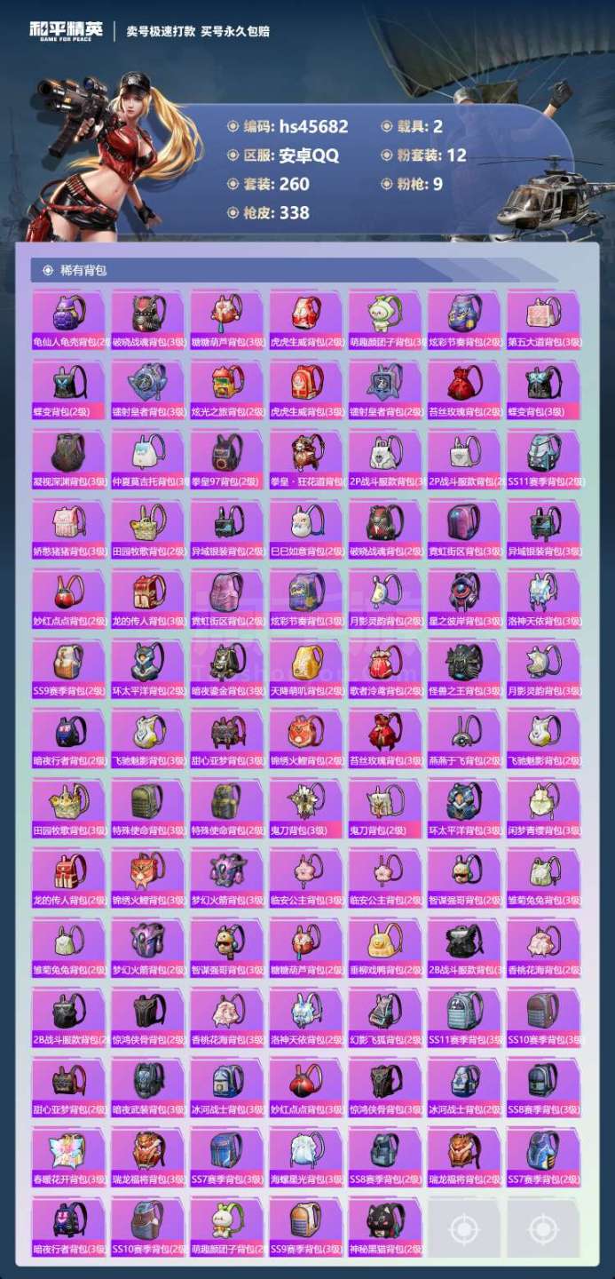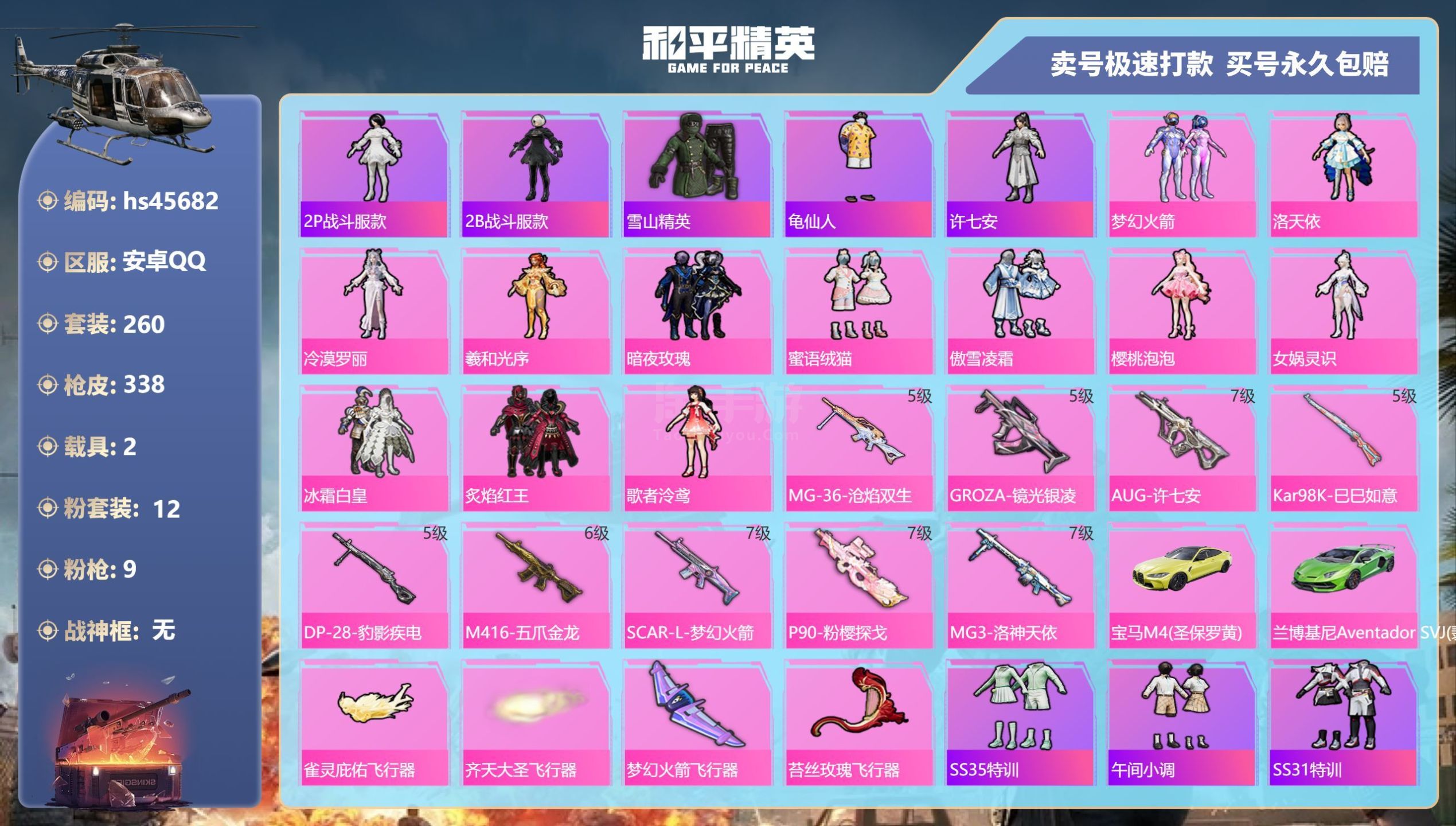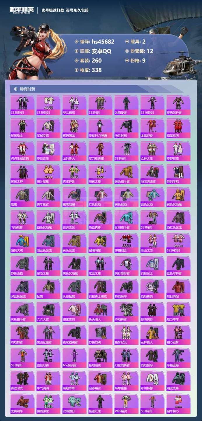 hs45682 安卓手Q-21王牌印记-12粉装-9特效枪-2载具-110785热力值-260套装-