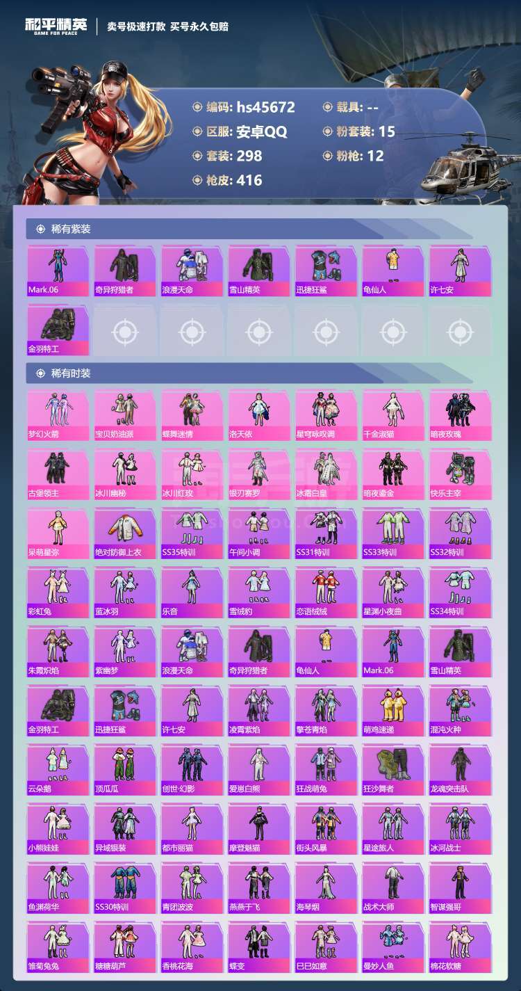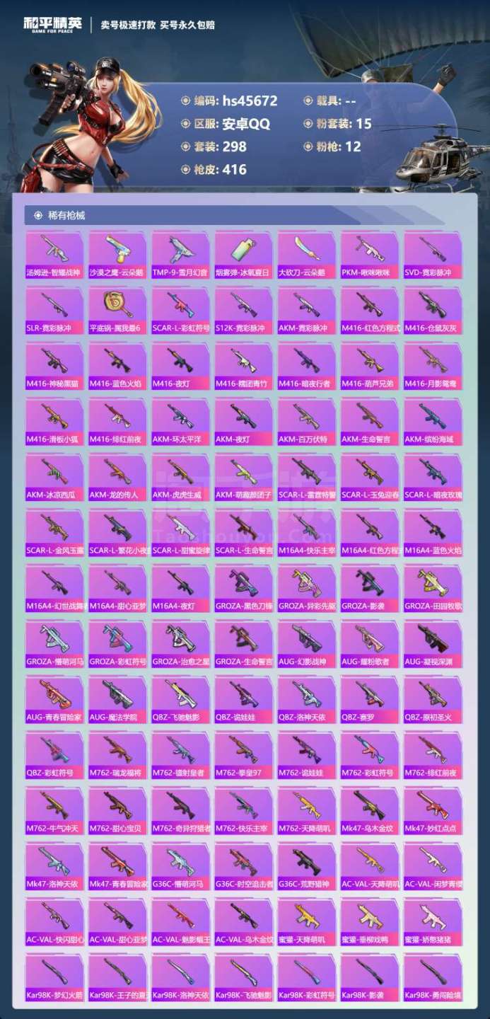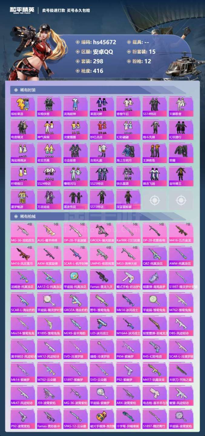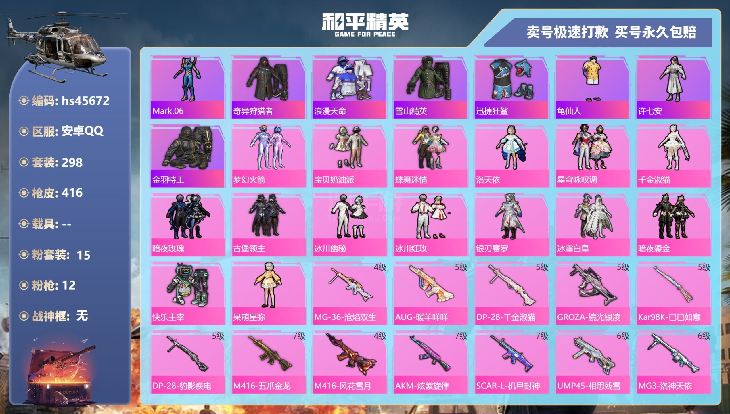 hs45672 安卓手Q-30王牌印记-15粉装-12特效枪-0载具-127028热力值-298套装
