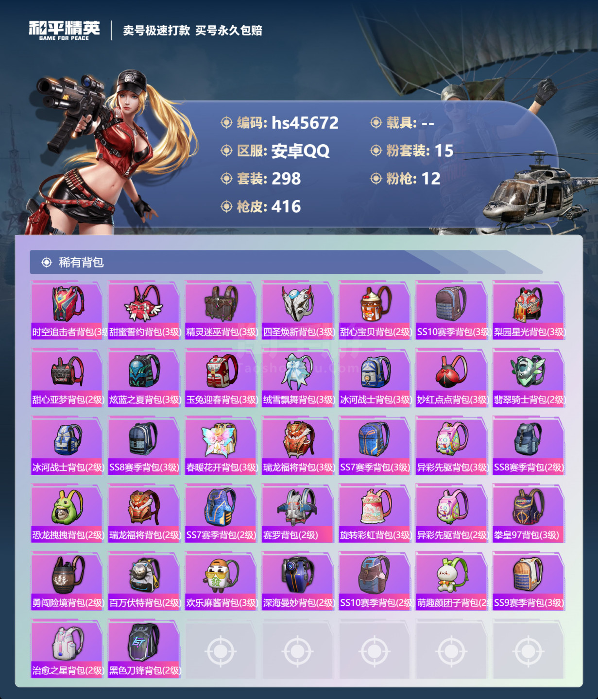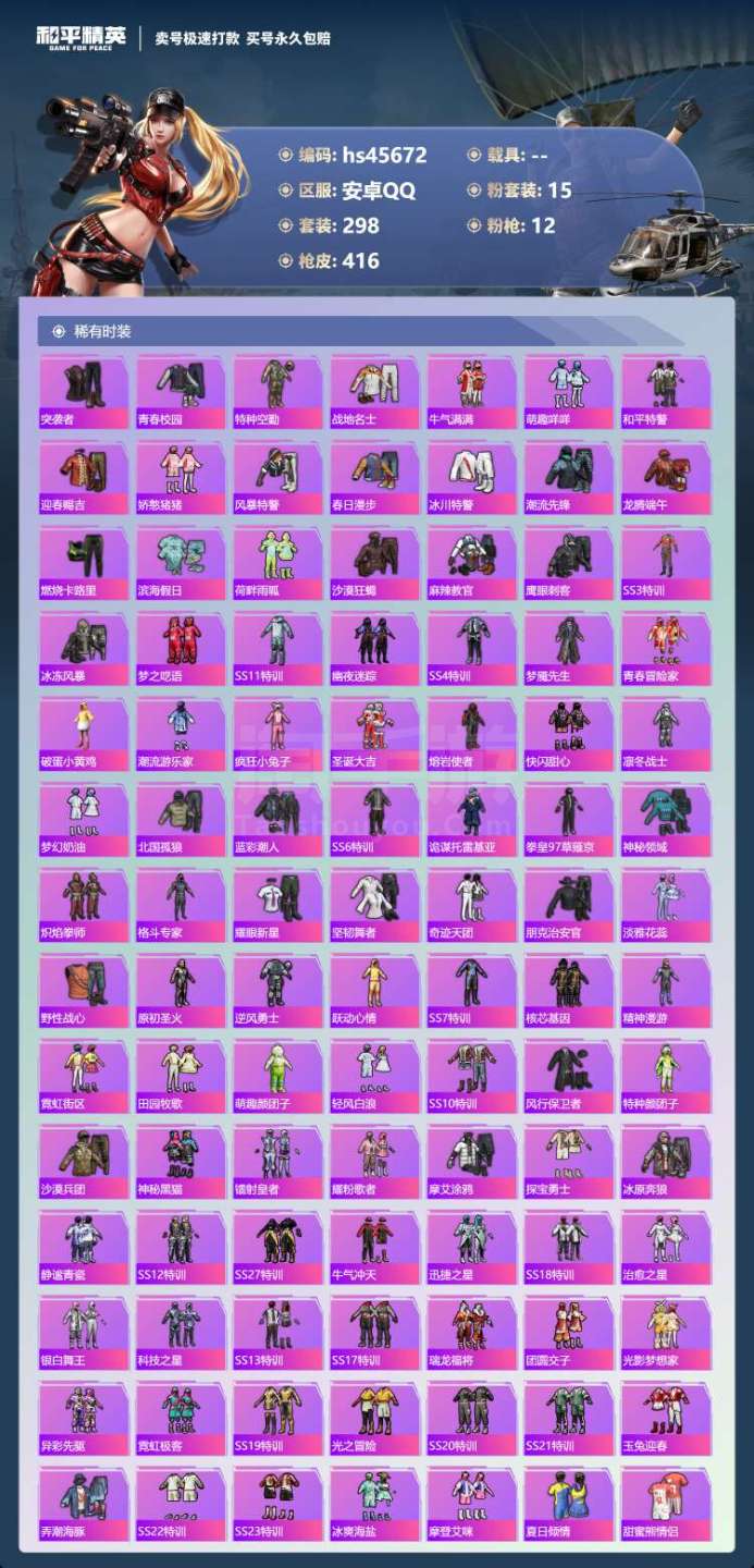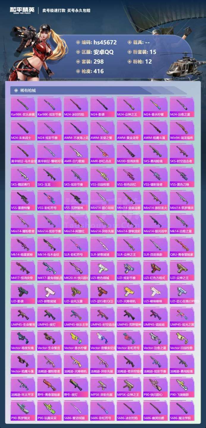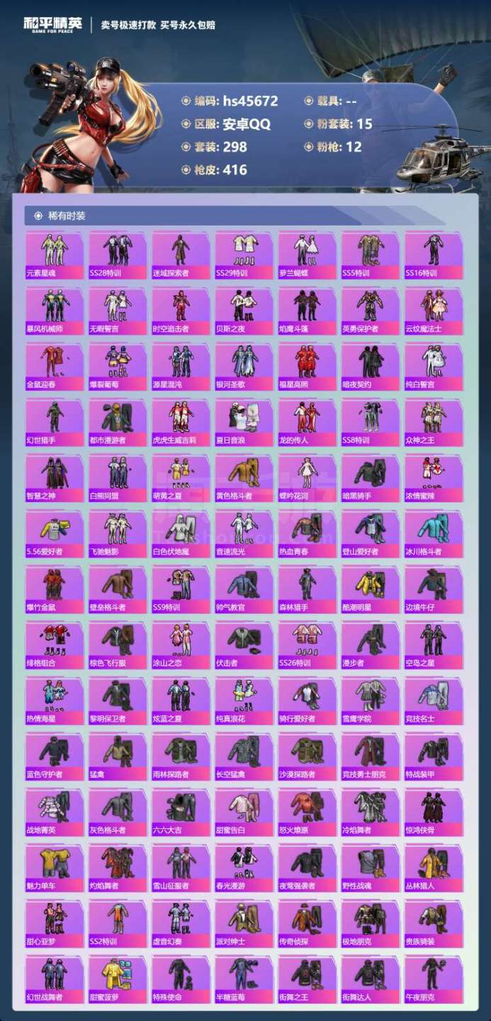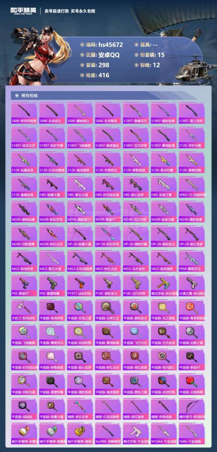 hs45672 安卓手Q-30王牌印记-15粉装-12特效枪-0载具-127028热力值-298套装