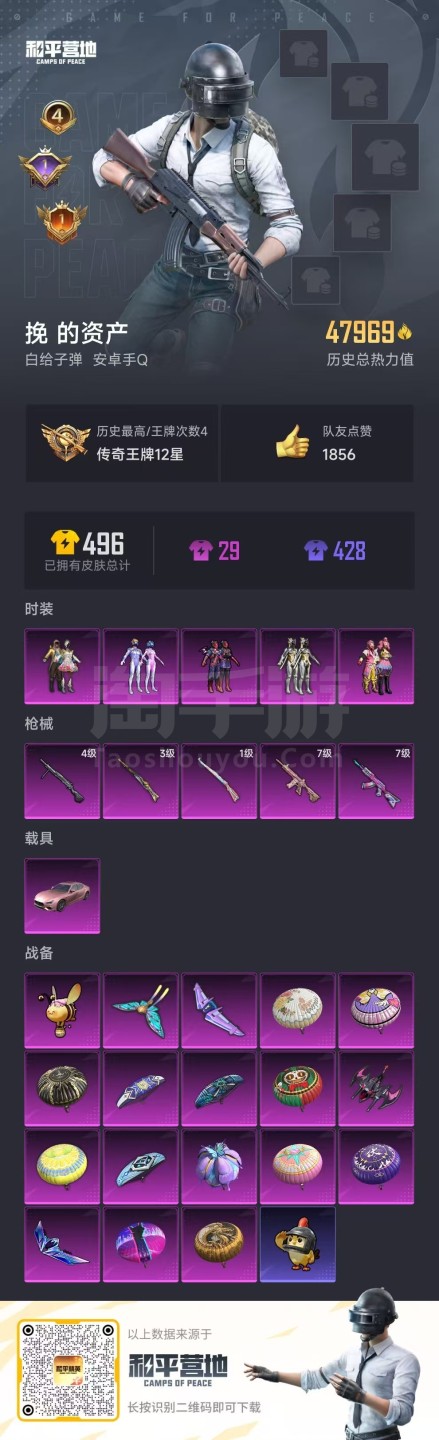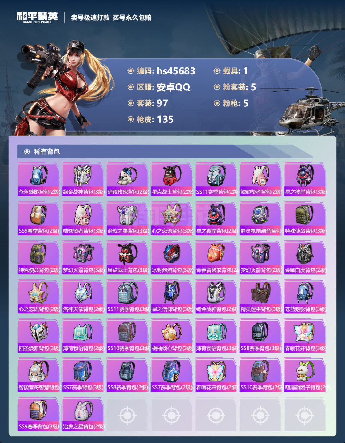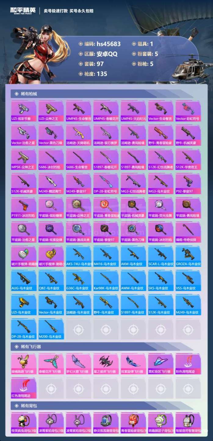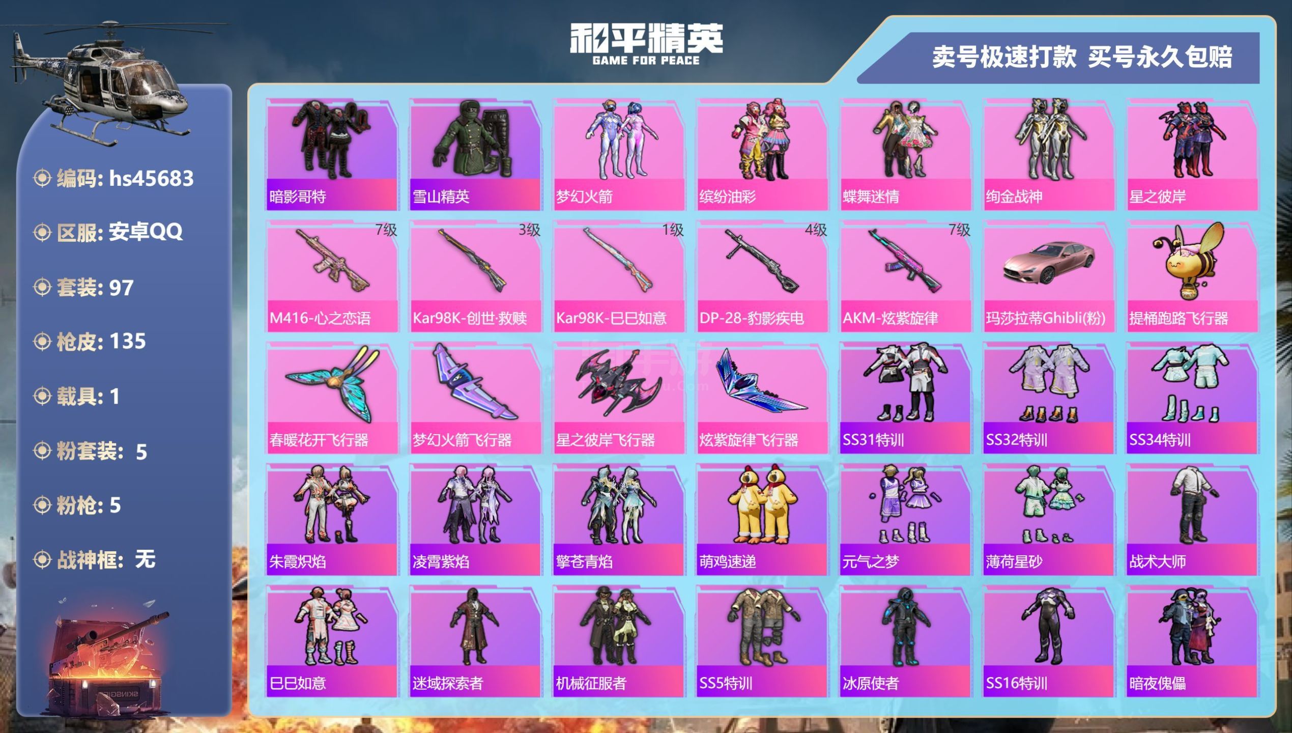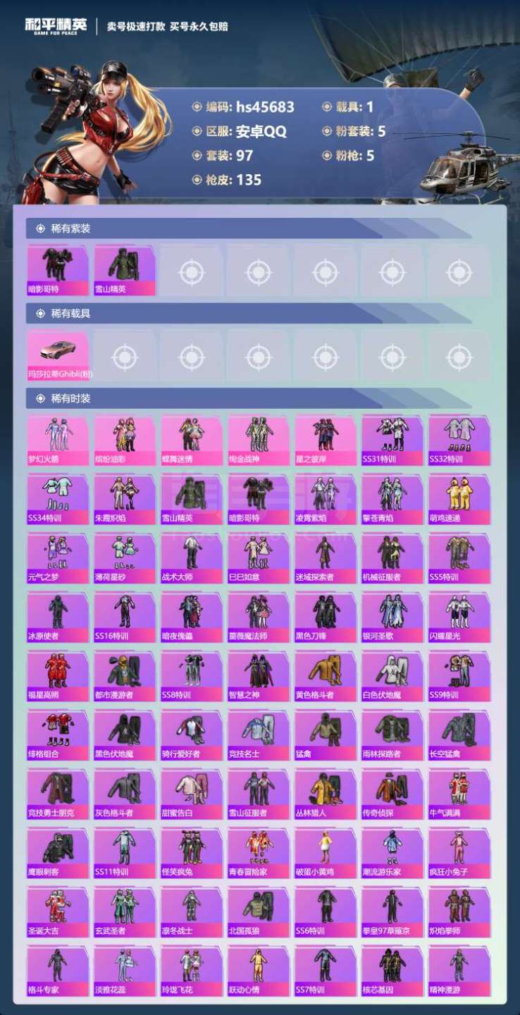 hs45683 安卓手Q-4王牌印记-5粉装-5特效枪-1载具-47969热力值-97套装-135枪