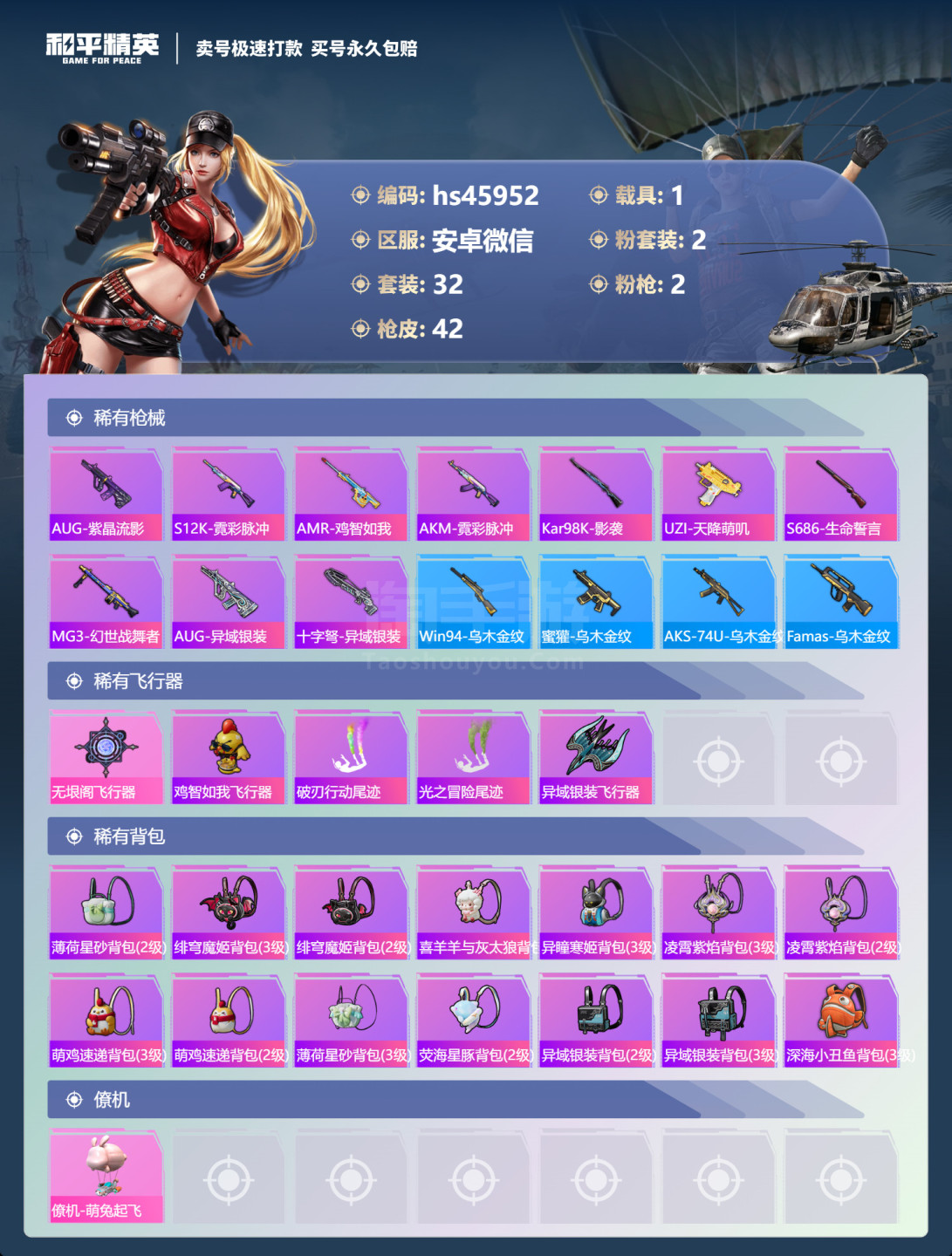 hs45952 安卓微-2王牌印记-2粉装-2特效枪-1载具-13869热力值-32套装-42枪皮