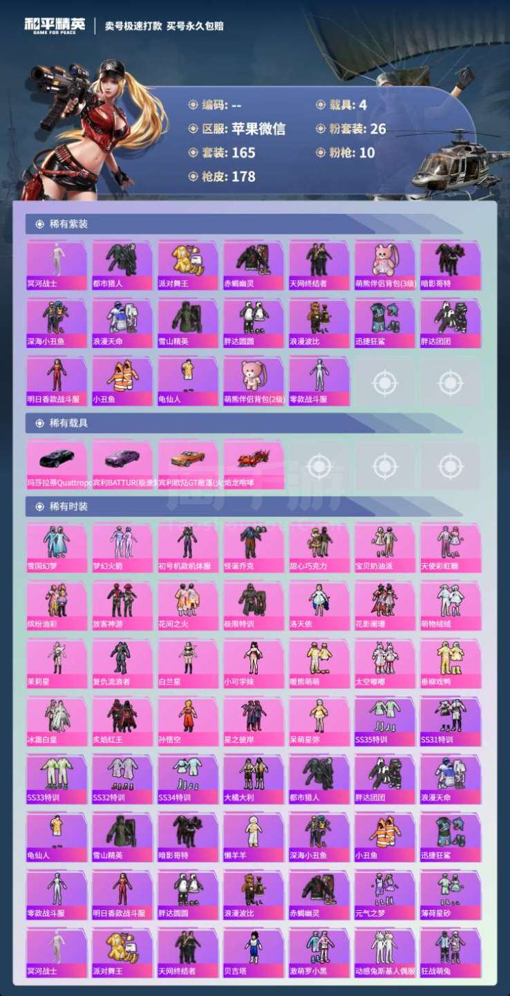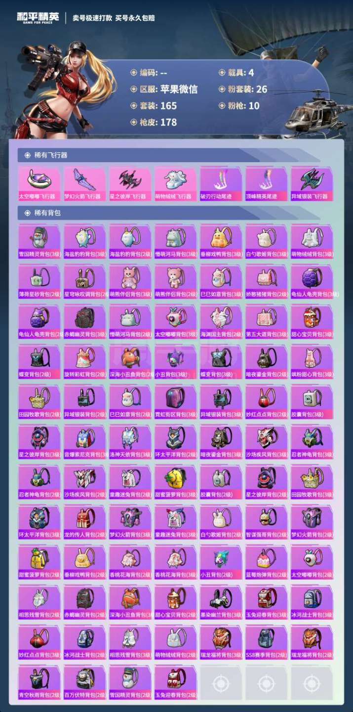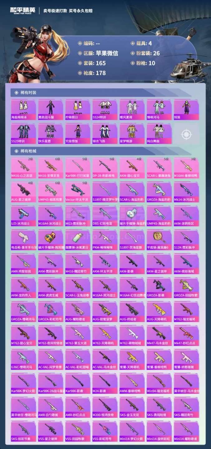 hs45456 苹果微-15王牌印记-26粉装-10特效枪-4载具-74652热力值-165套装-