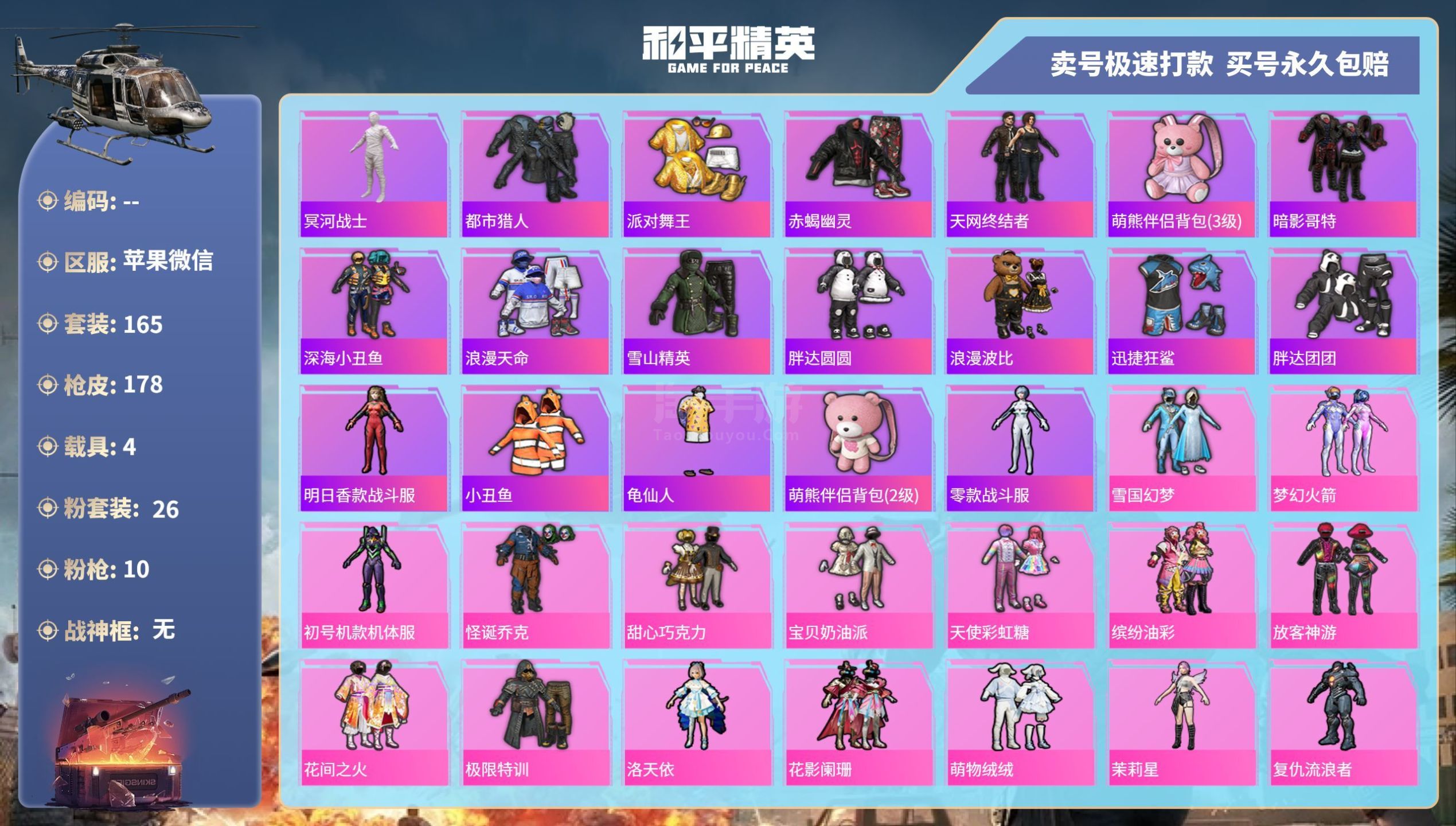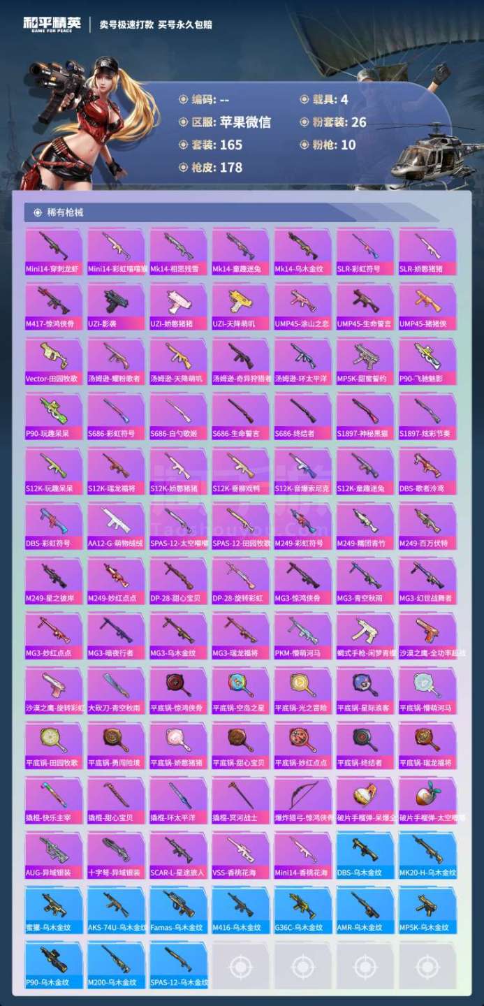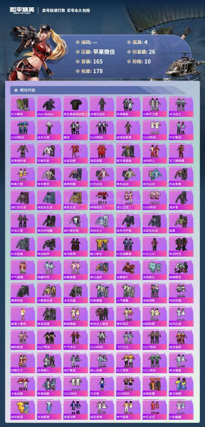 hs45456 苹果微-15王牌印记-26粉装-10特效枪-4载具-74652热力值-165套装-