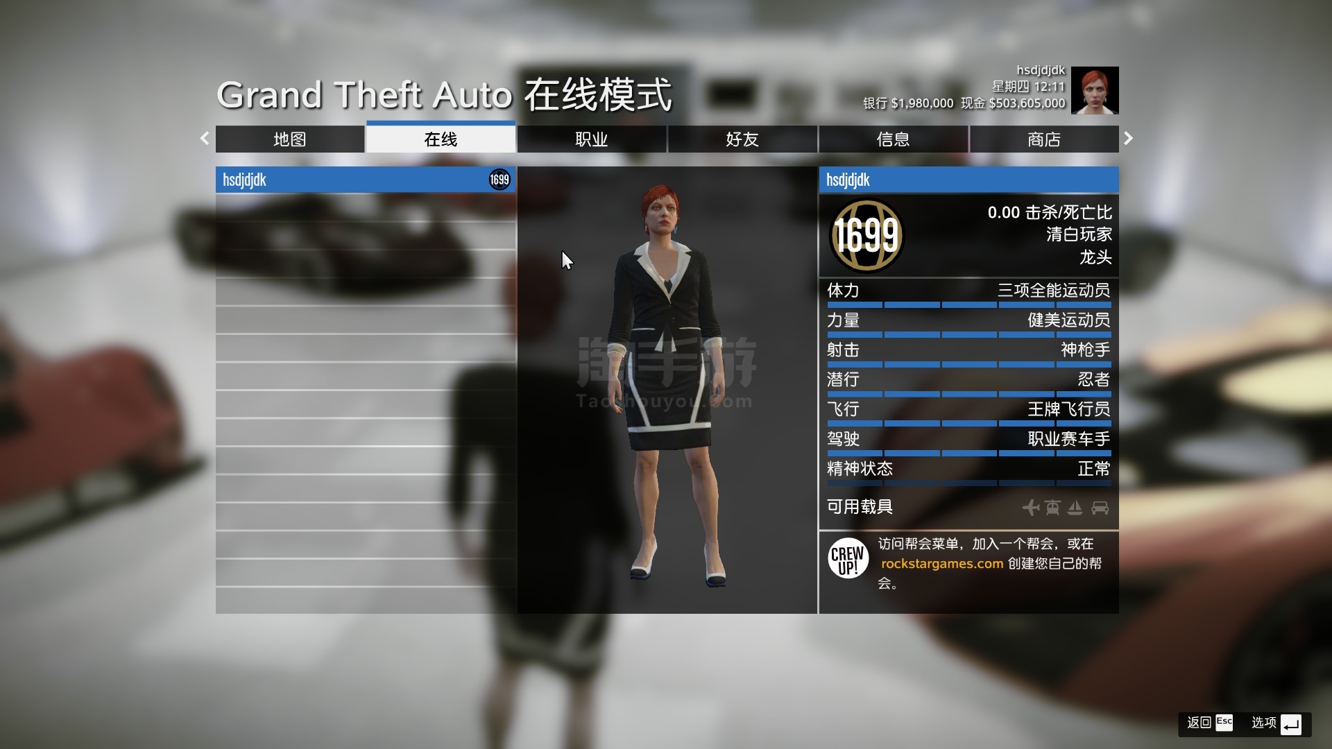GTA增强版本线上模式拥有5亿多金币随便花,等级1699,满属性全解锁,地堡51项科技解锁,超多车库