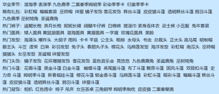 稀有礼包:彩虹帽 蝙蝠套装 巫师帽 绊爱 橘子发饰 雪花发饰 蛛丝斗篷 皮皮猫斗篷 透明蛛丝斗篷 鸦羽斗