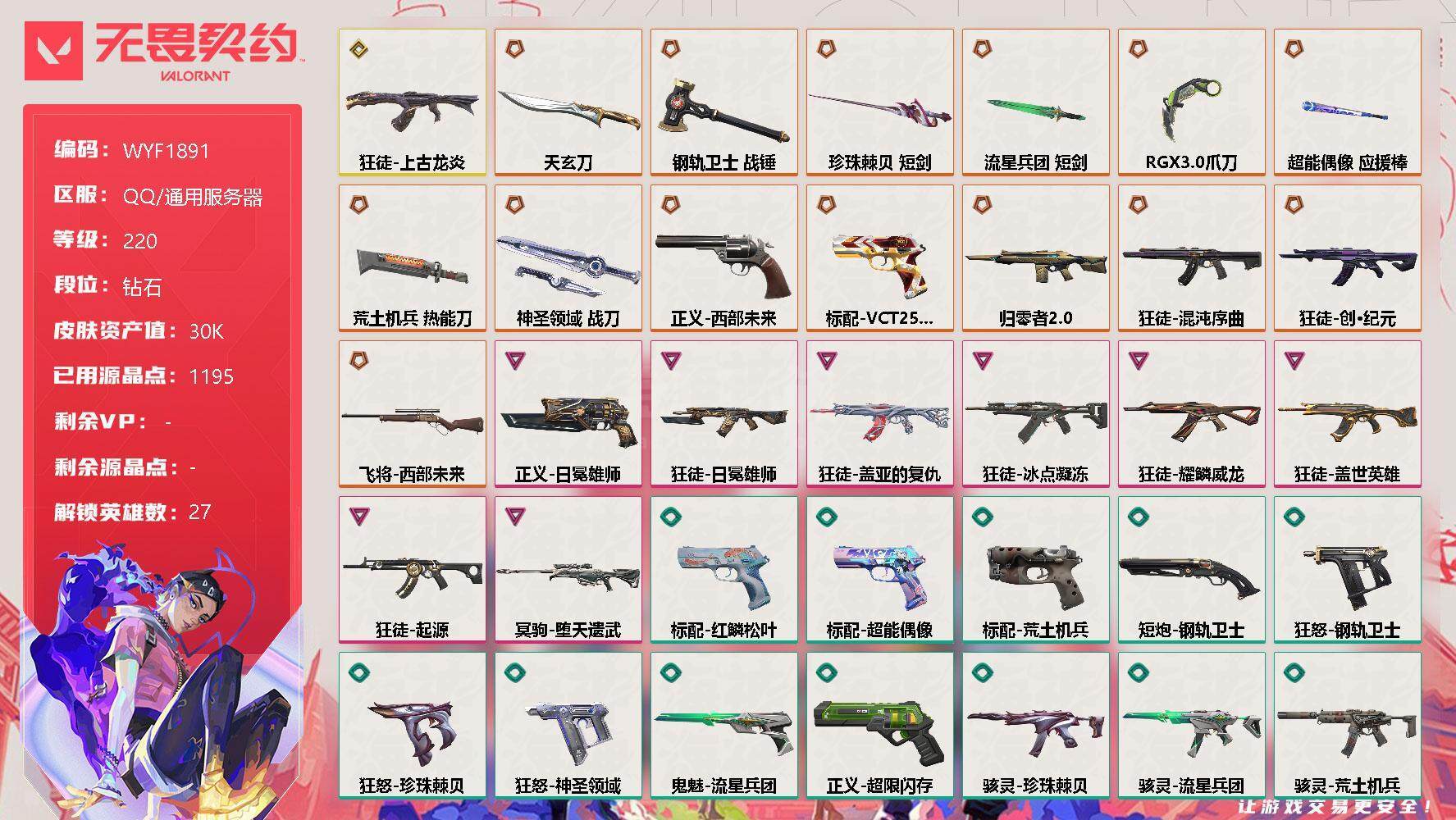终极*14/传奇*1/卓越*8/皮肤*103/等级*220/段位:钻石/幻棱/炼狱/维斯/暮蝶/钛狐