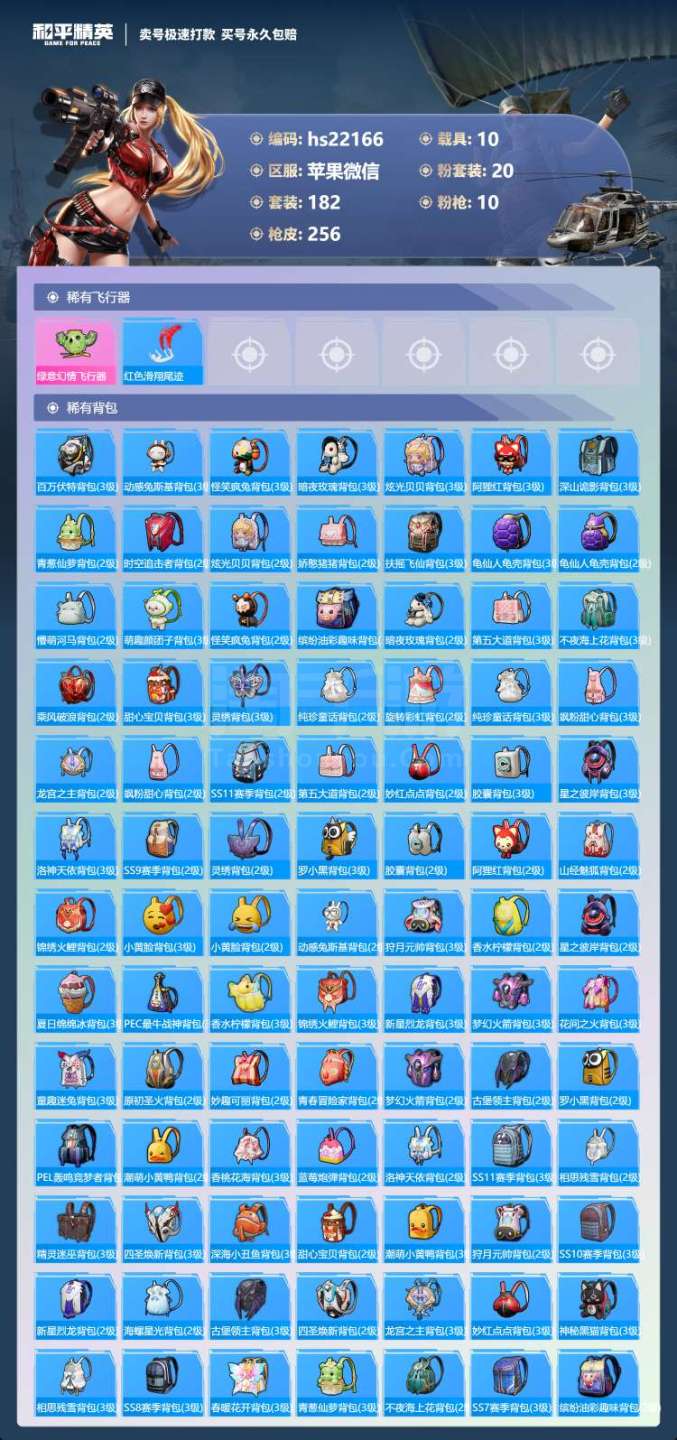 hs22166苹果微-19王牌印记-20粉装-10特效枪-10载具-104193热力值-182套装