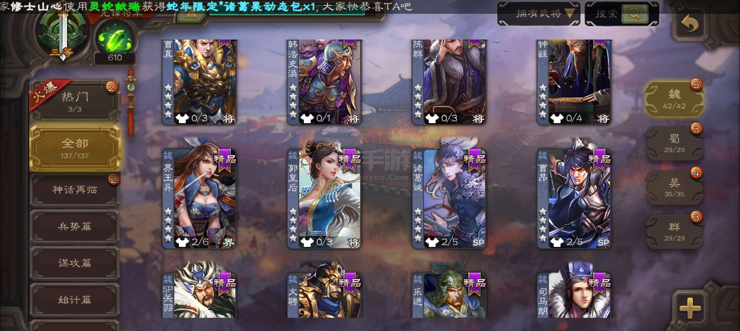 先锋将军,4.6万羽毛,戏志才王平杨修3史诗,神吕蒙神周瑜谋韩当谋高顺崔琰界荀彧张布137将