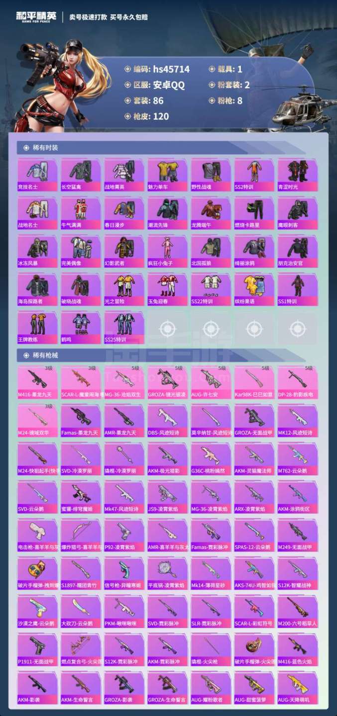 hs45714 安卓手Q-1王牌印记-2粉装-8特效枪-1载具-40415热力值-86套装-120枪