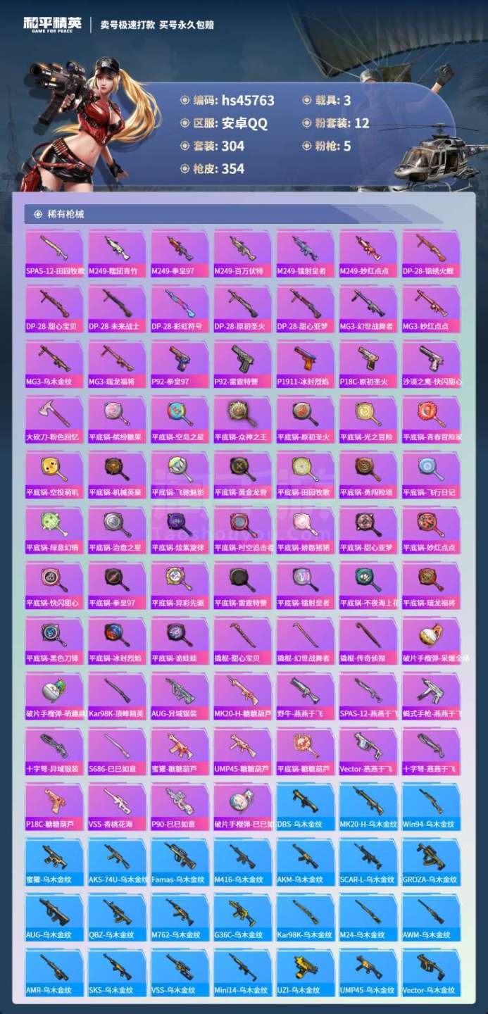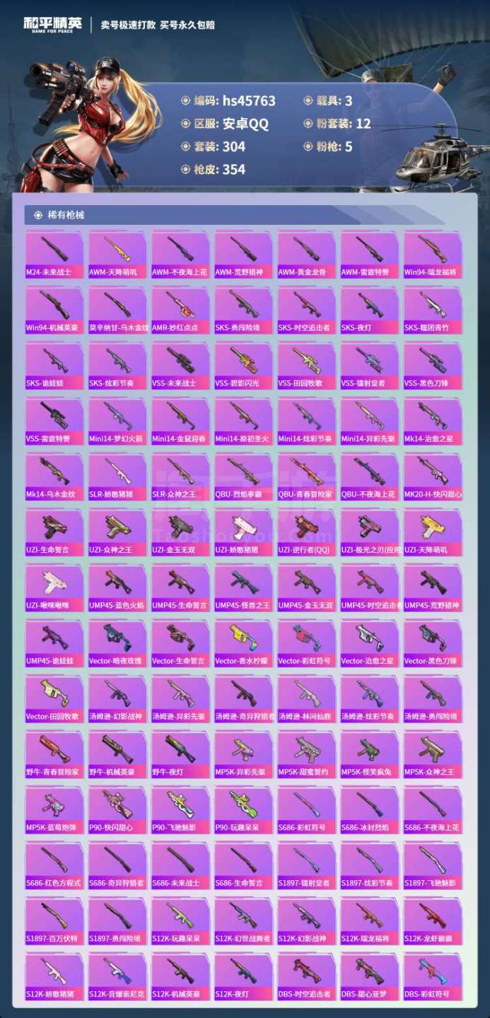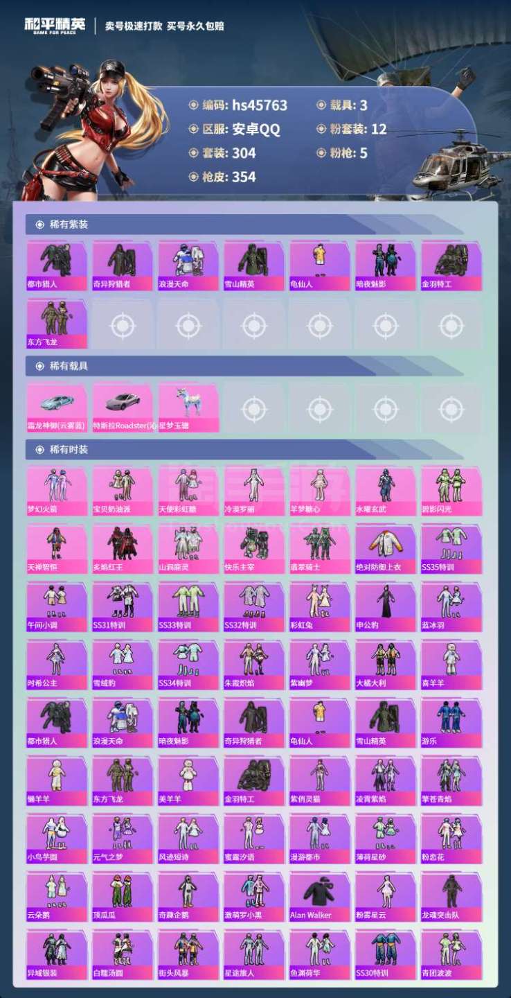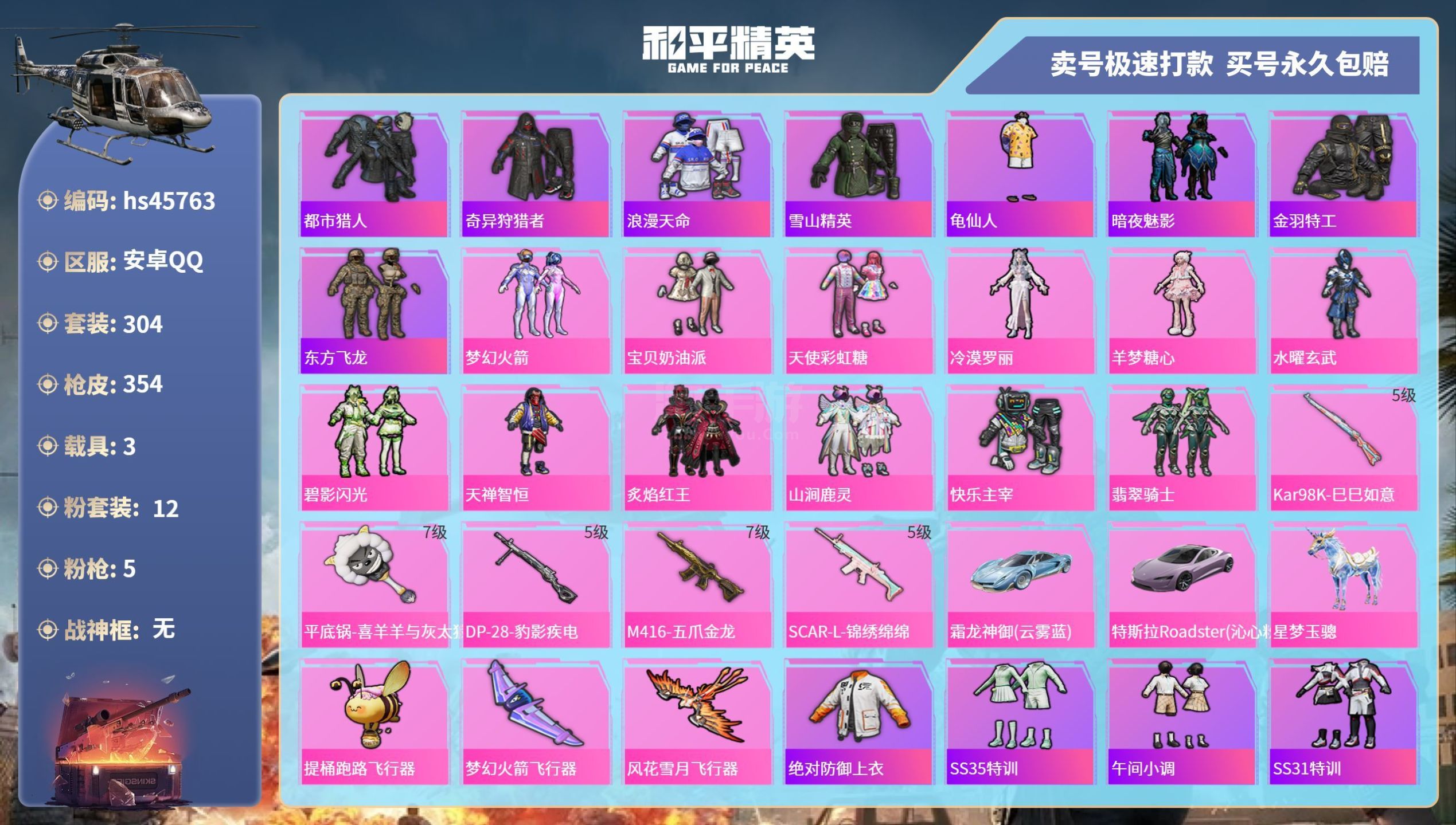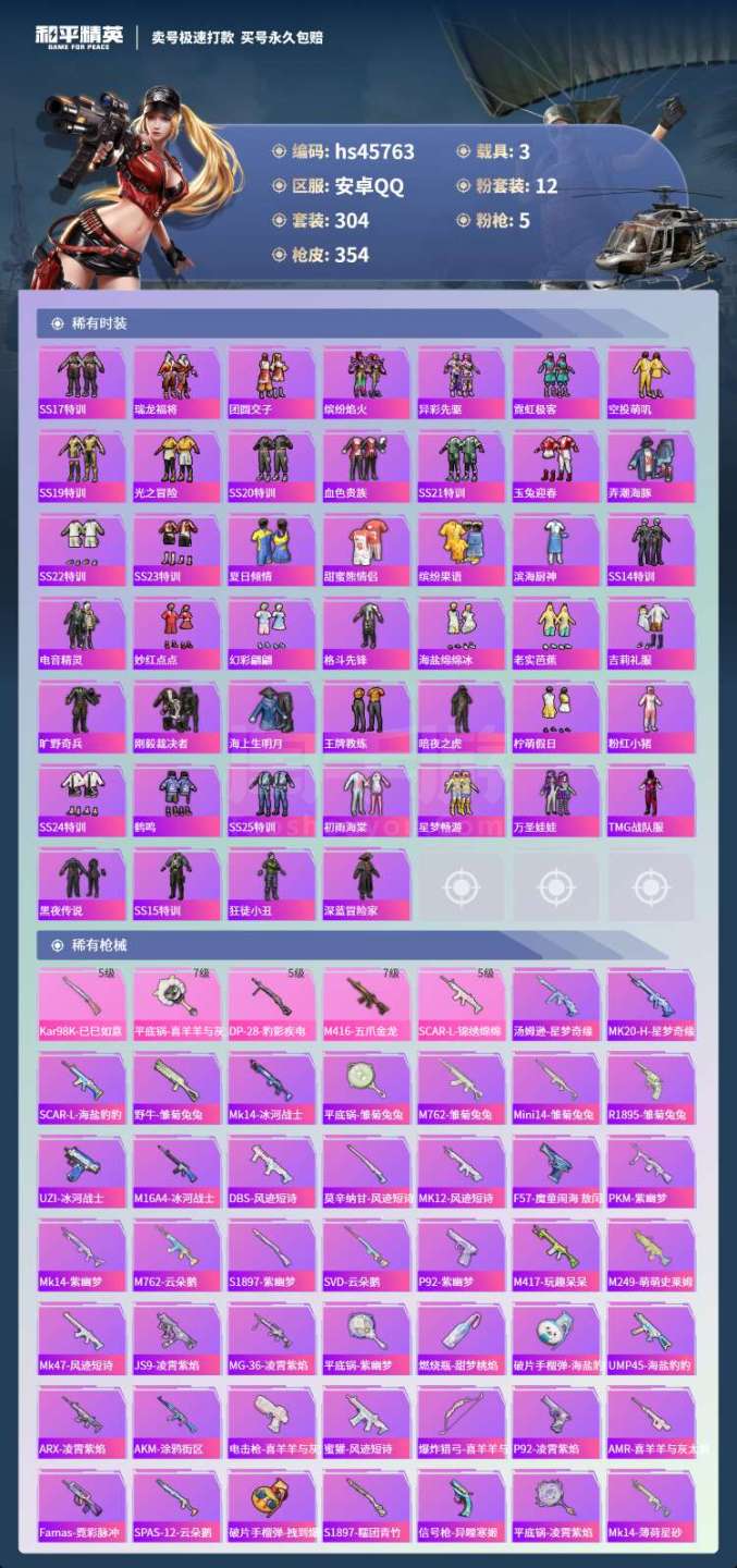 hs45763 安卓手Q-28王牌印记-12粉装-5特效枪-3载具-115118热力值-304套装-
