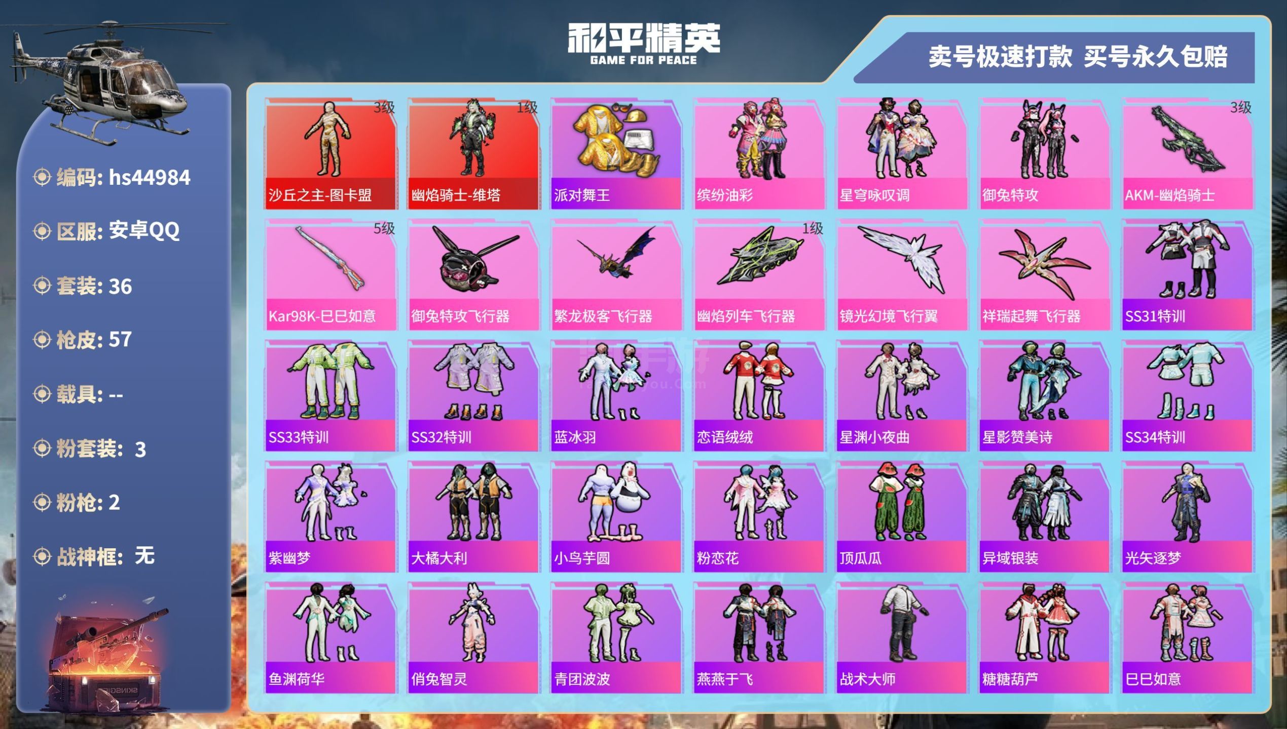 hs44984 安卓手Q-2王牌印记-3粉装-2特效枪-0载具-22819热力值-36套装-57枪皮
