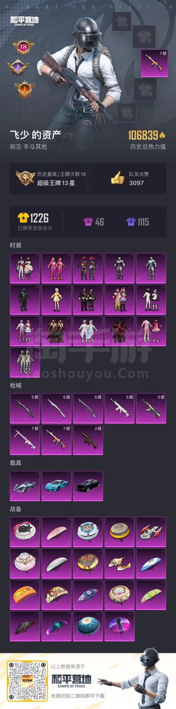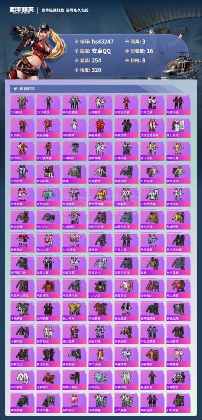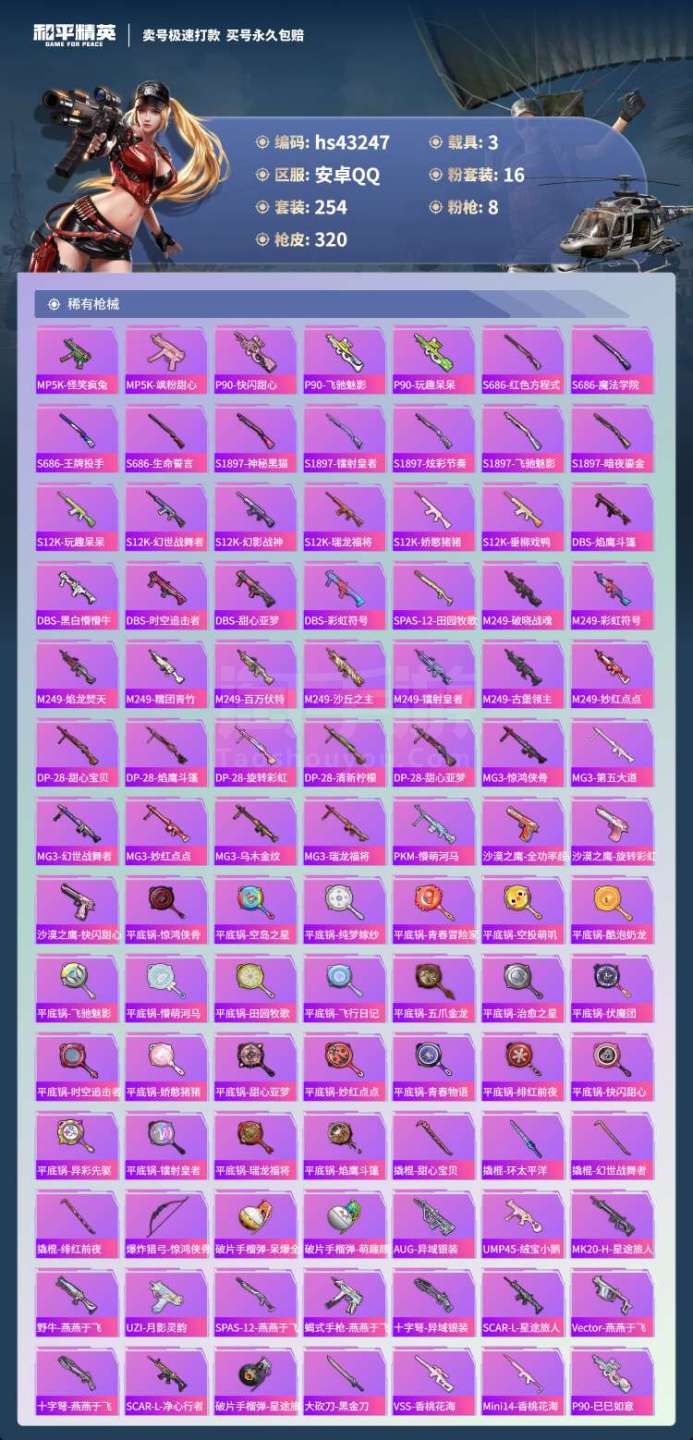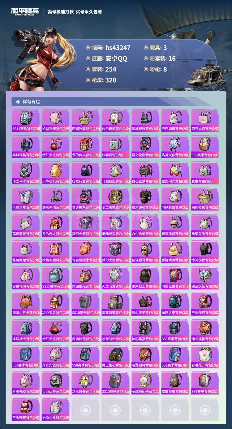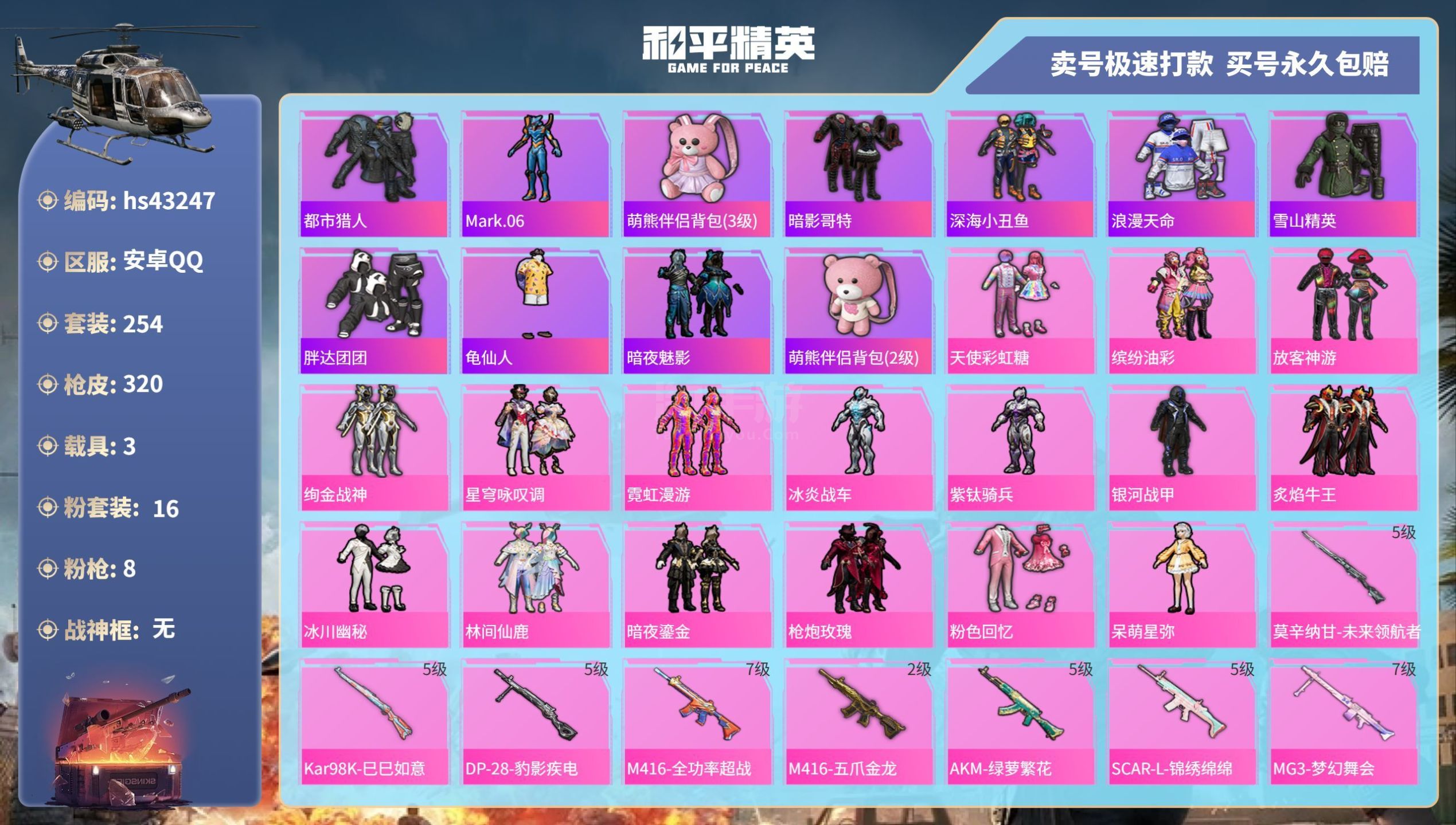 hs43247 安卓手Q-18王牌印记-16粉装-8特效枪-3载具-106839热力值-254套装-