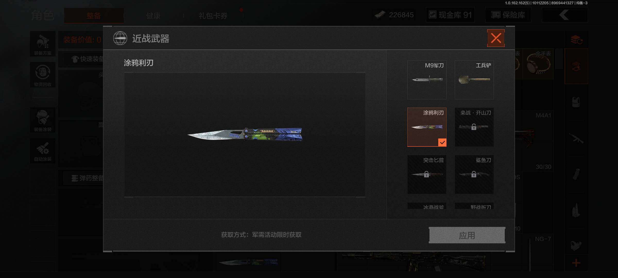 安卓QQ,1把手感不错的刀皮,7把金枪,1个金衣,仓库价值1.9M,科恩币226845【勾选了部分装备-详情看图-】