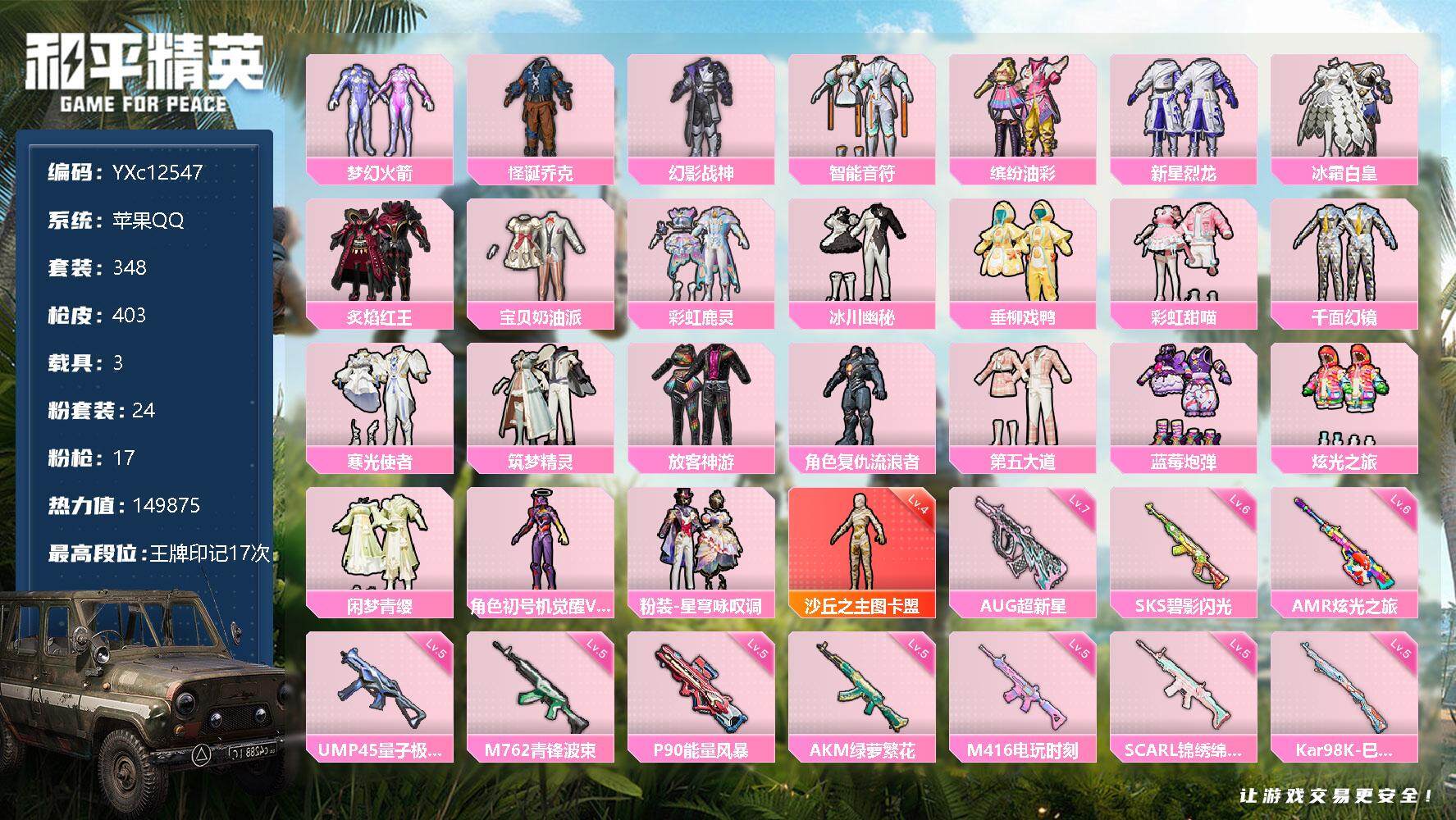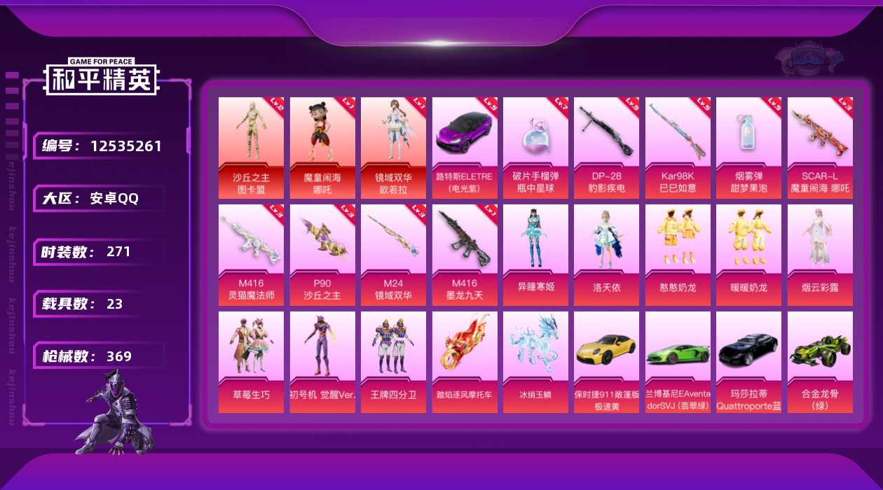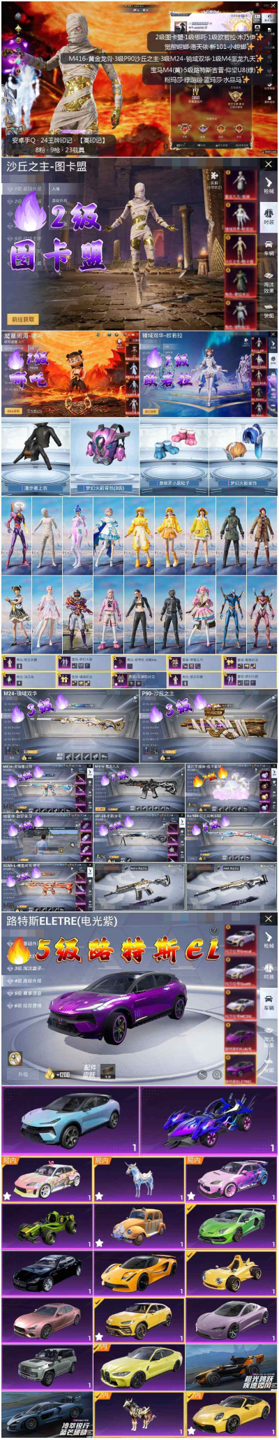 /绝世印记7【特价急出/详情看图】:安卓 手Q-3神装-9粉装-9特效枪-23载具-7粉色飞行器-14w热力值-24王牌印记-271套装-369枪皮【红色载具】:路特斯ELETRE(电光紫)(五级)【红色神装等级】:魔童闹海-哪吒(一级),镜域双华-欧若拉(一级),沙丘之主-图卡
