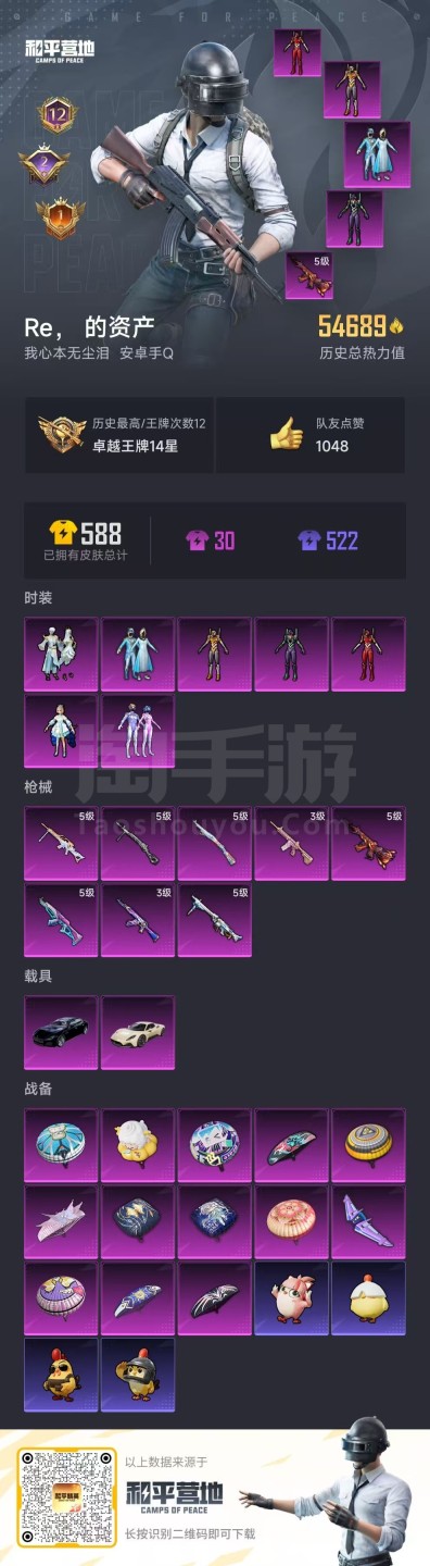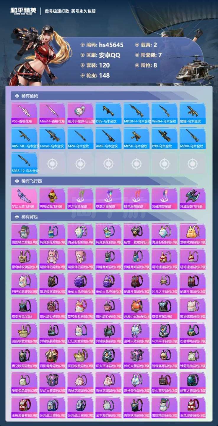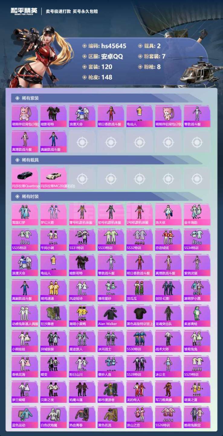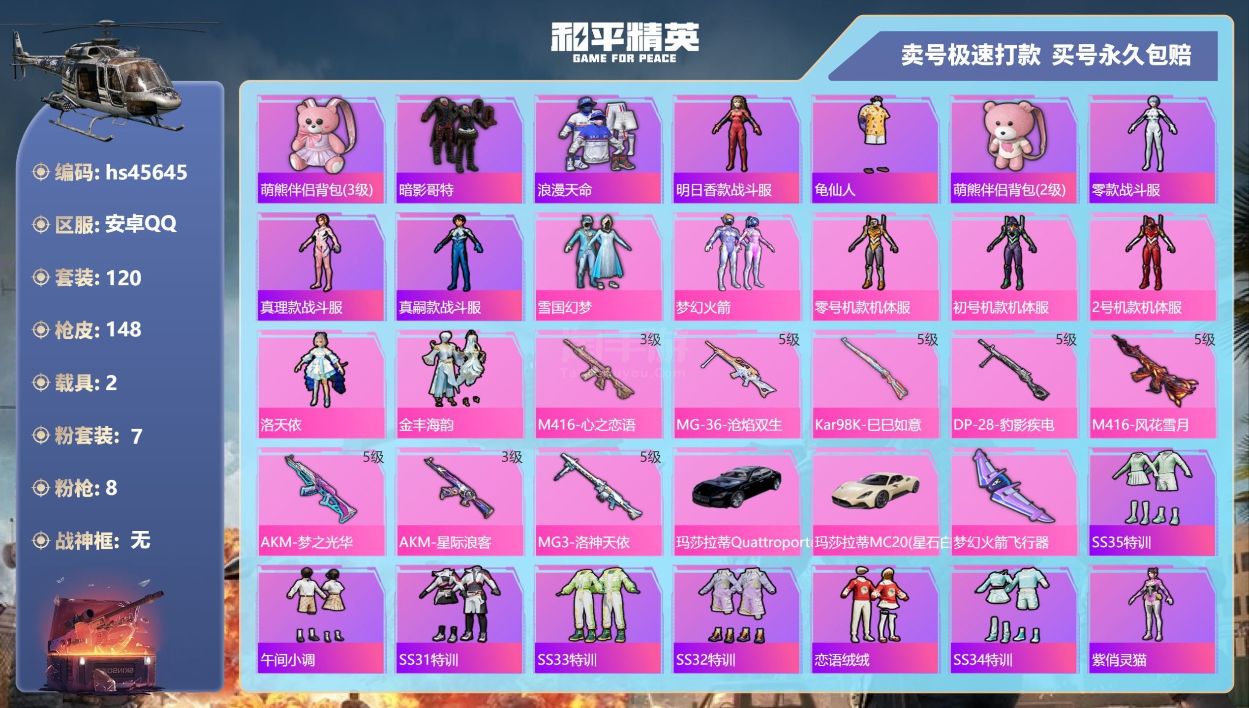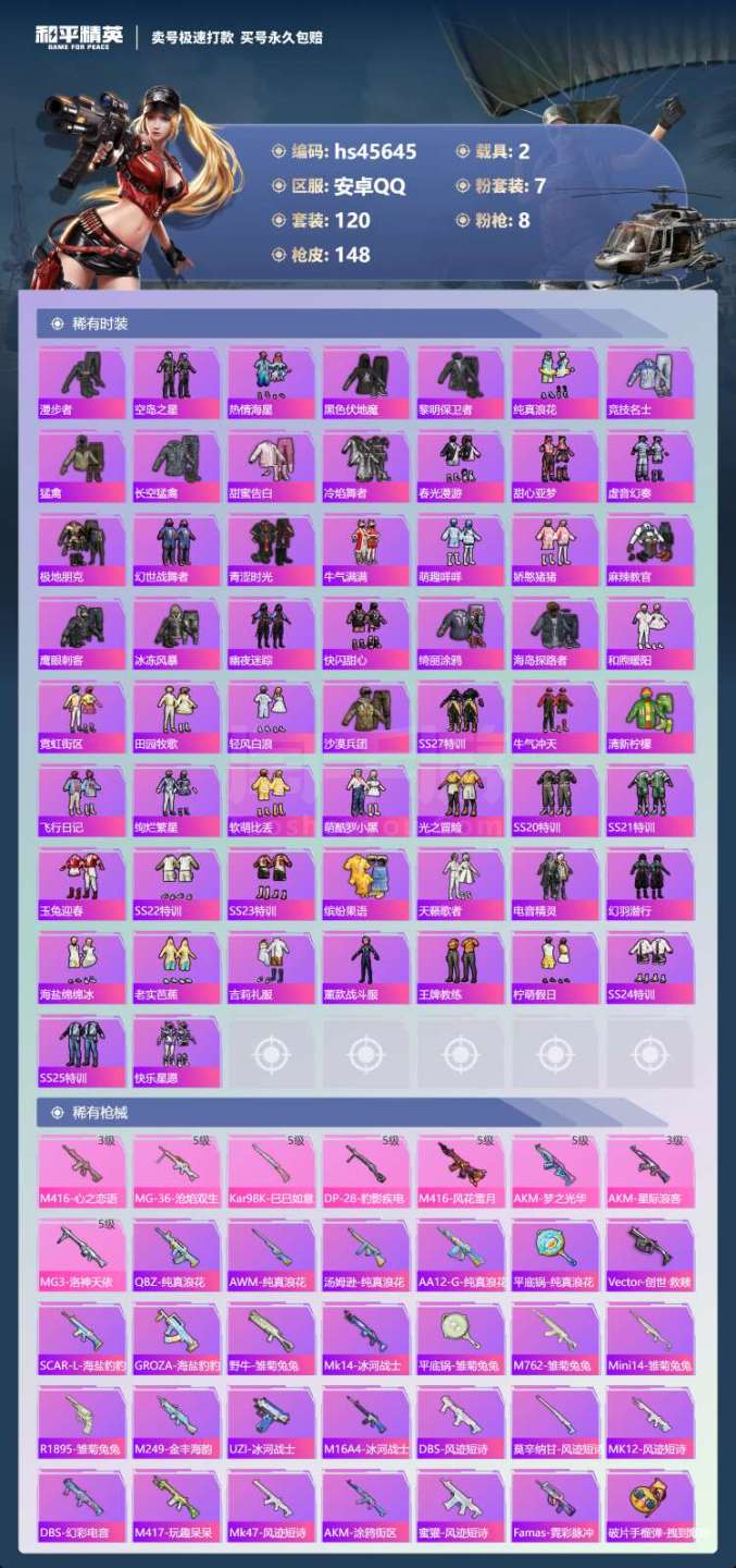 和平精英【安卓QQ】hs45645 安卓手Q-12王牌印记-7粉装-8特效枪-2载具-54689热力值-120套装-14