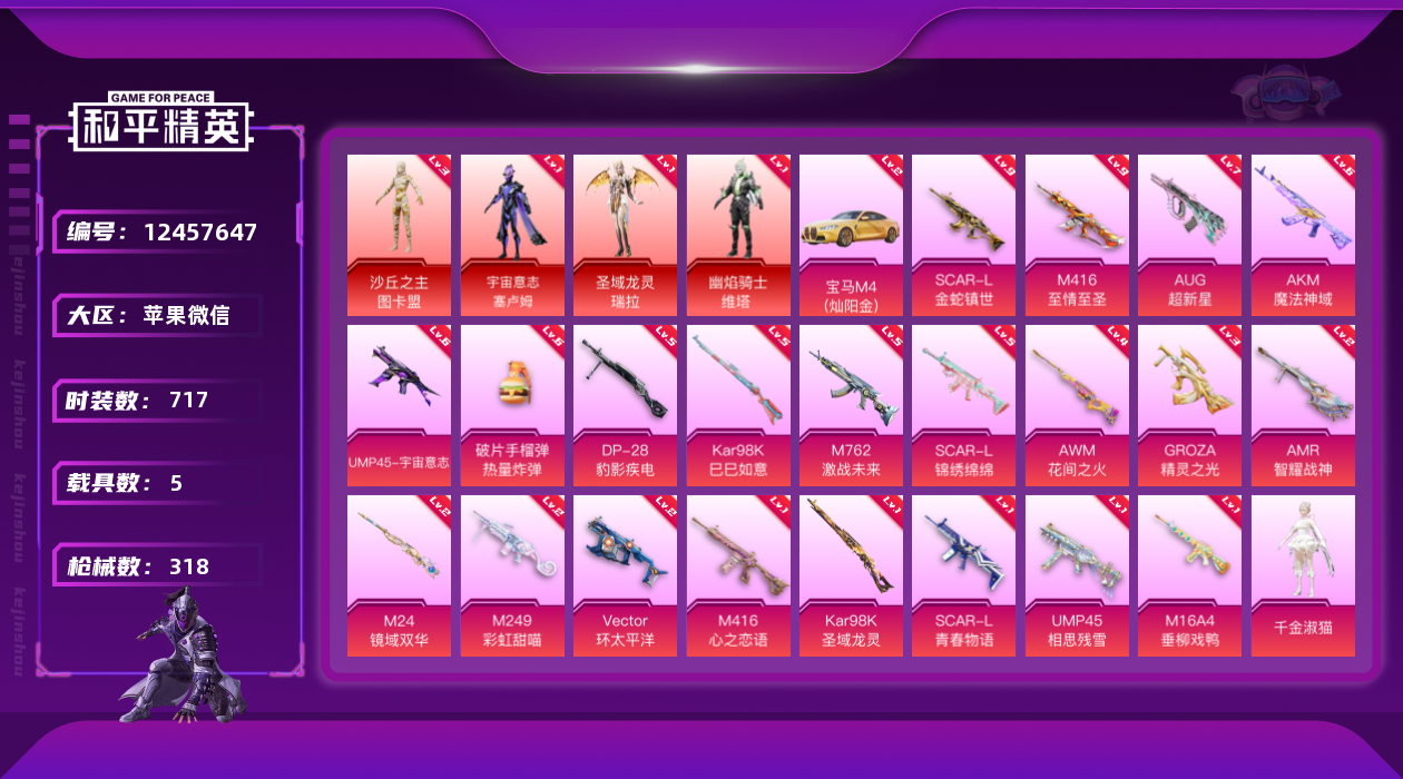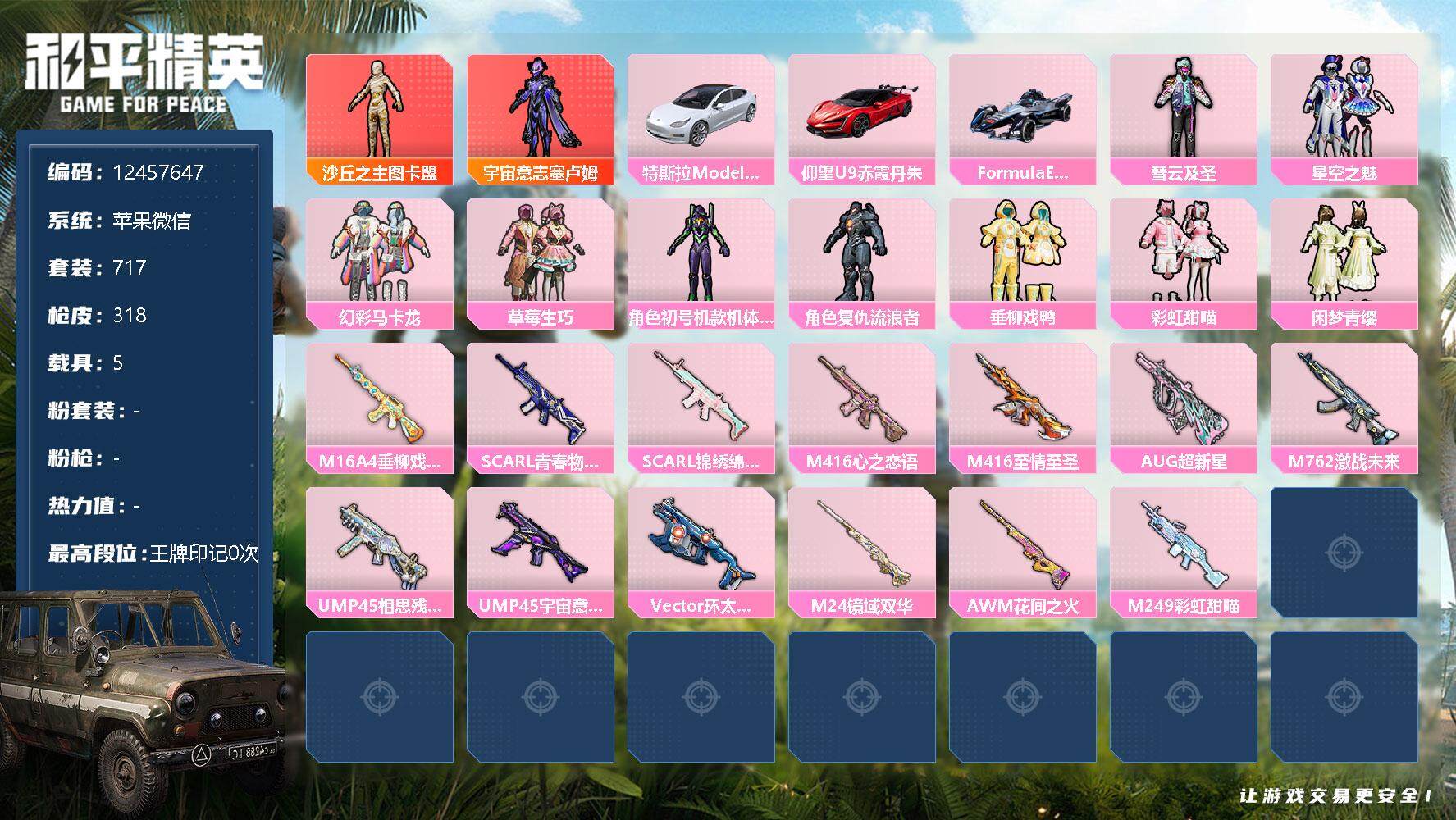 和平精英【苹果微信】【12457647】[12457647]实名: 可修改 时装数: 717 载具