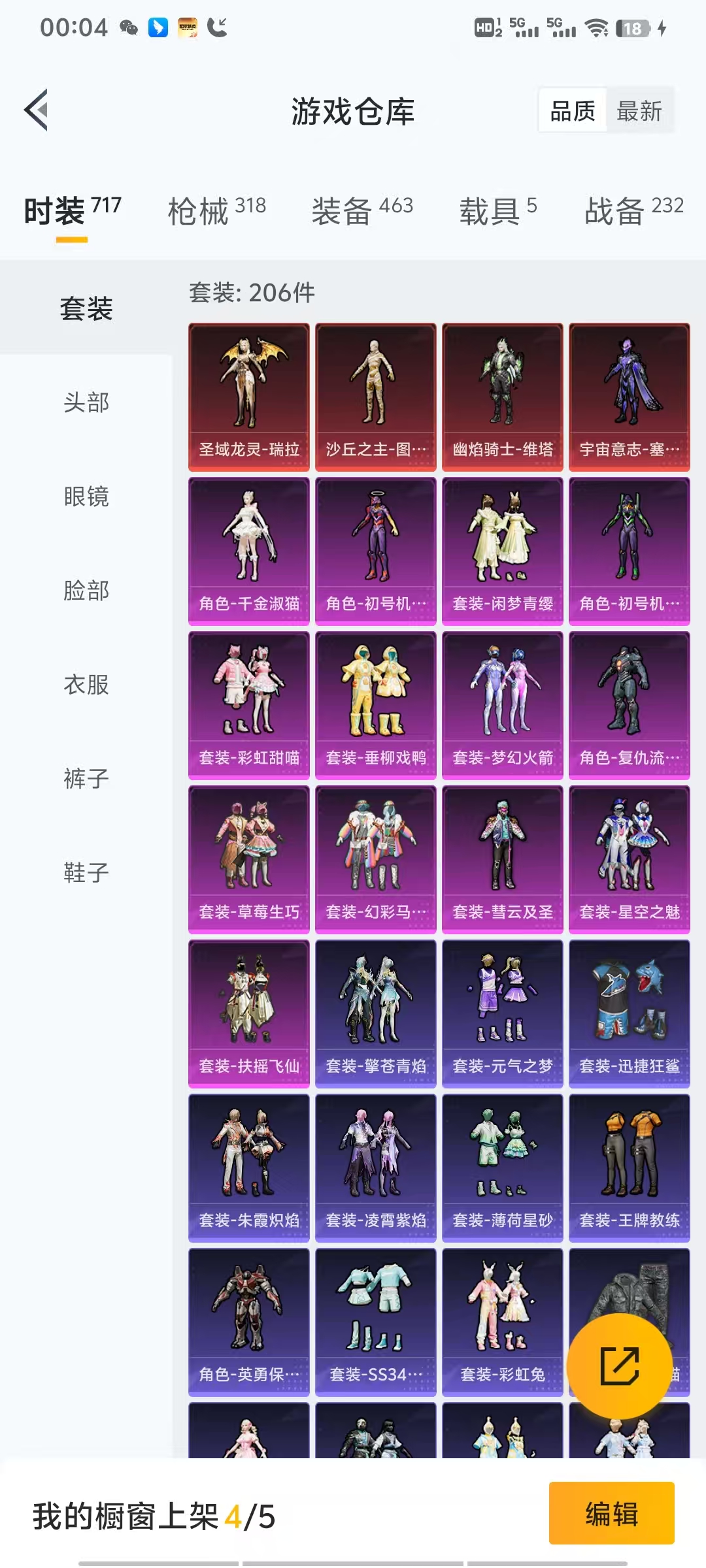 【12457647】[12457647]实名: 可修改 时装数: 717 载具数: 5 枪械数: 318 战备数: 232 神级装扮: 沙丘之主-图卡盟,宇宙意志-塞卢姆,幽焰骑士-维塔 ,圣域龙灵-瑞拉 热门装扮: 奇异狩猎者,梦幻火箭(新101),呆萌铁蟹,万圣娃娃,迅捷狂鲨,幻彩马卡龙,彗云及圣,草莓生巧,扶摇飞仙,星空之魅,初号机款机体服,复仇流浪者,垂柳戏鸭,彩虹甜喵,浪客战士,闲梦青
