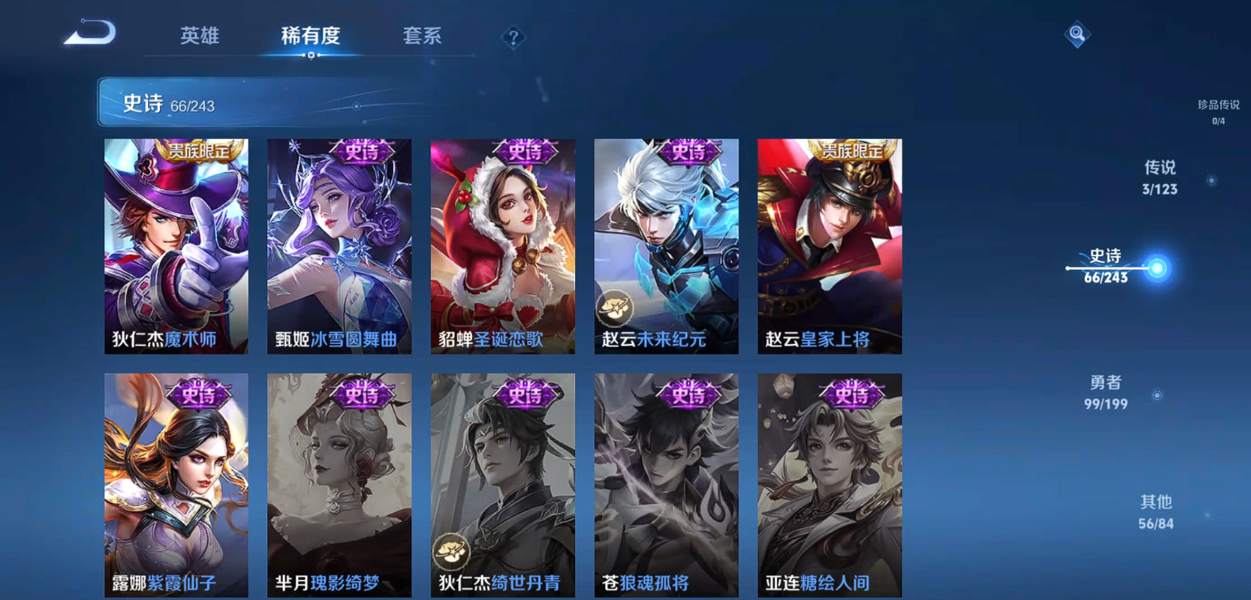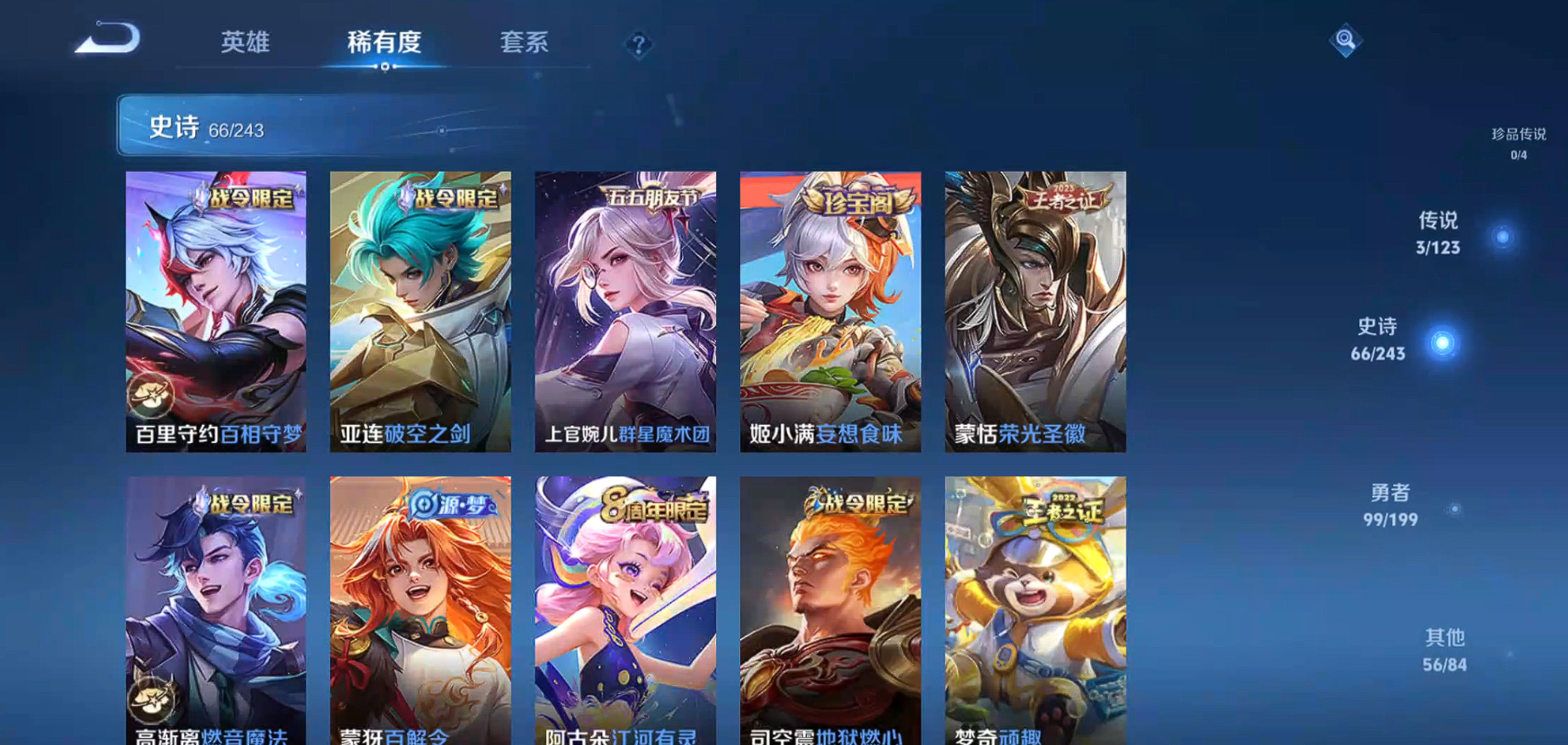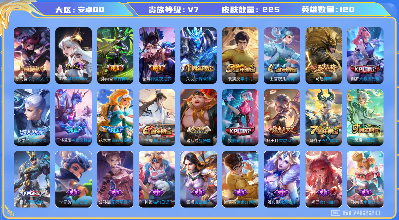 营地账号:405883490/[6174220]13印记 1典藏 1星传说 3传说 73限定 实名: 可修改 性别: 女号 贵族等级: V7 英雄数: 120 皮肤数: 225 荣耀水晶: 杀手不太冷 星传说: 金色仲夏夜 皮肤: 末日机甲-孙尚香,仲夏夜之梦 冰锋战神,李小龙,梁祝,天狼溯光者,神威,青春决赛季,冰霜恋舞曲,默契交锋-花木兰,高山流水,猪悟能,匿光追影者,寅虎·心曲,五谷丰年