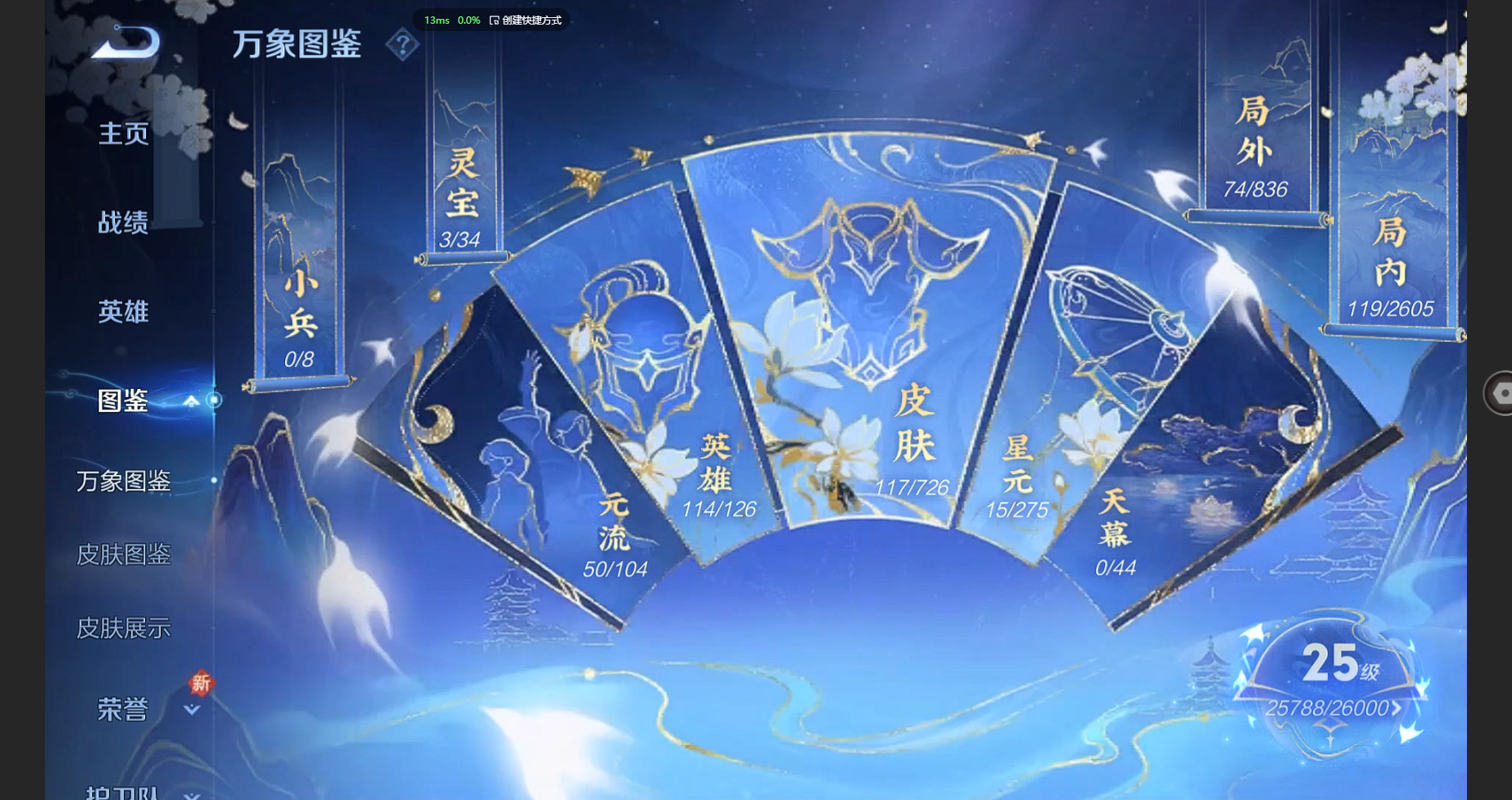 营地账号:1750363468/[10671607]实名: 可修改 贵族等级: V4 英雄数: 114 皮肤数: 117 传说皮: 妄想实况,幻光神枪 限定皮: 五谷丰年,鸣野蒿,逐霄战戟