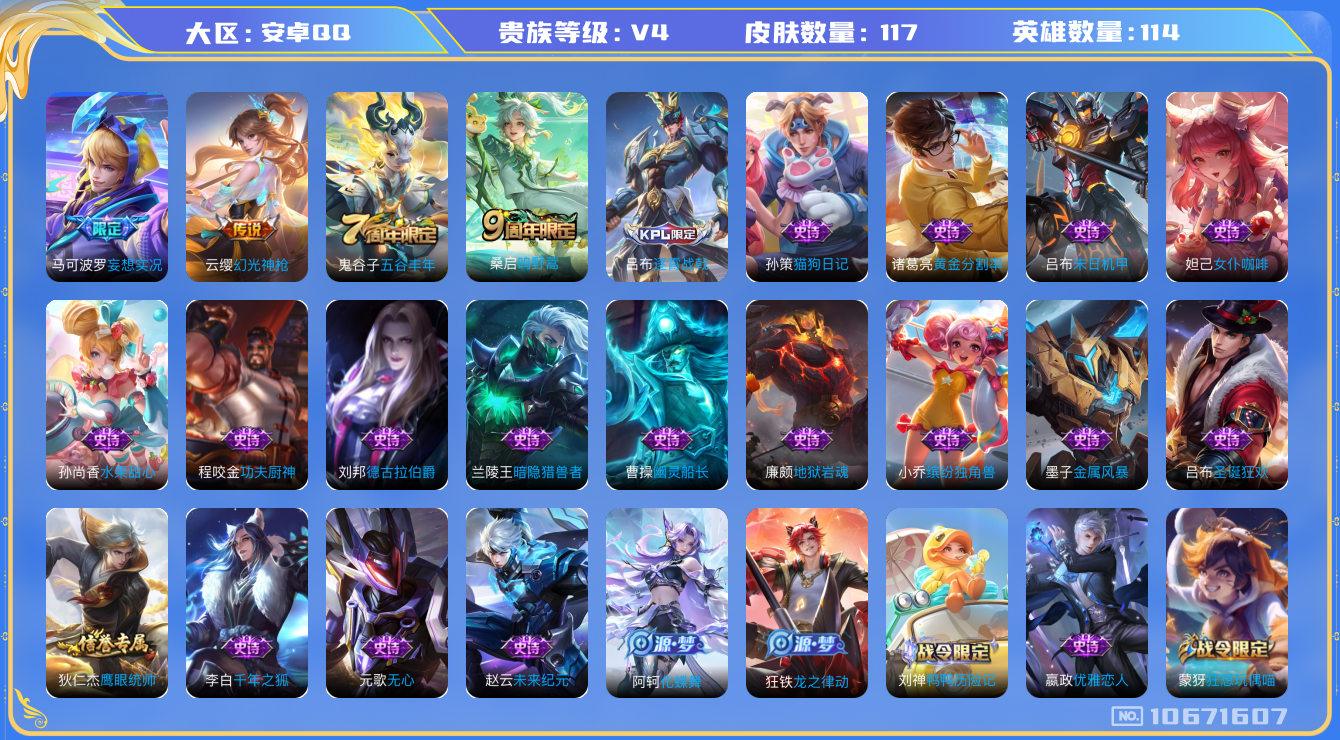 [10671607]实名: 可修改 贵族等级: V4 英雄数: 114 皮肤数