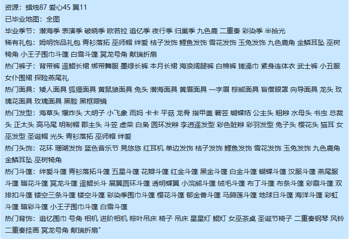 稀有礼包:姆明饰品礼包 青衫落拓 巫师帽 绊爱 桔子发饰 鲤鱼发饰 雪花发饰 玉兔发饰 九色鹿角 金鳞