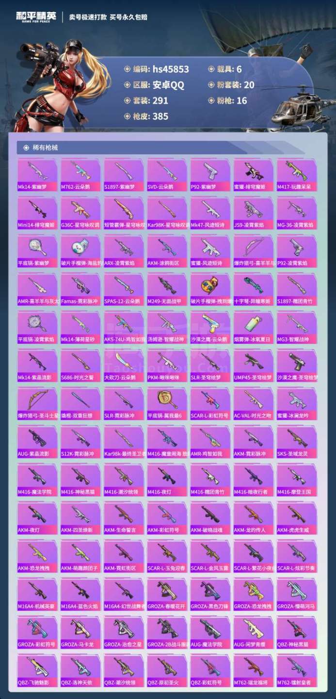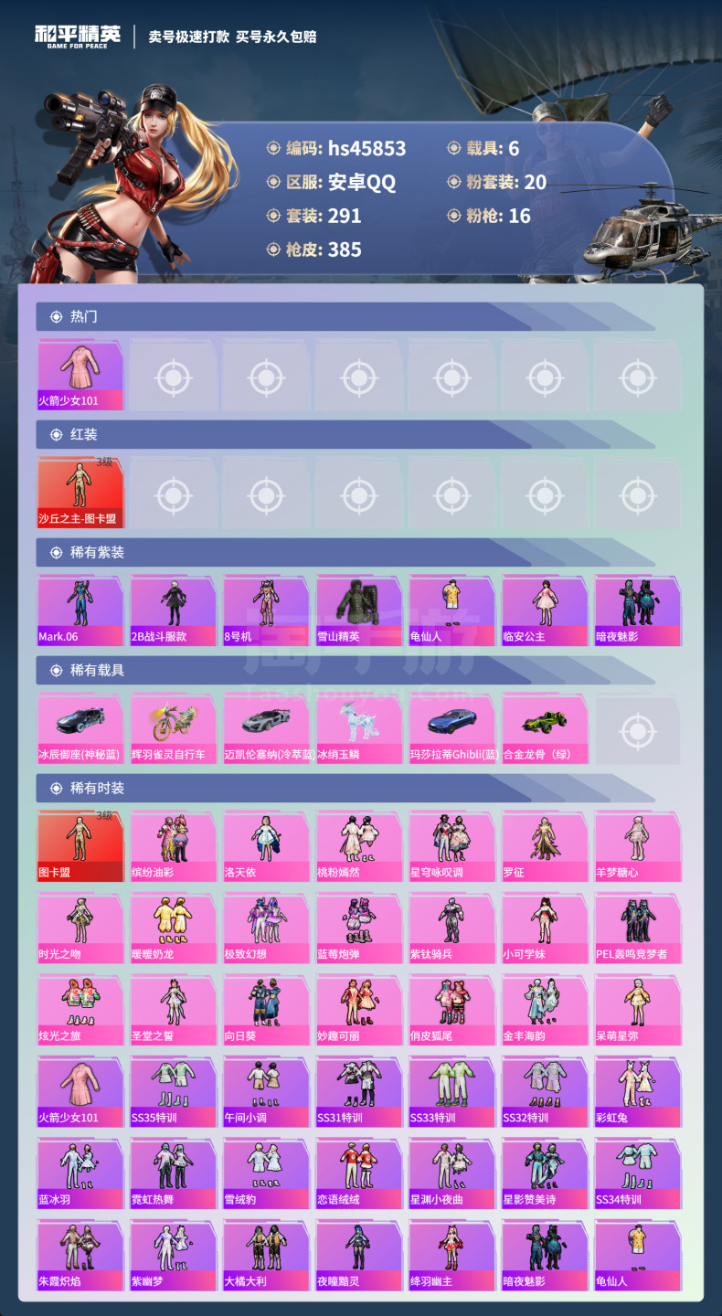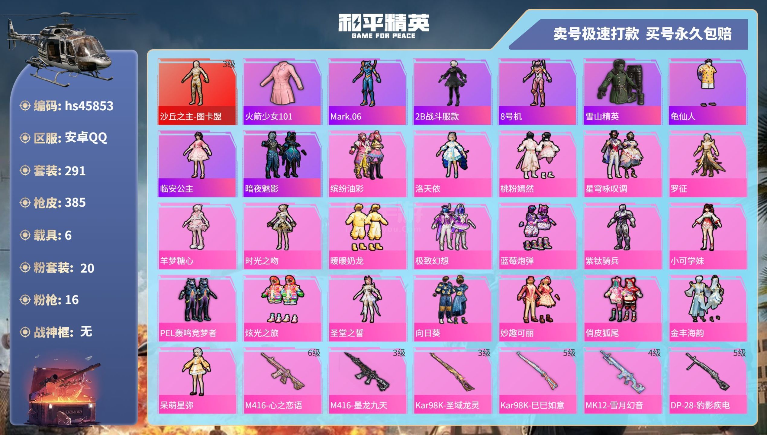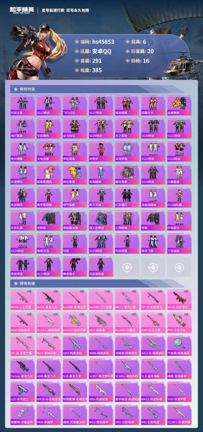 hs45853 安卓手Q-19王牌印记-20粉装-16特效枪-6载具-146320热力值-291套装