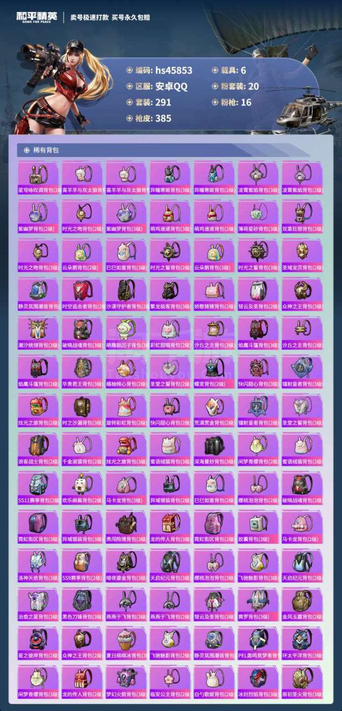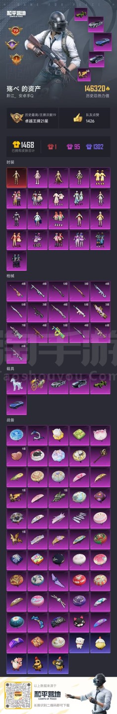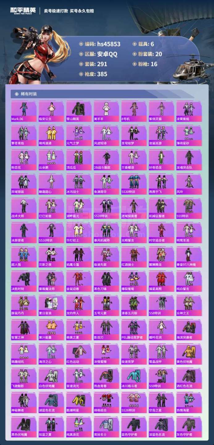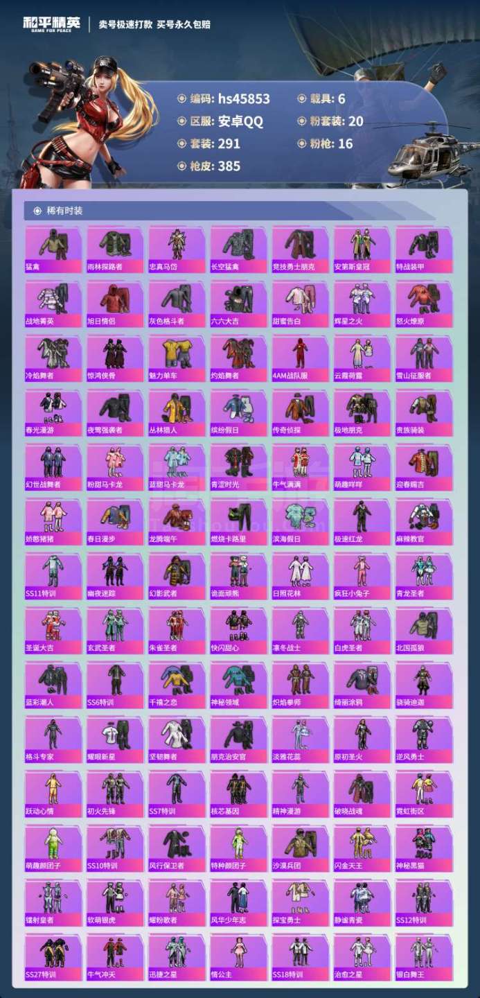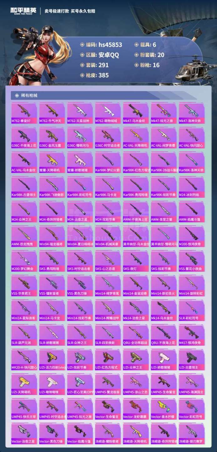 hs45853 安卓手Q-19王牌印记-20粉装-16特效枪-6载具-146320热力值-291套装