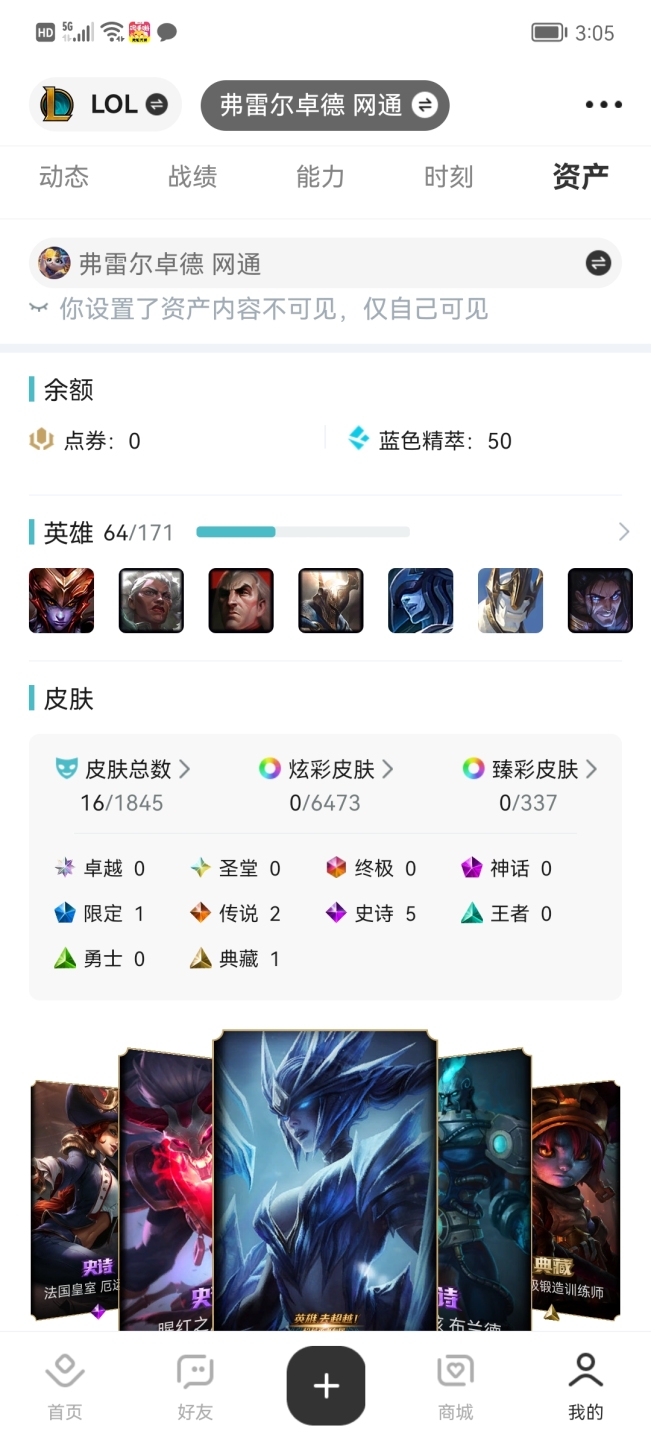 弗雷尔卓德排位练手小号,64英雄16皮肤